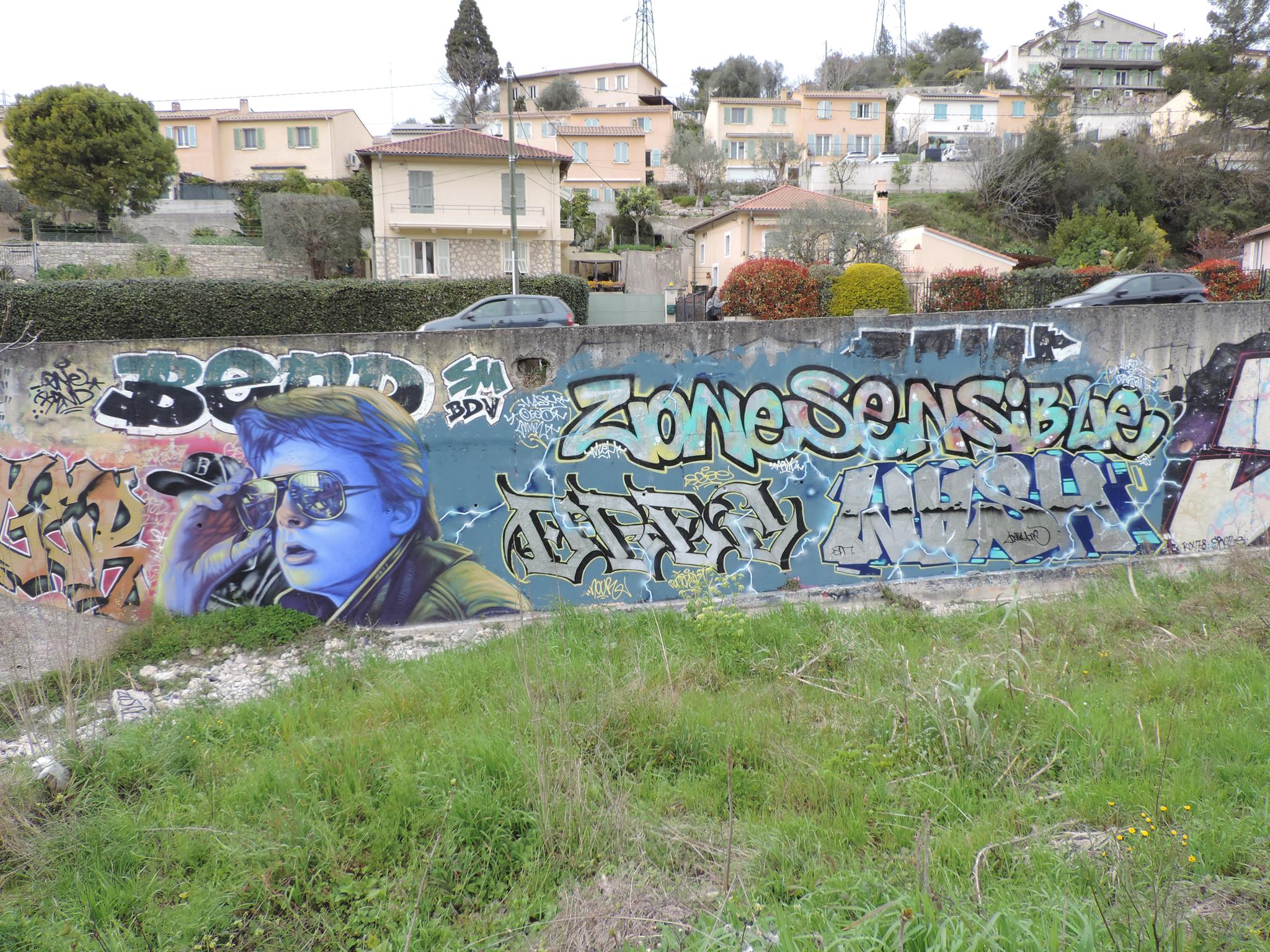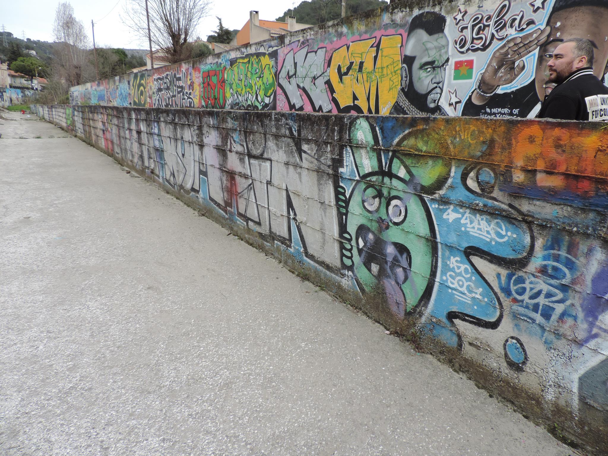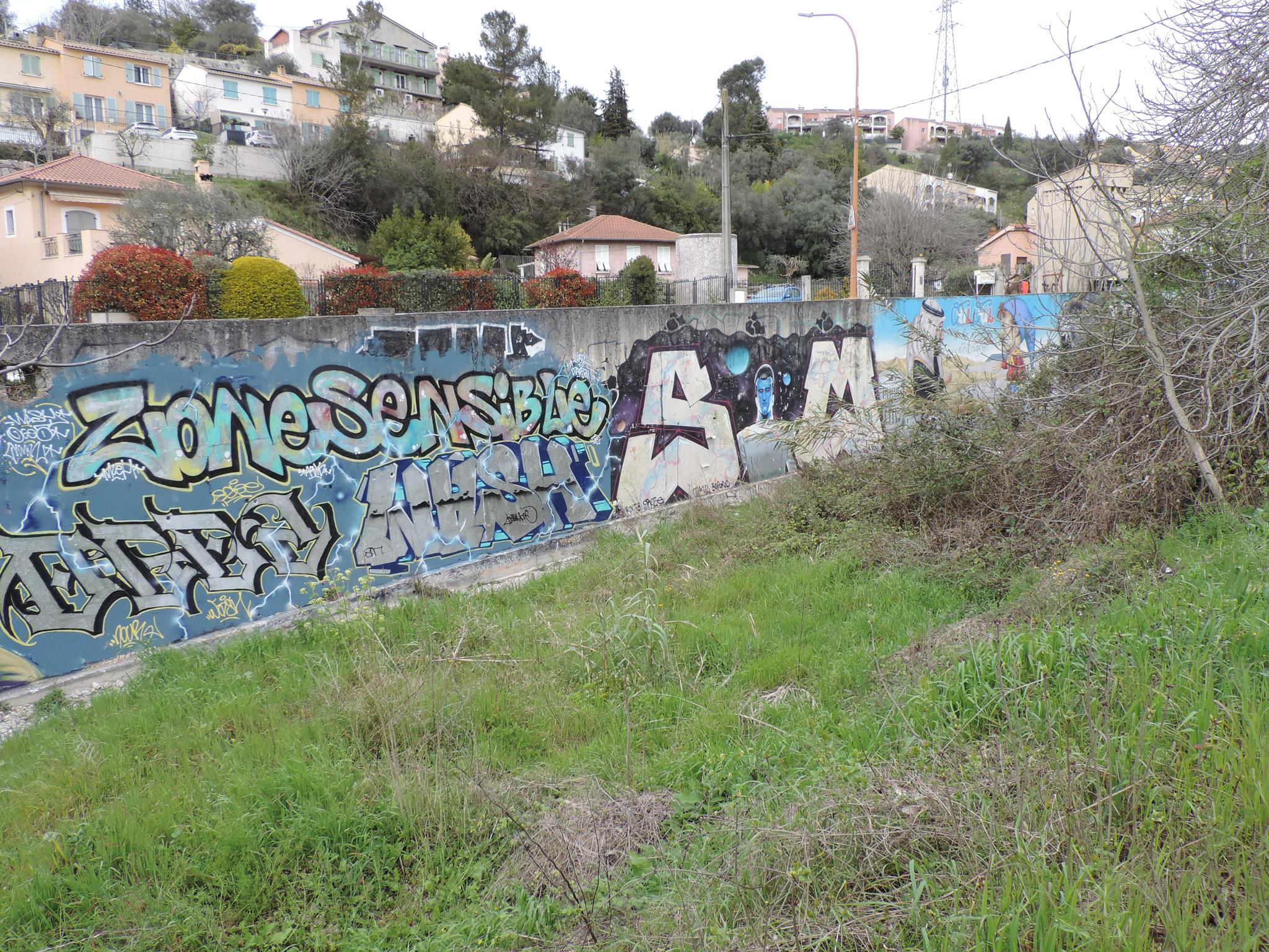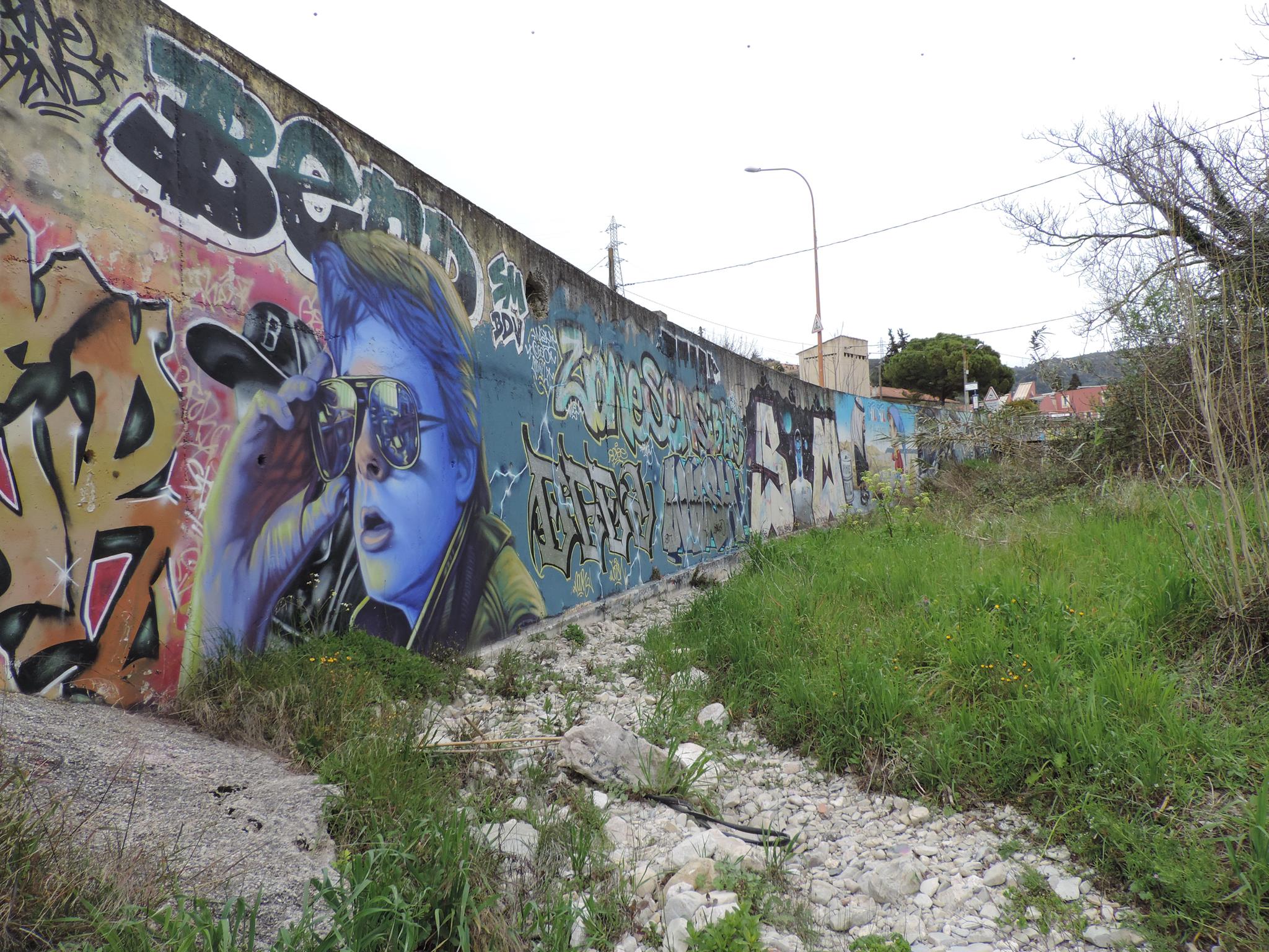 Running parallel between Boulevard François Suárez and Impasse Fuon Santa is the canal of the Vallon de Laghet river, which in some months carries very little or no water. The concrete channeled riverbed provides the perfect surface for graffiti and urban art and the Fuon Santa Hall of Fame has been created here over time with several really good pieces. It stretches from the bridge on Boulevard Fuon Santa in the west on both canal wall sides to the bridge at the Negron bus stop on the west part. A smaller, continuous wall in the middle of the canal, about 1 meter high, has also been sprayed. Further along the river it runs underground, and further upstream there are no concrete walls. This section is where the Vallon de Laghet goes below the town of La Trinité. It is accessible from the outside and shows a fantastic spray paradise! We have a collection of the works here; if you have any photos of this spot, send them to info@vagabundler.com and we will add them to this page.