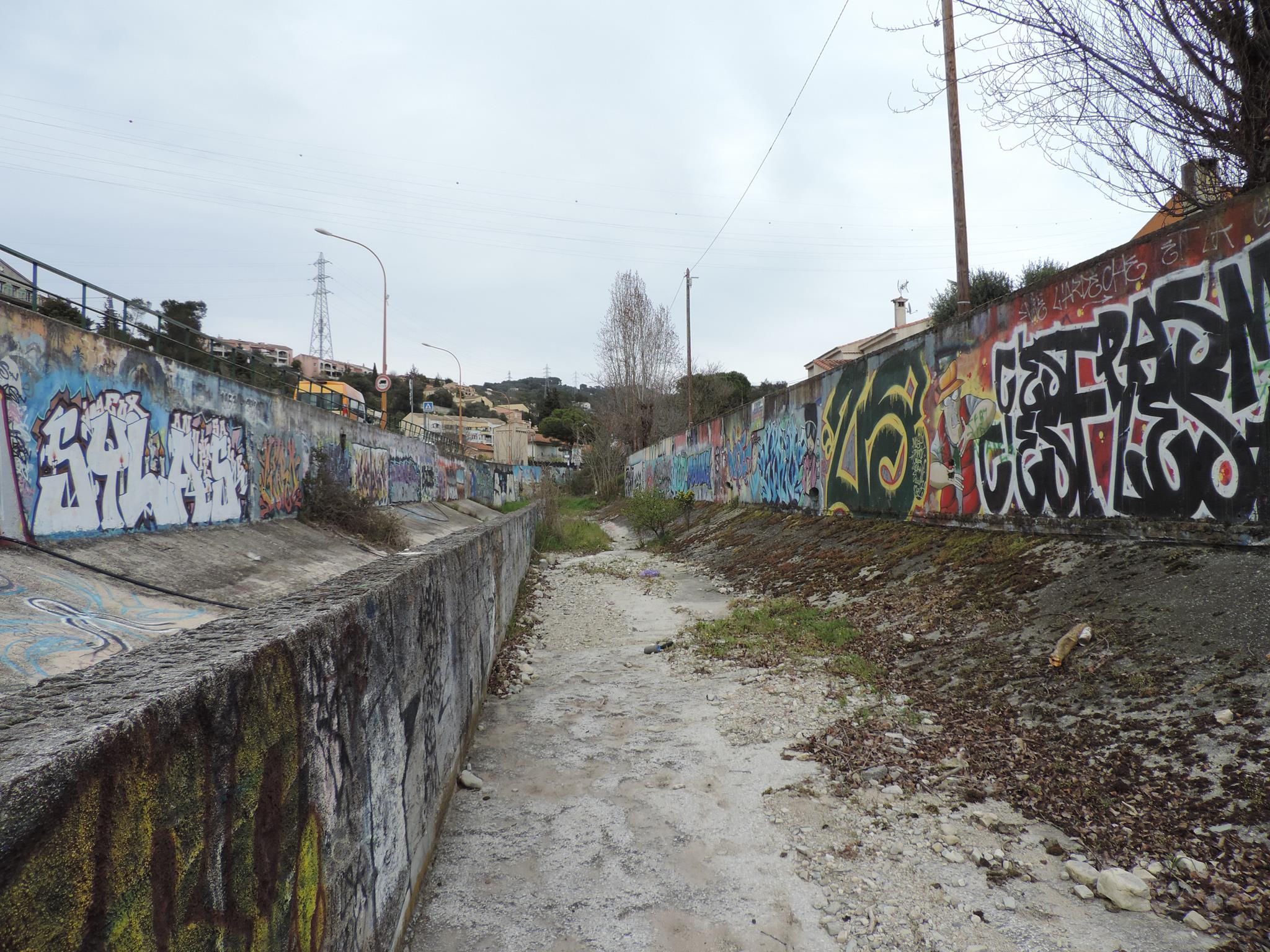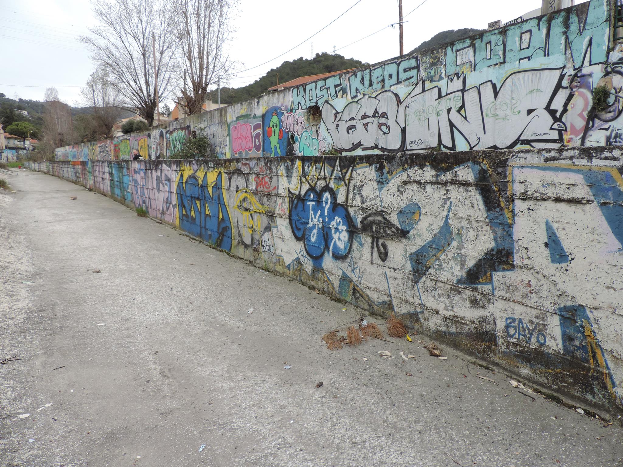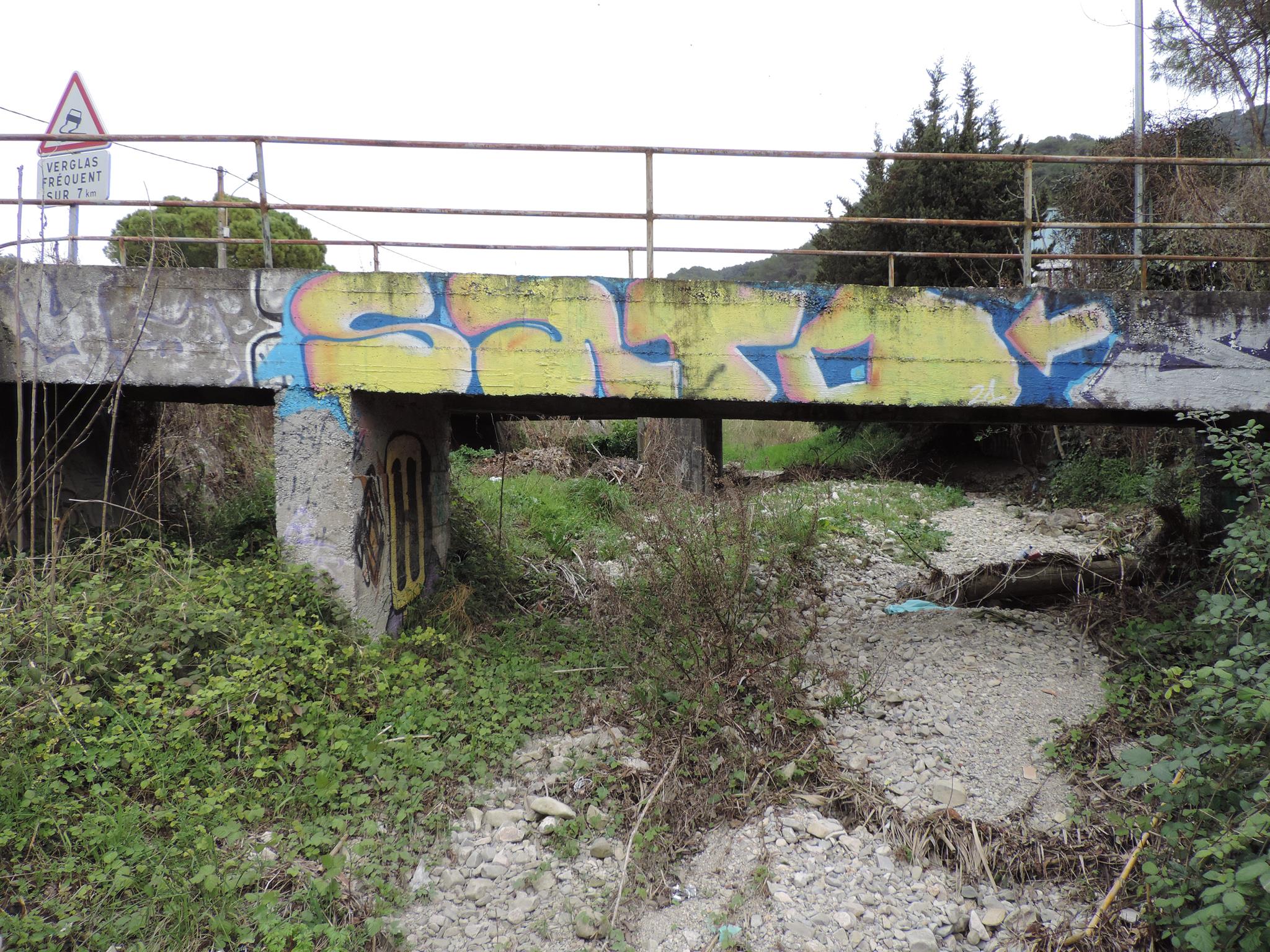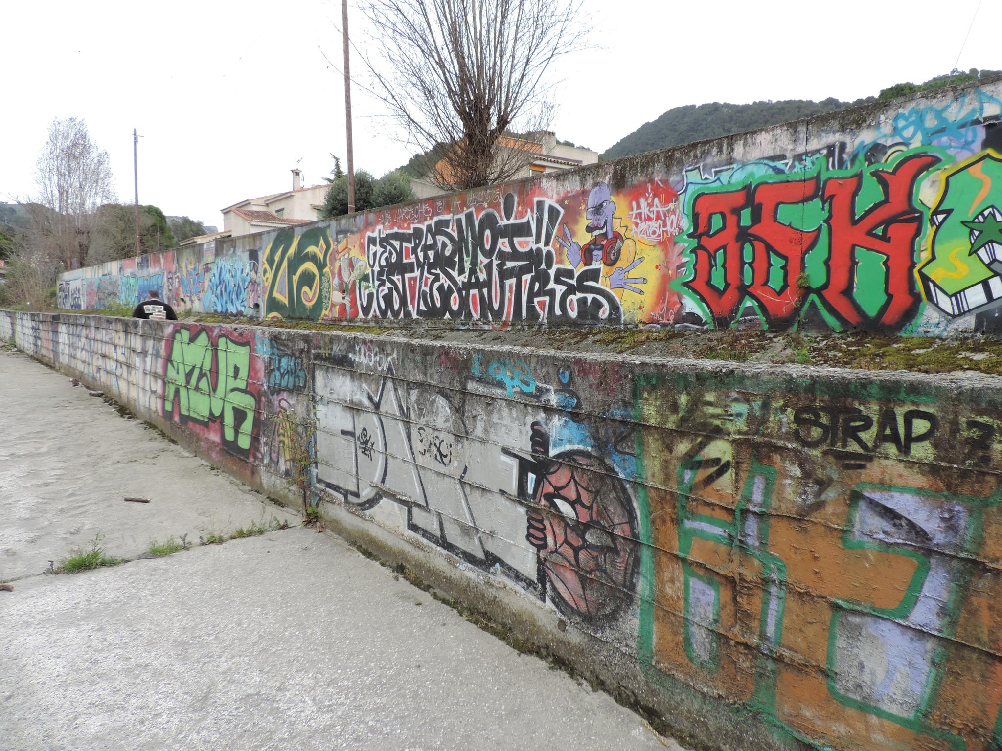 Running parallel between Boulevard François Suárez and Impasse Fuon Santa is the canal of the Vallon de Laghet river, which in some months carries very little or no water. The concrete channeled riverbed provides the perfect surface for graffiti and urban art and the Fuon Santa Hall of Fame has been created here over time with several really good pieces. It stretches from the bridge on Boulevard Fuon Santa in the west on both canal wall sides to the bridge at the Negron bus stop on the west part. A smaller, continuous wall in the middle of the canal, about 1 meter high, has also been sprayed. Further along the river it runs underground, and further upstream there are no concrete walls. This section is where the Vallon de Laghet goes below the town of La Trinité. It is accessible from the outside and shows a fantastic spray paradise! We have a collection of the works here; if you have any photos of this spot, send them to info@vagabundler.com and we will add them to this page.