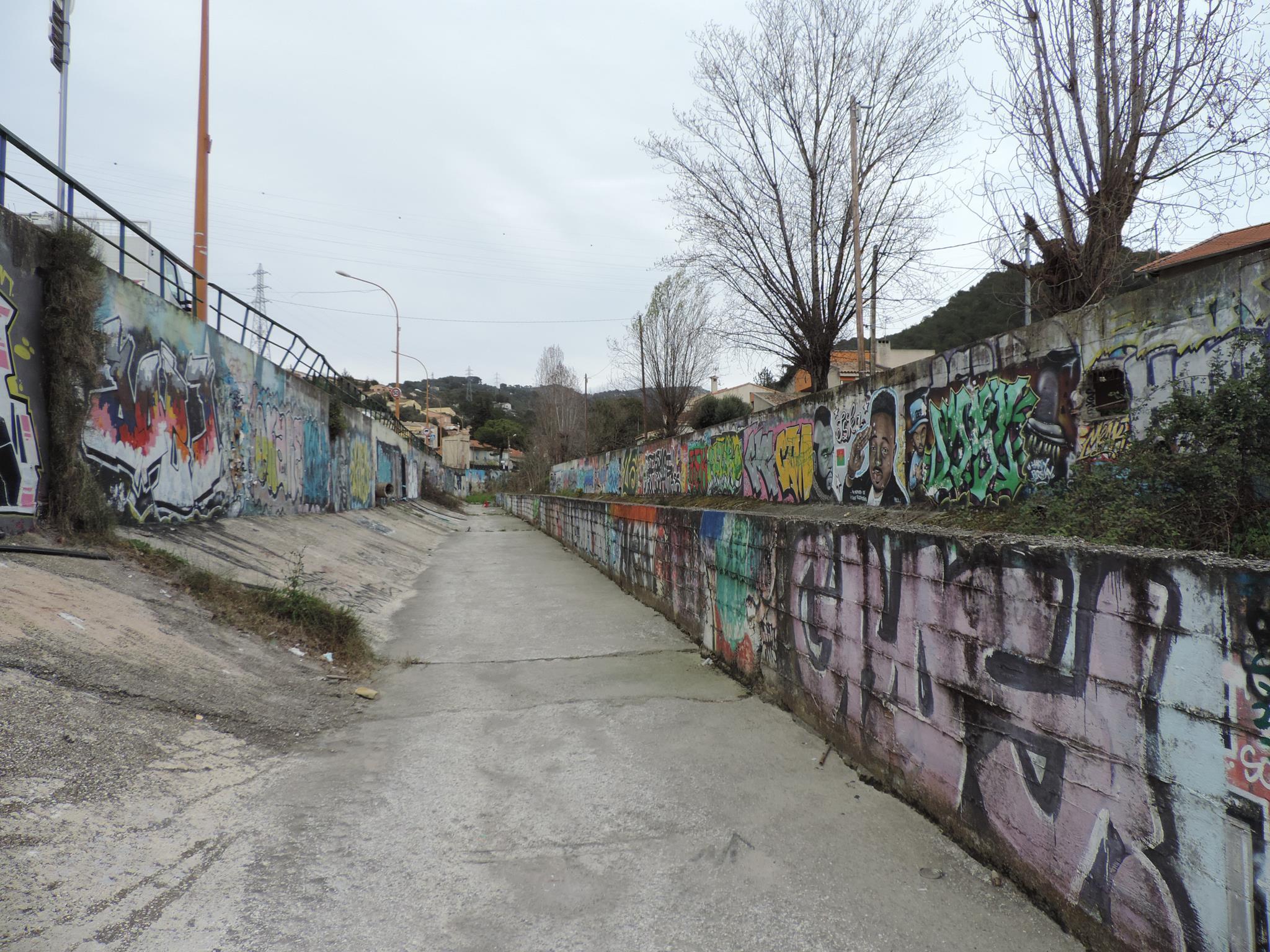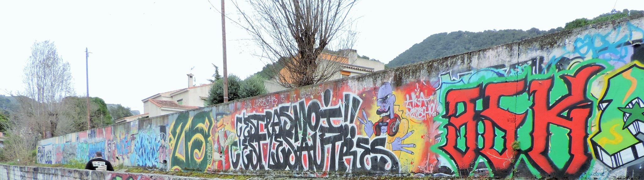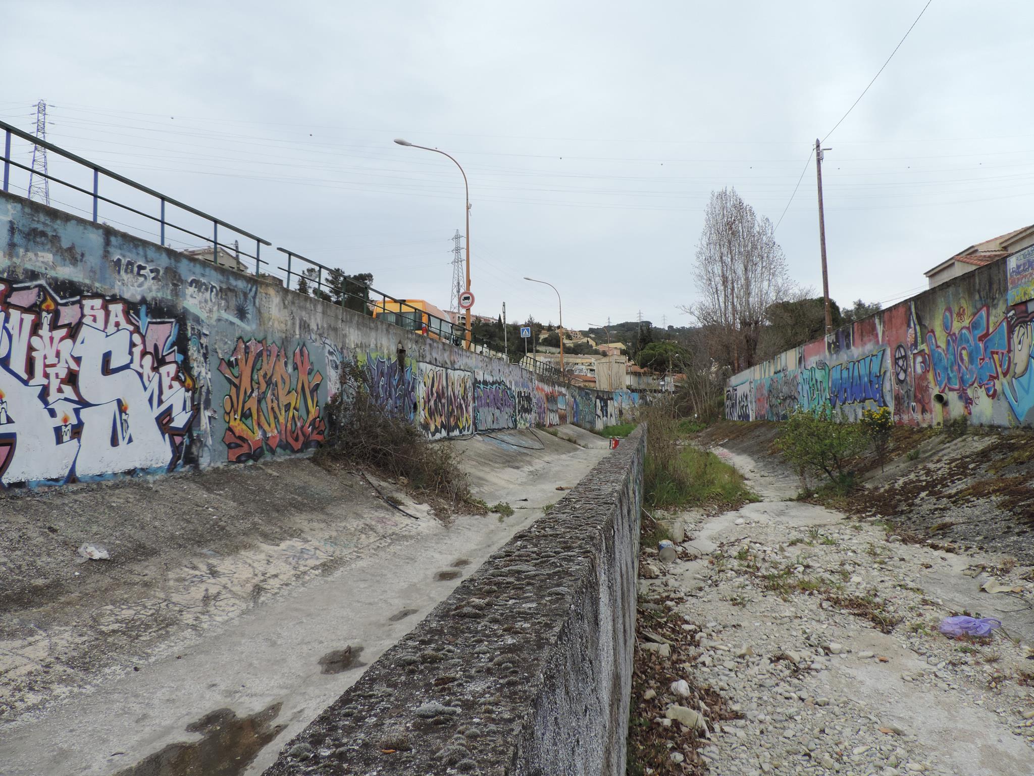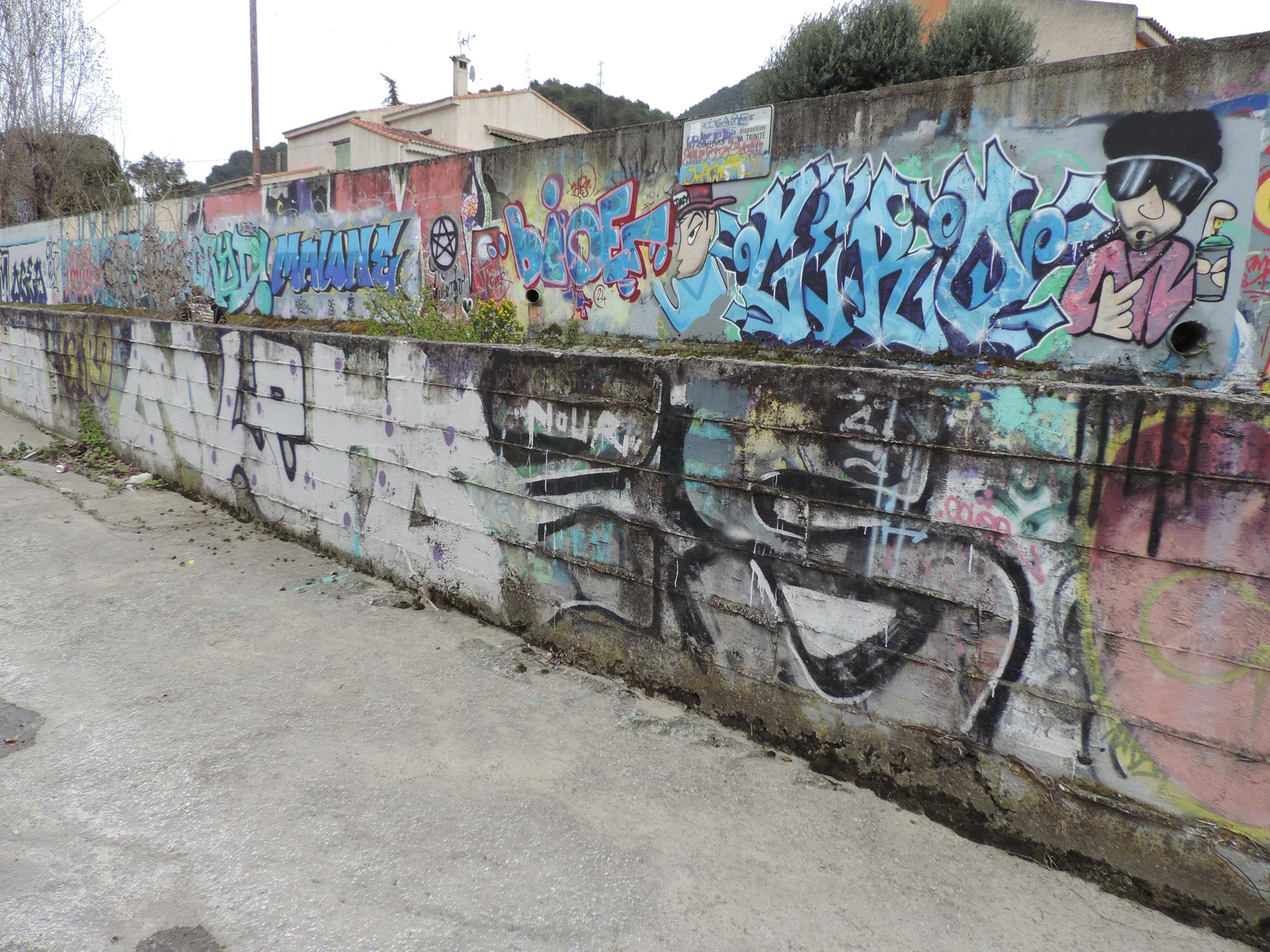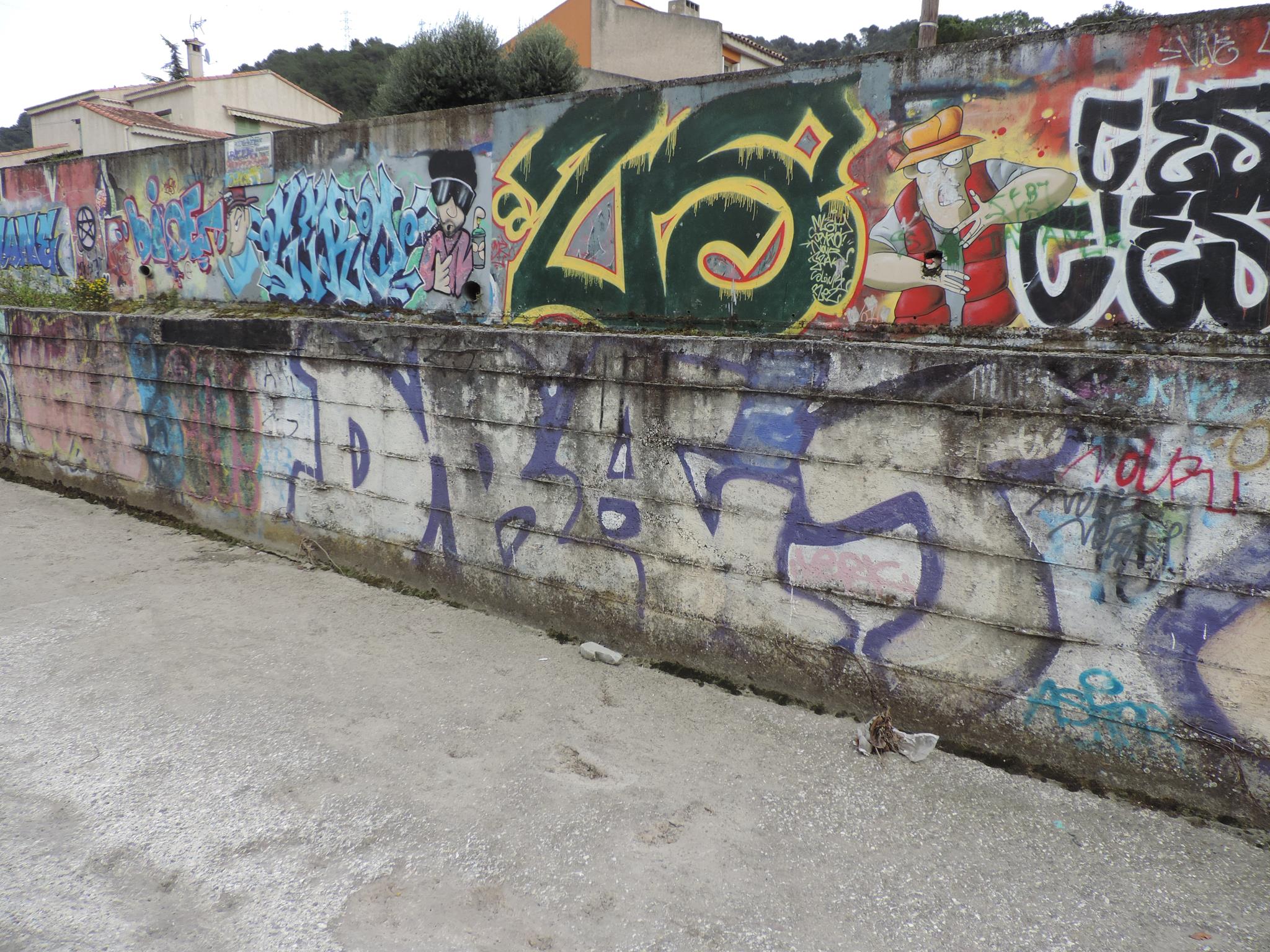 Running parallel between Boulevard François Suárez and Impasse Fuon Santa is the canal of the Vallon de Laghet river, which in some months carries very little or no water. The concrete channeled riverbed provides the perfect surface for graffiti and urban art and the Fuon Santa Hall of Fame has been created here over time with several really good pieces. It stretches from the bridge on Boulevard Fuon Santa in the west on both canal wall sides to the bridge at the Negron bus stop on the west part. A smaller, continuous wall in the middle of the canal, about 1 meter high, has also been sprayed. Further along the river it runs underground, and further upstream there are no concrete walls. This section is where the Vallon de Laghet goes below the town of La Trinité. It is accessible from the outside and shows a fantastic spray paradise! We have a collection of the works here; if you have any photos of this spot, send them to info@vagabundler.com and we will add them to this page.