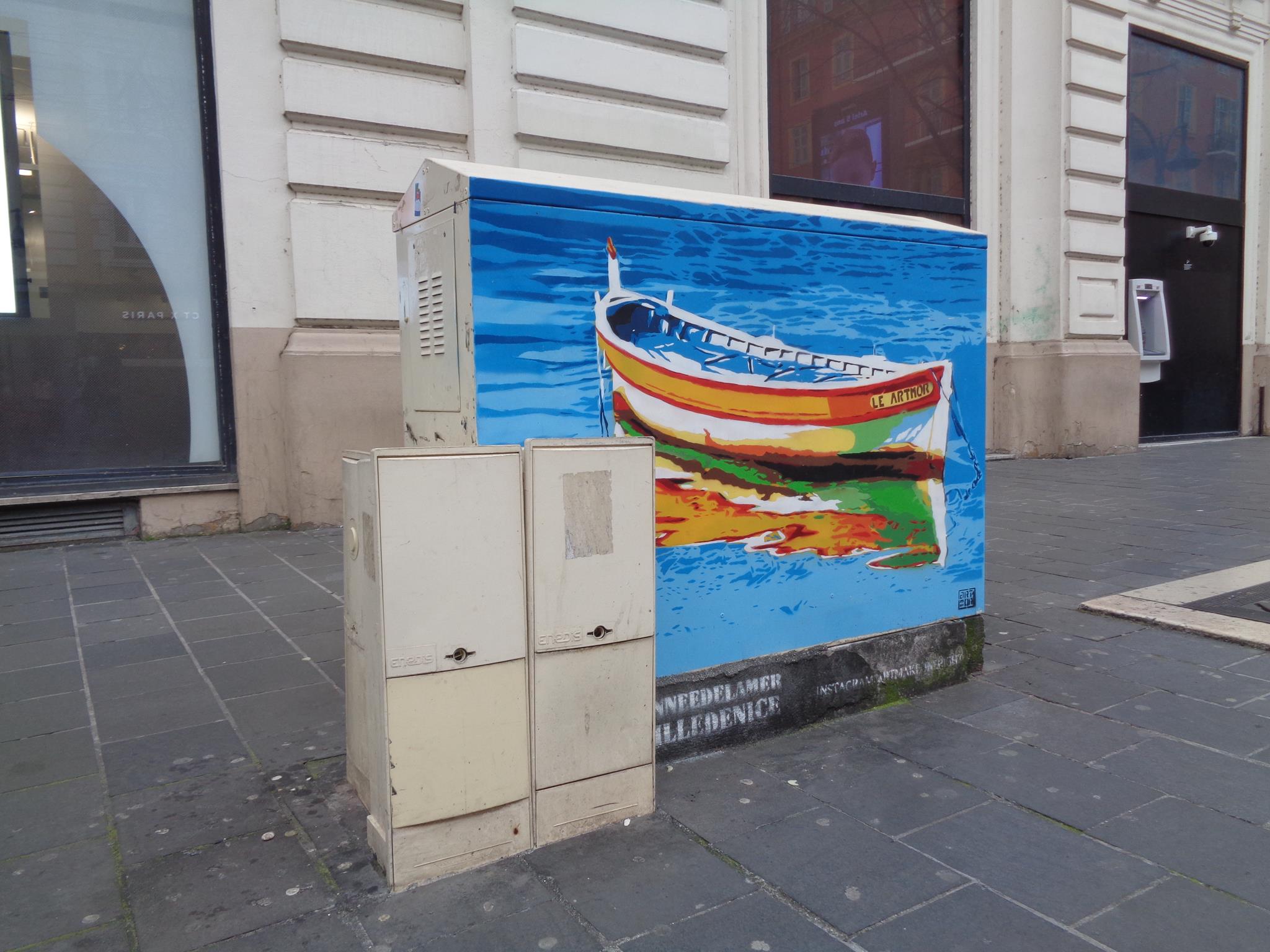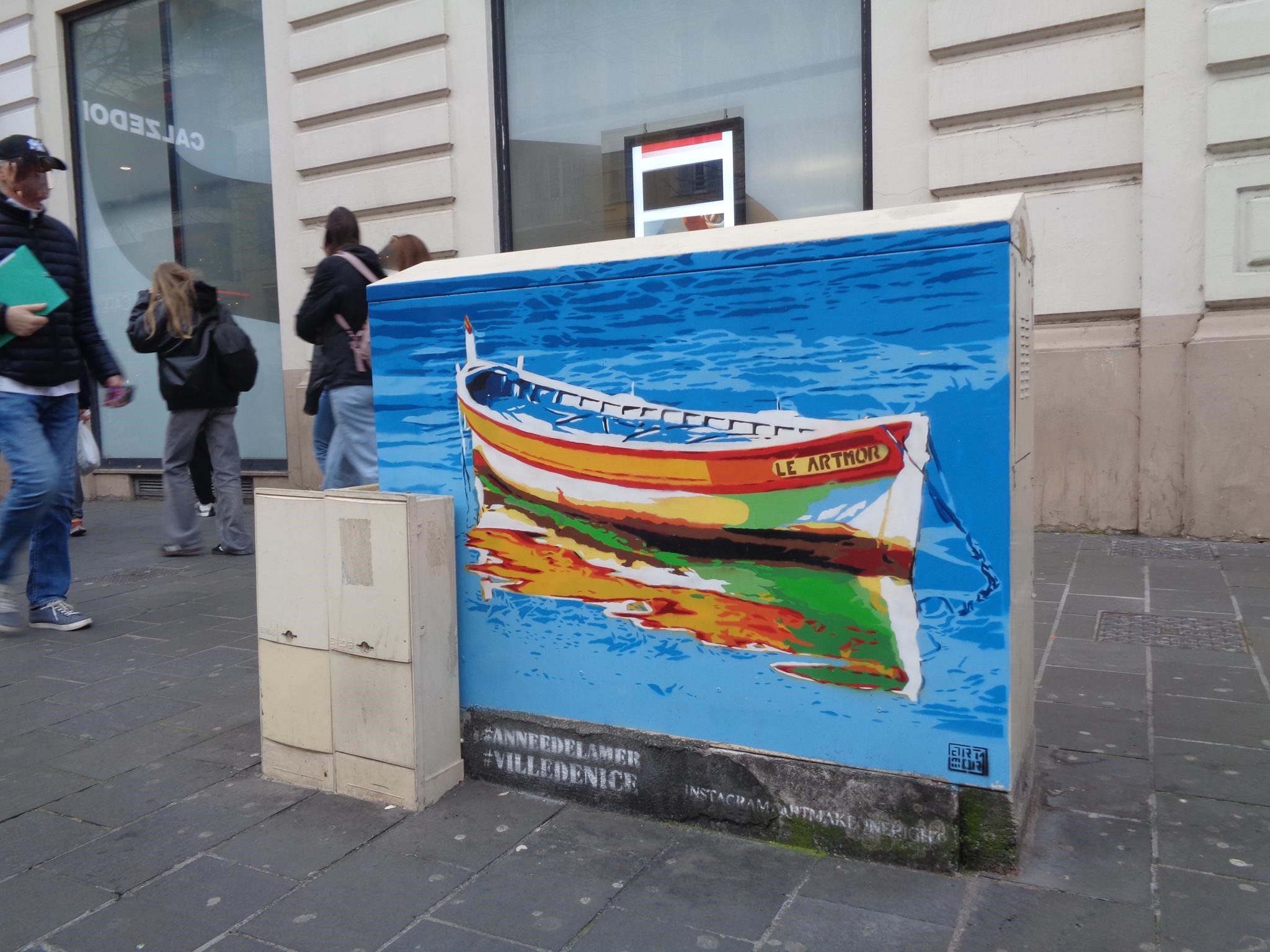 This artwork is part of a series created by stencil artist ROMAIN RENAUD, alias ARTMOR1 and commissioned by the City of Nice. In October and November 2024 the artist painted 10 artworks, mostly on electricity boxes around Avenue Jean-Médecin and showing animals of the sea. The series was made in occasion of the United Nations Ocean Conference (UNOC) in 2025 which will be held in Nice. Check out as well the main page with all the artworks from this project and more background information.