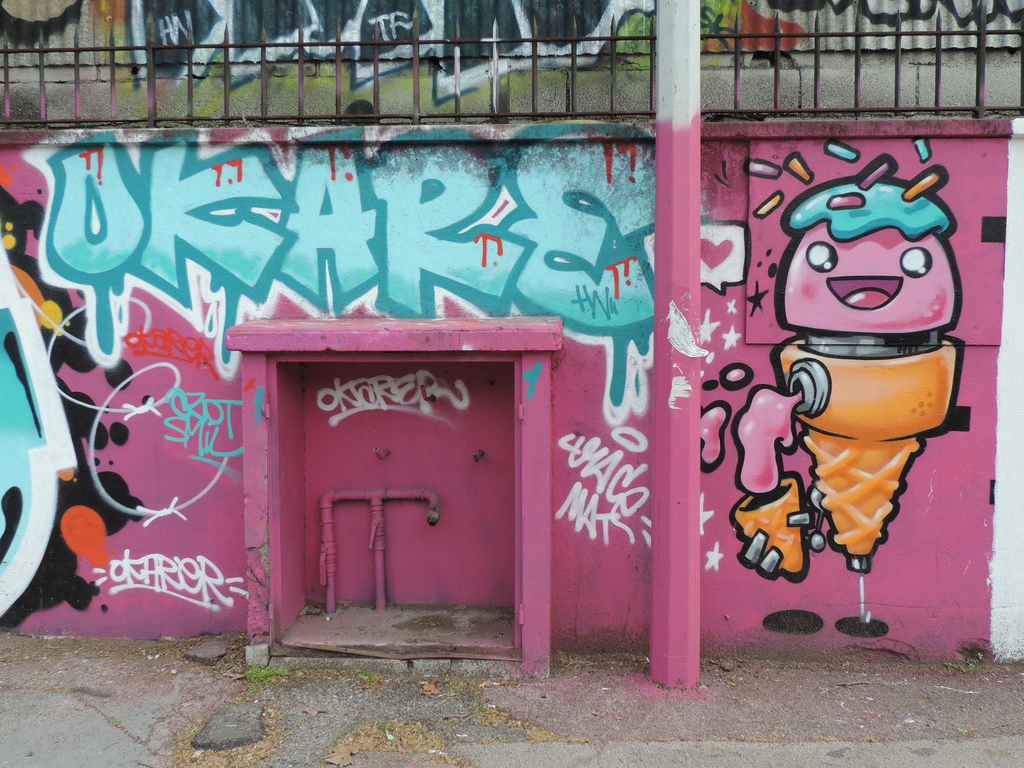 The ice cream character on the right is from TRACE MAT, and the graffiti above were made by ZONER and ROKO. The part on the left is also from a graffiti by ROKO