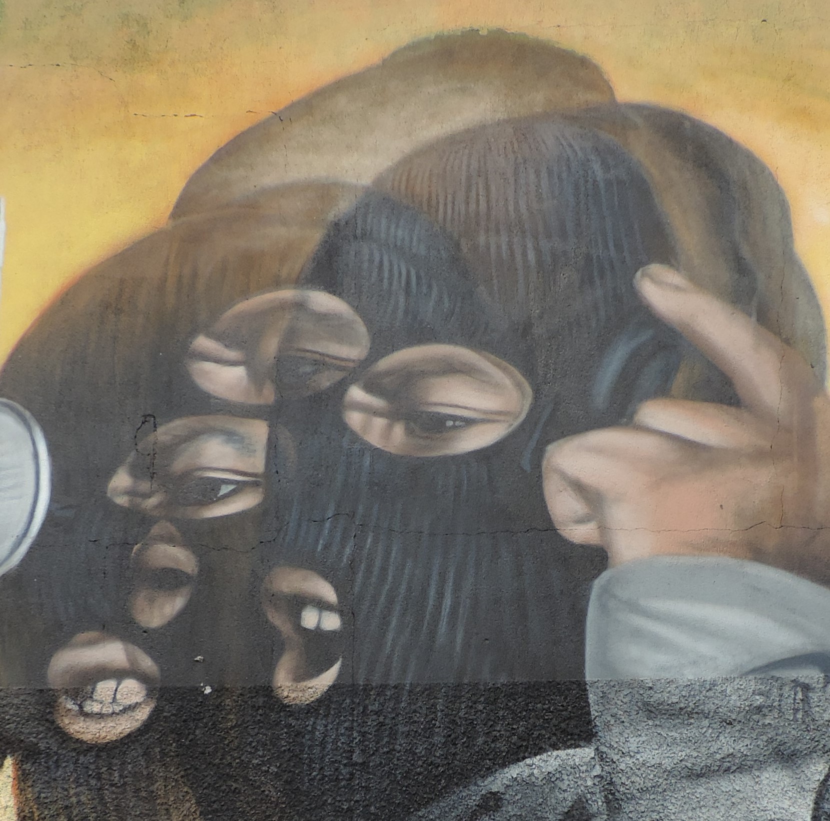 The patchwork portrait on the left is from ALBER, the graffiti on the left are from IDEU and KAKI, and the artworks on the right were made by OGEA, ROOBLE and INAV