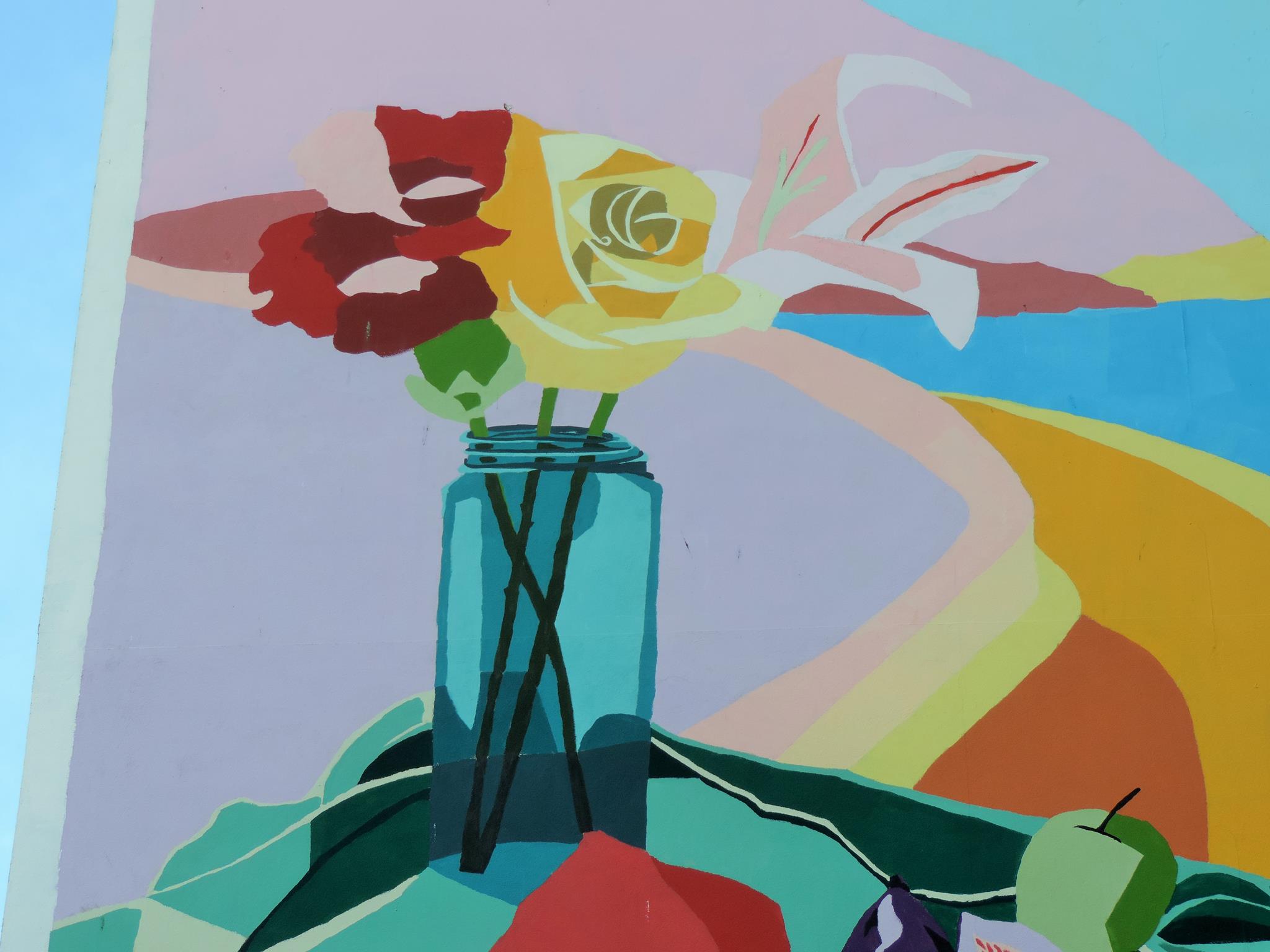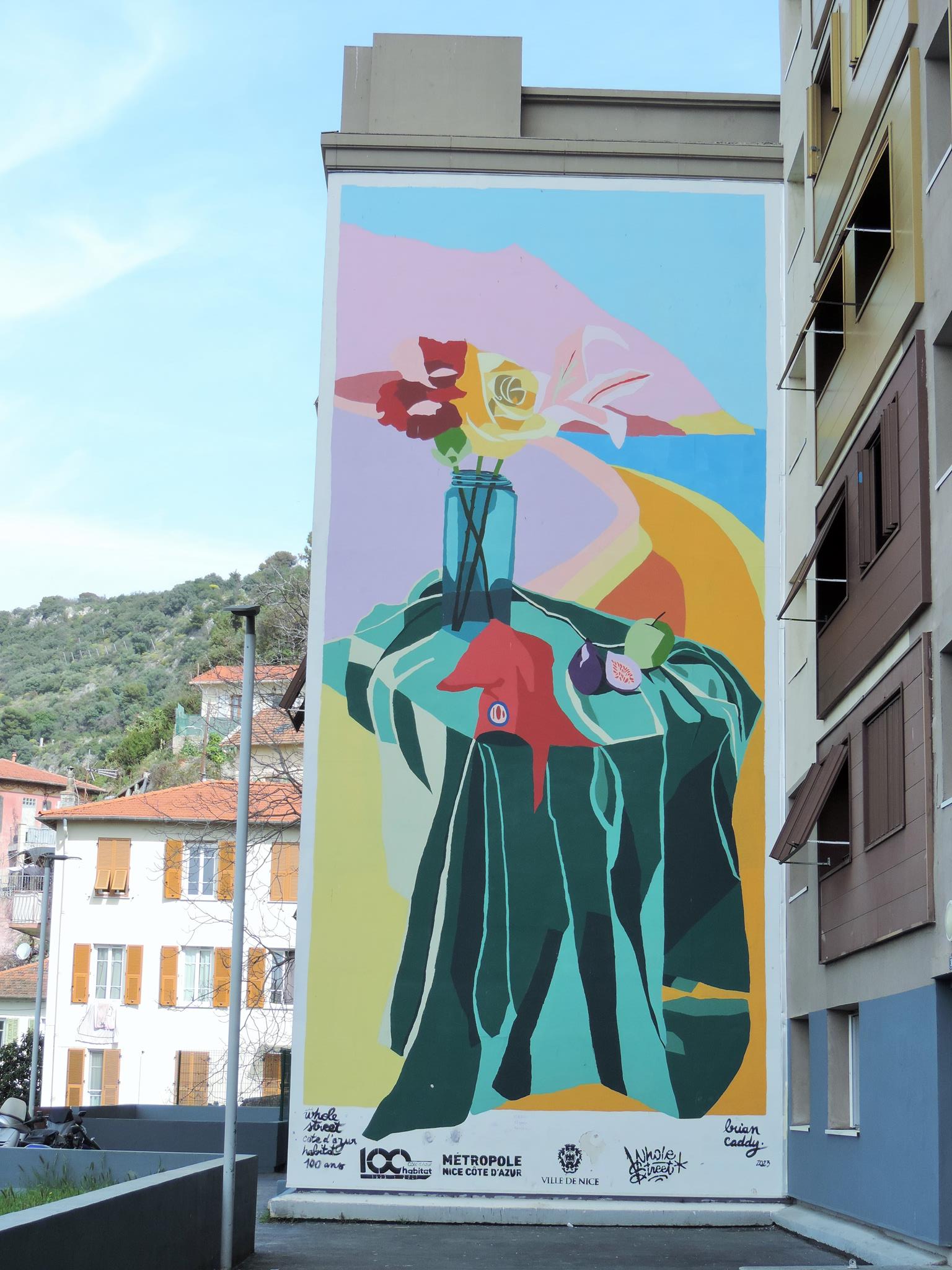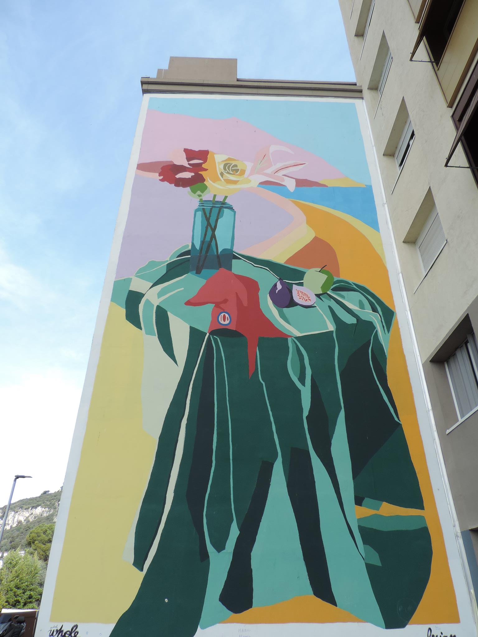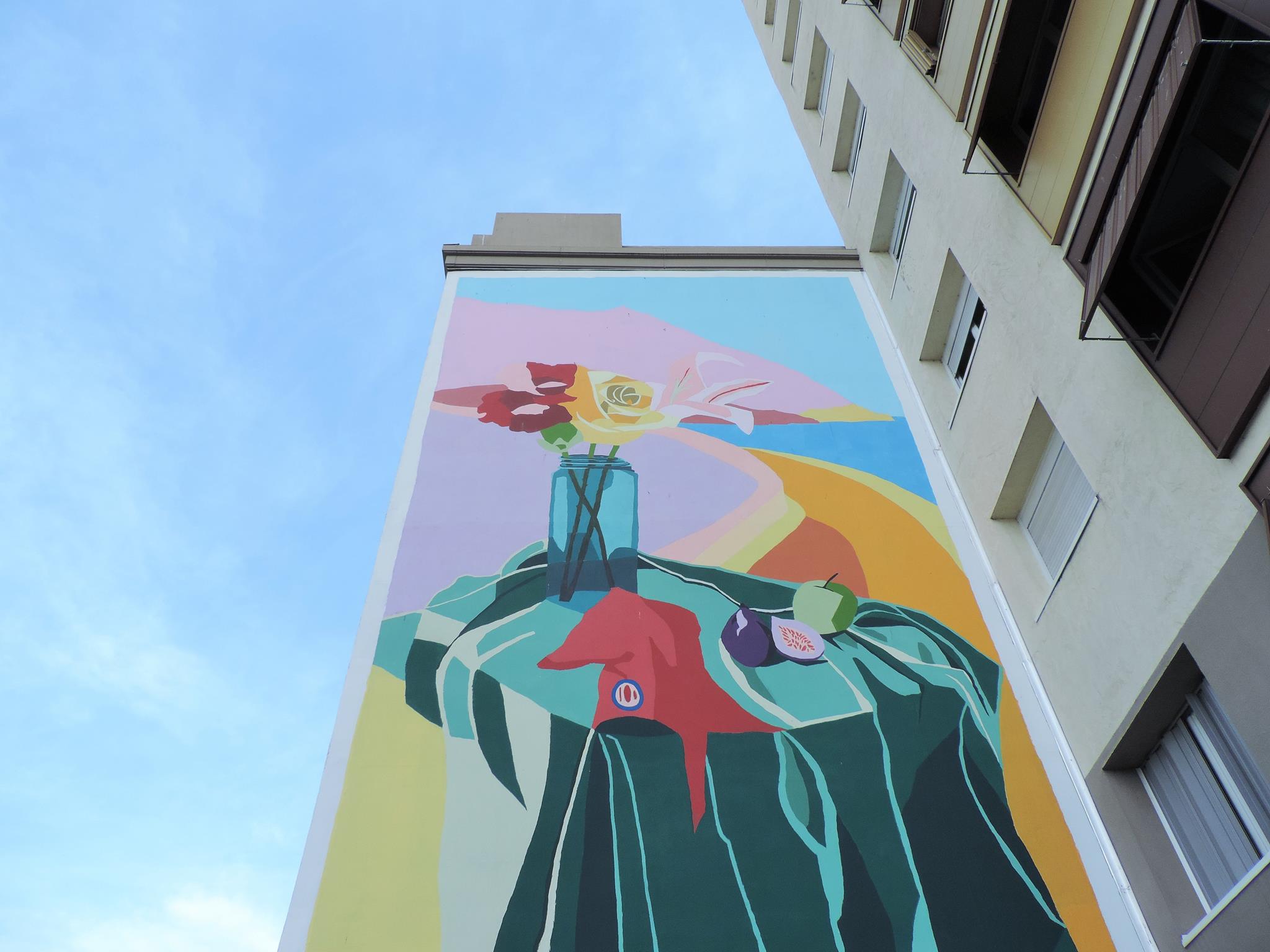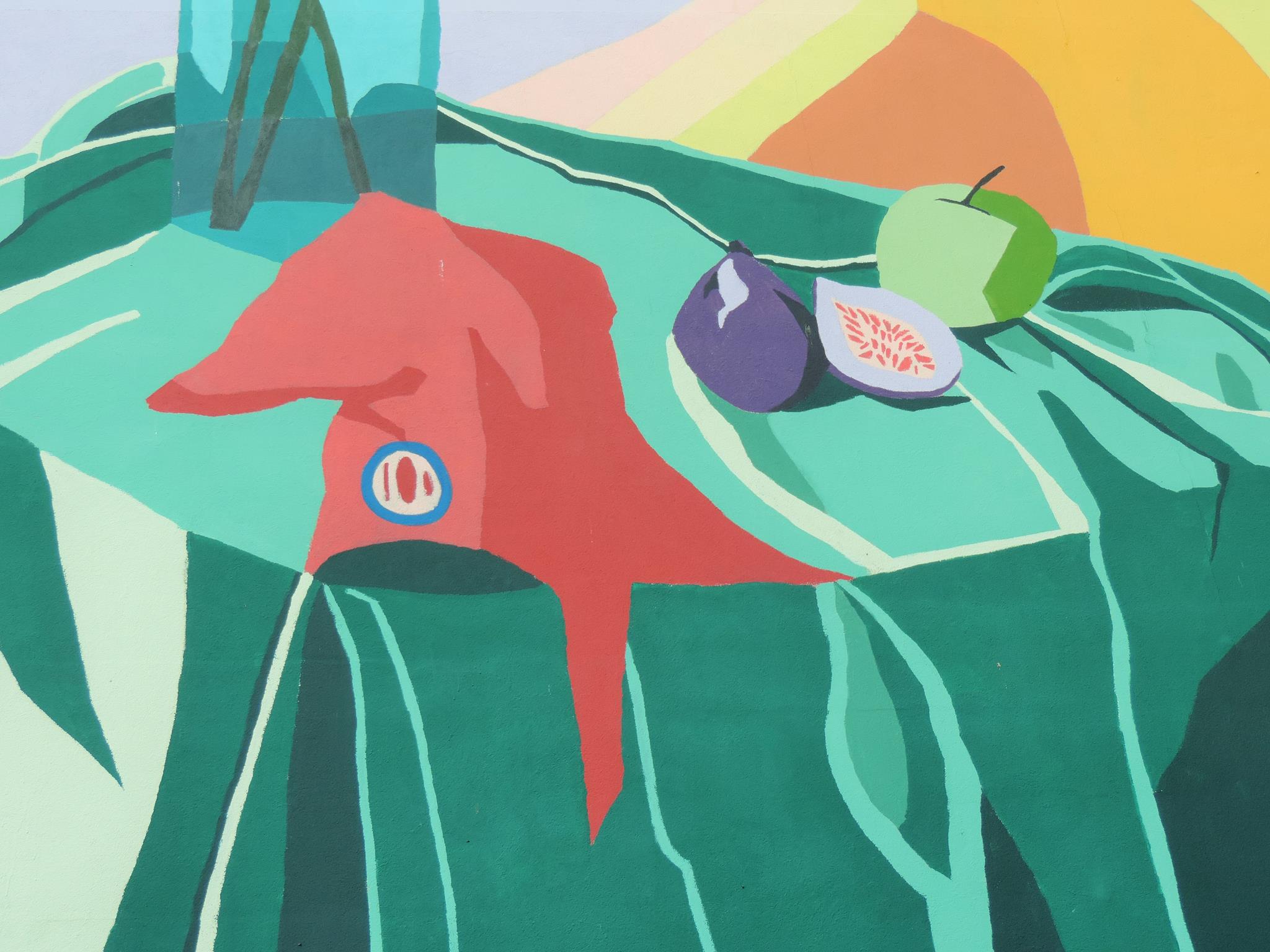 “On the left, we have the red carnation, symbolizing liberty, the yellow rose equality, and the lily representing fraternity. We can see the apple and the fig on the other side of the table, which are signs of abundance and fertility. I also added a Phrygian cap, which links to Marianne. In disadvantaged neighborhoods, this kind of action brings joy and color! I received a lot of feedback from residents and children who passed by while I was painting. I’m happy to have been able to participate in this project.” – BRIAN CADDY