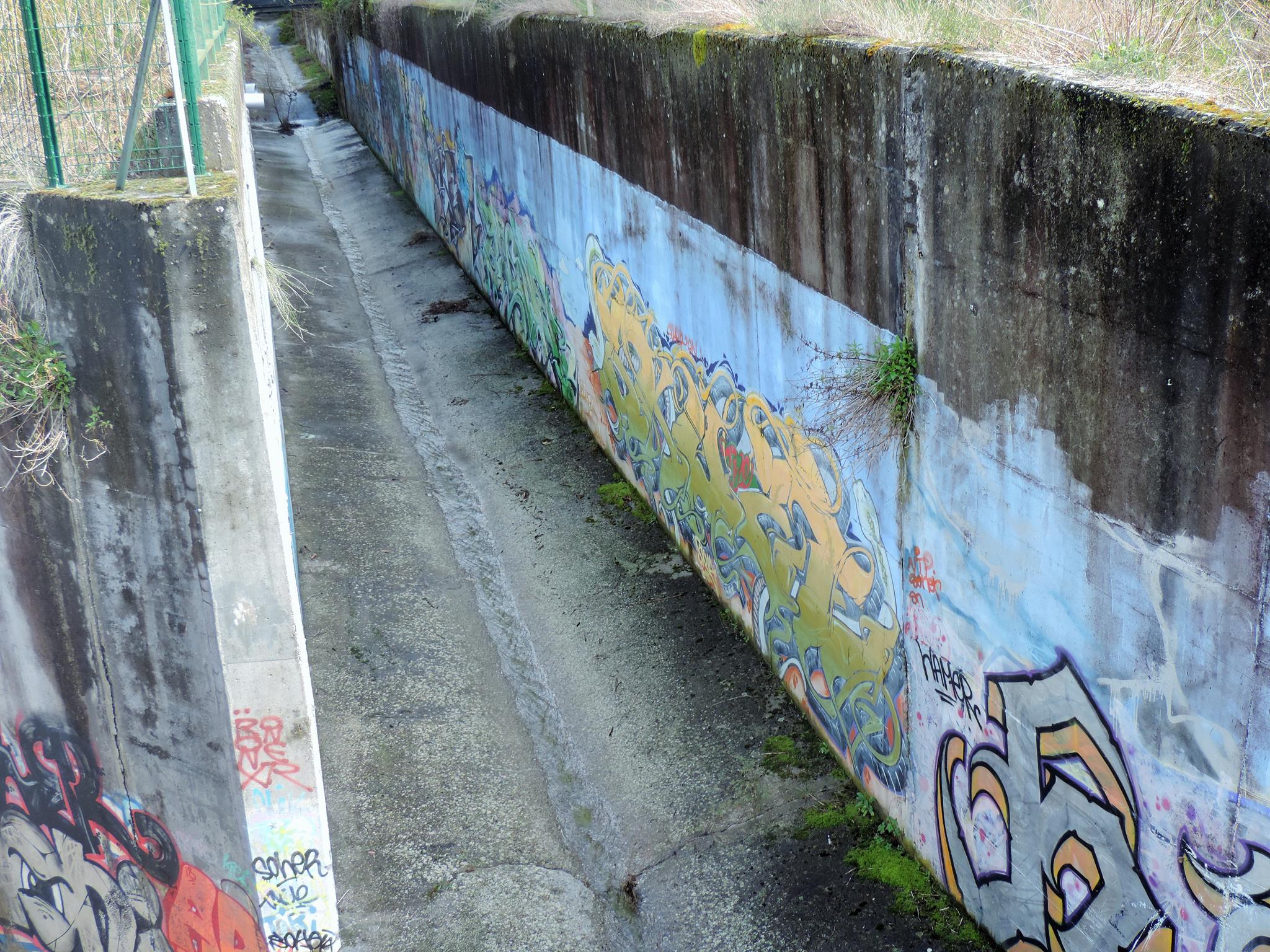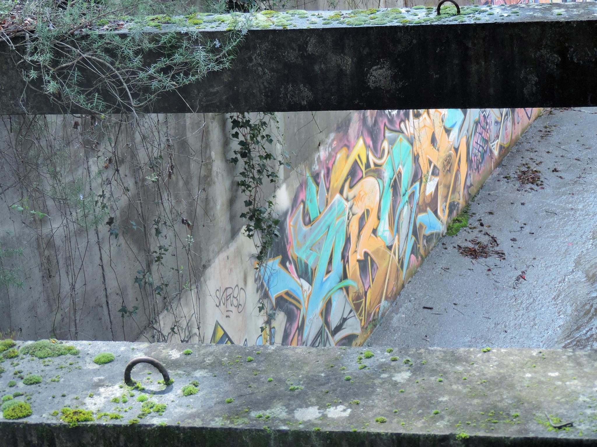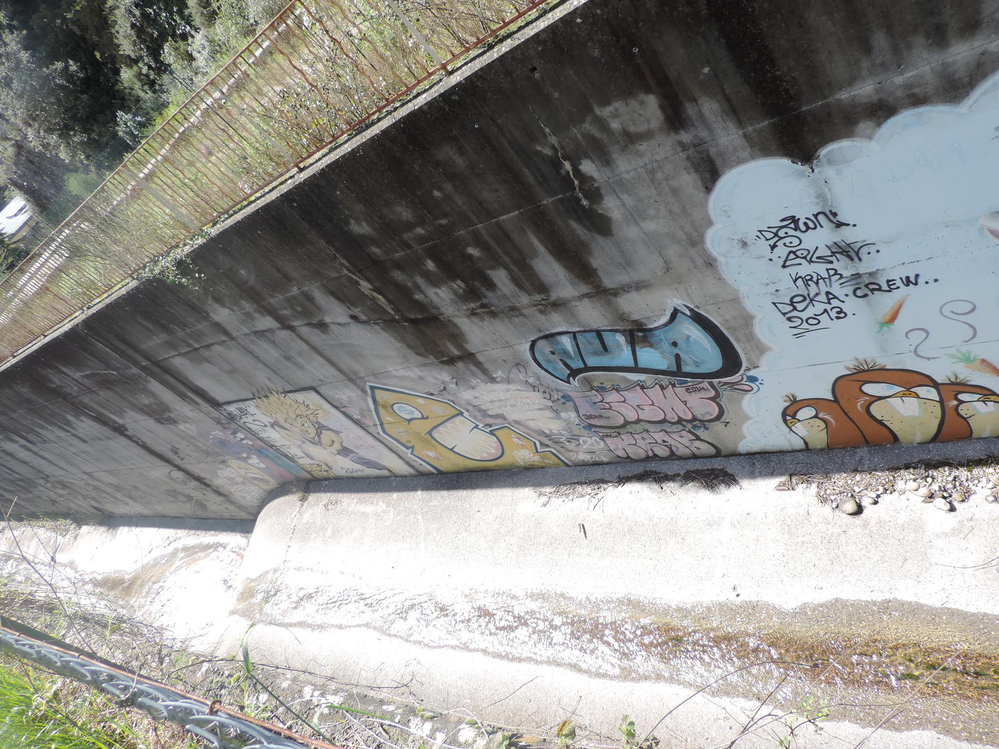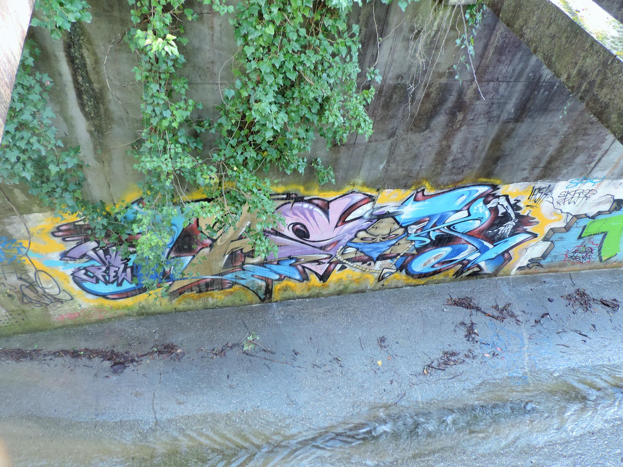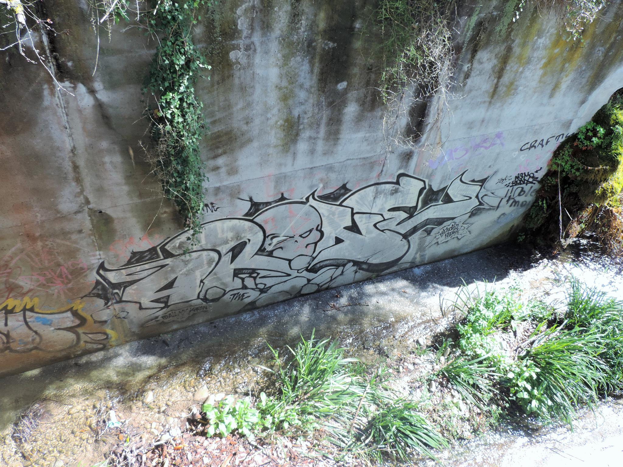 In the north of Nice in the municipality of Castagniers, between the Vallon de Massac and the Vallon de Roguez, lies the city’s necropolis with its cemetery and cremation site. The water flows from the mountain towards the foot of the Var river via the two Vallons and above the Necropolis area the inflow is channeled into a concreted canal. This can carry a lot of water at peak times, but often it is simply empty. So of water, but not of color. Because the walls are filled with great graffiti which have accumulated over many years. It is definitely a historic urban art place and off the beaten track, not easy to reach and not easy to photograph. Or you can go down into the canal, but you should bring a little more time for the complete walk from top to bottom. Here we have a collection of graffiti from the canal, it’s just a small selection. If you have your own photos of this spot, send them to info@vagabundler.com and we will add them to this page.