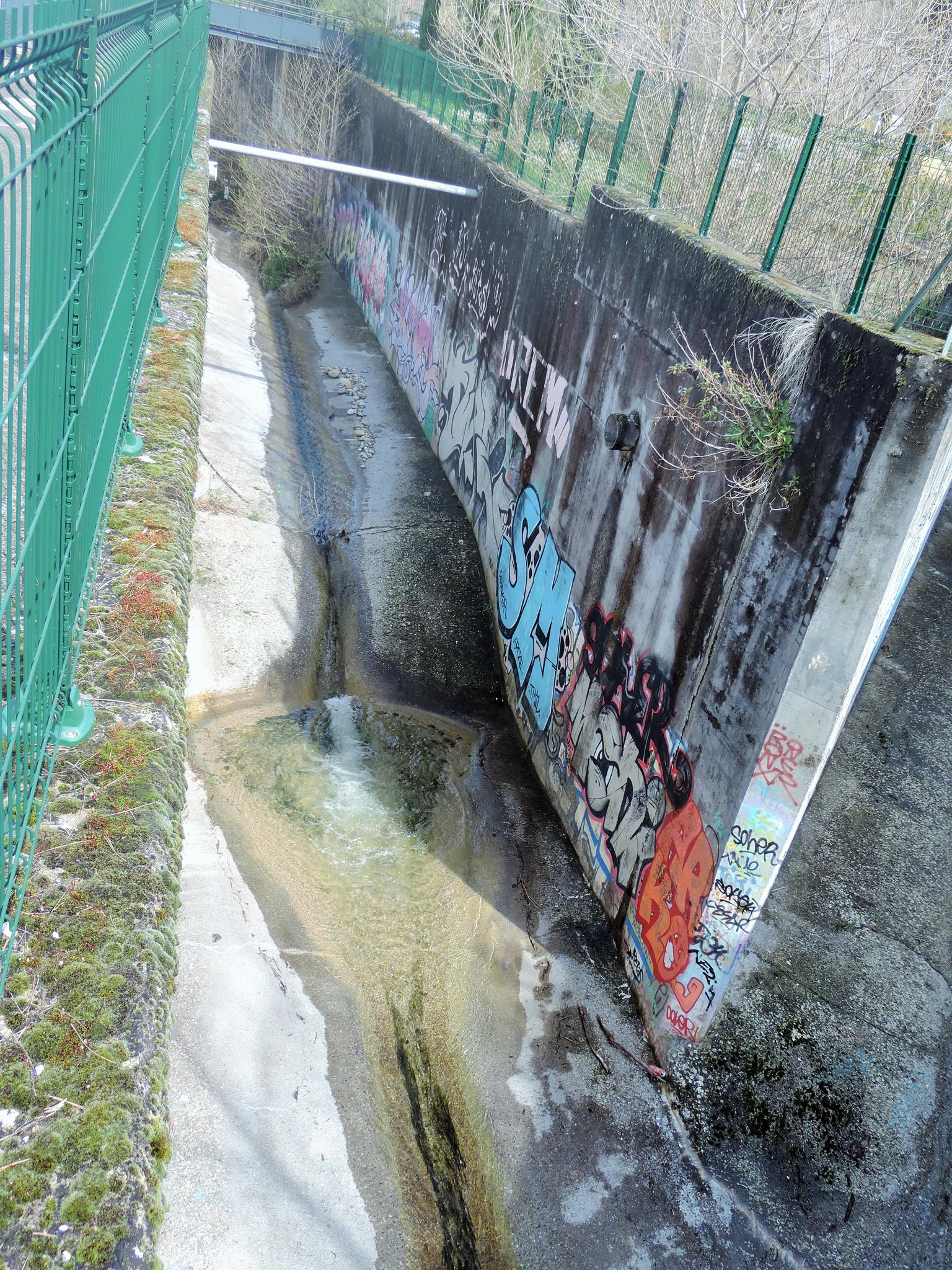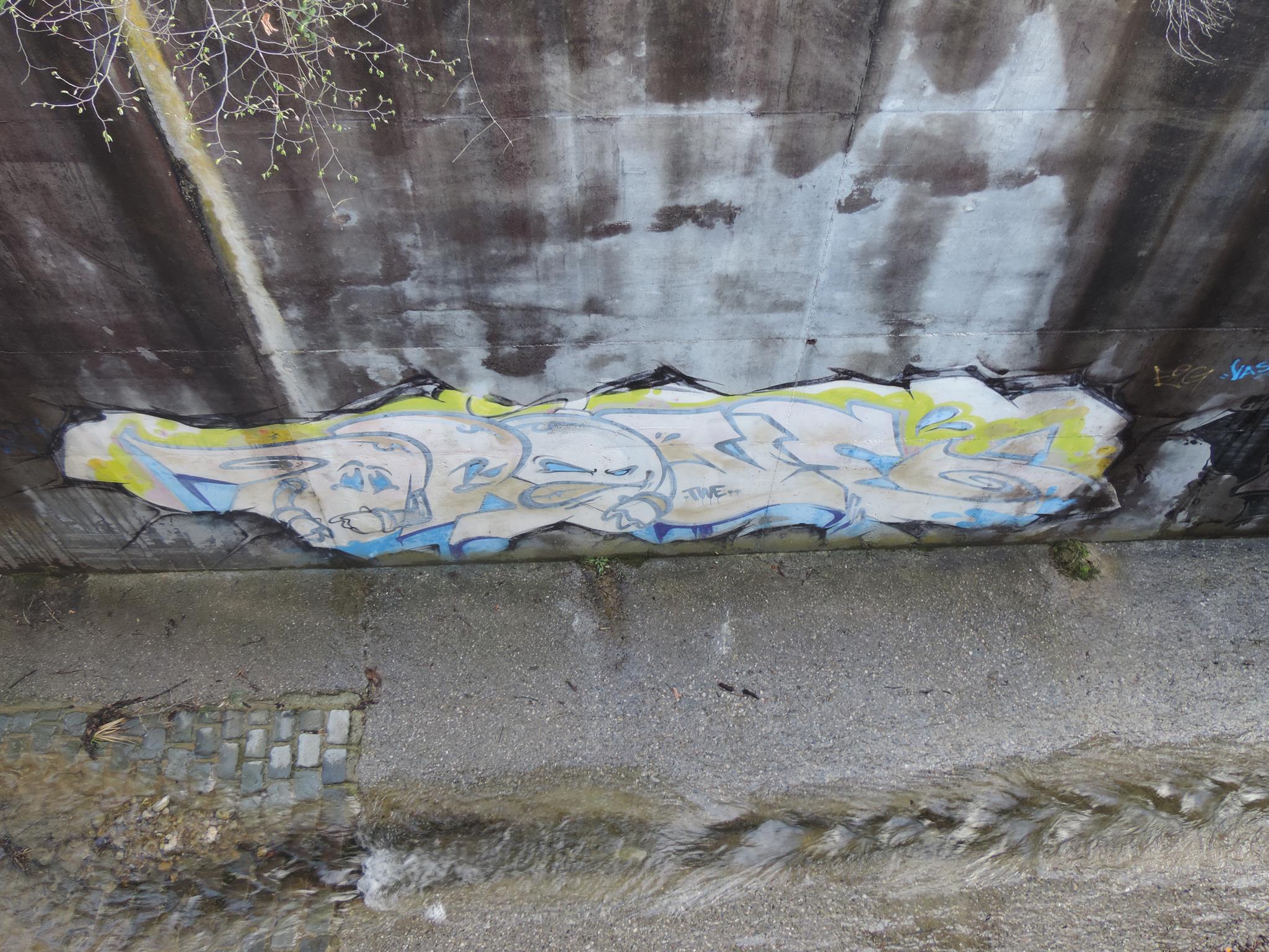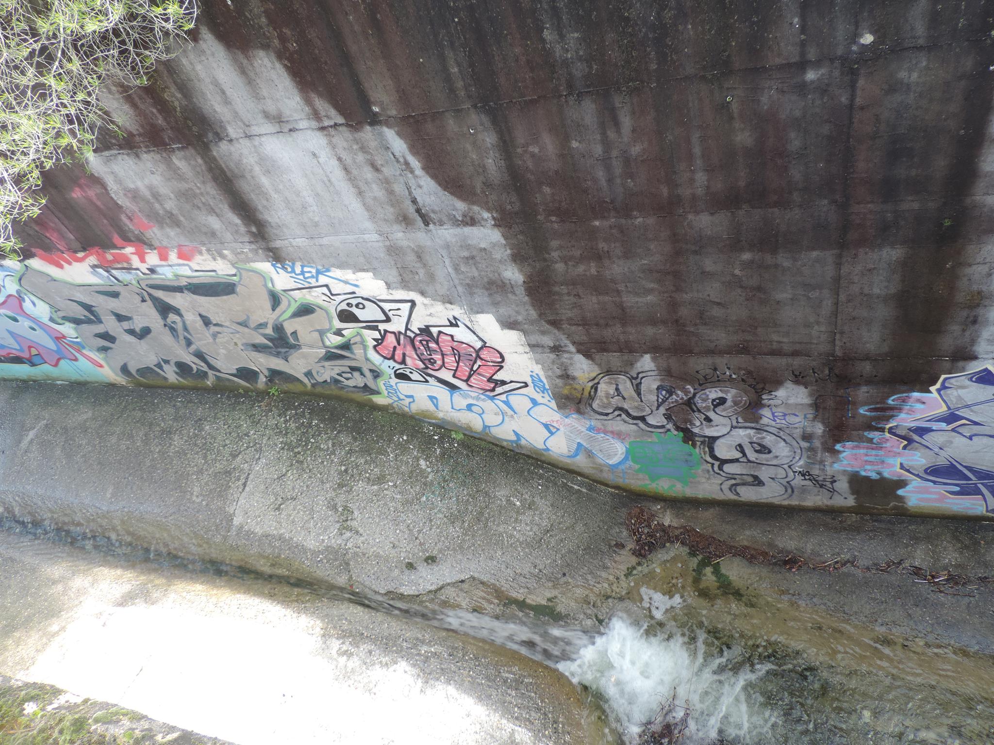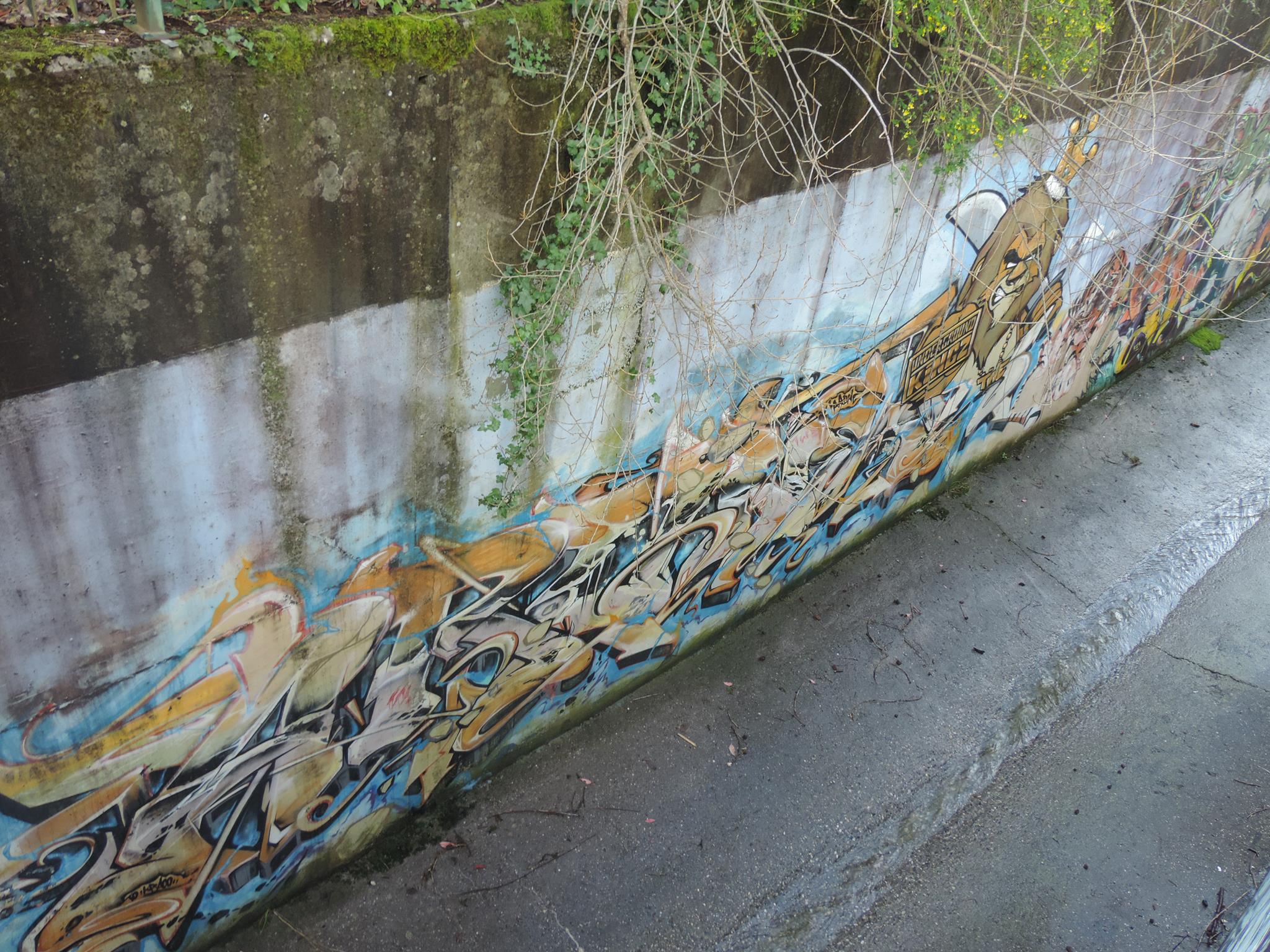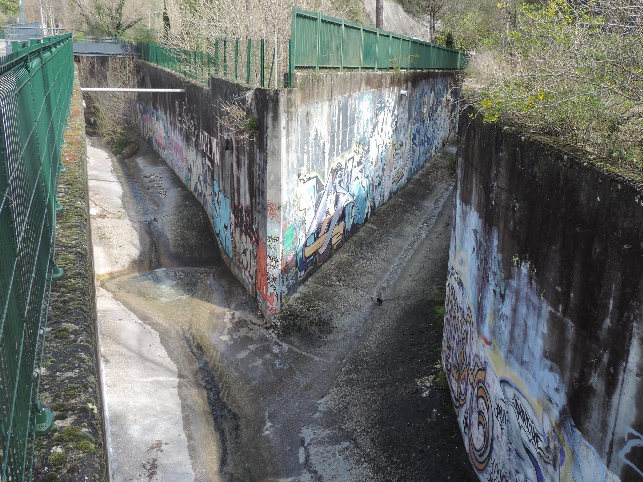In the north of Nice in the municipality of Castagniers, between the Vallon de Massac and the Vallon de Roguez, lies the city’s necropolis with its cemetery and cremation site. The water flows from the mountain towards the foot of the Var river via the two Vallons and above the Necropolis area the inflow is channeled into a concreted canal. This can carry a lot of water at peak times, but often it is simply empty. So of water, but not of color. Because the walls are filled with great graffiti which have accumulated over many years. It is definitely a historic urban art place and off the beaten track, not easy to reach and not easy to photograph. Or you can go down into the canal, but you should bring a little more time for the complete walk from top to bottom. Here we have a collection of graffiti from the canal, it’s just a small selection. If you have your own photos of this spot, send them to info@vagabundler.com and we will add them to this page.