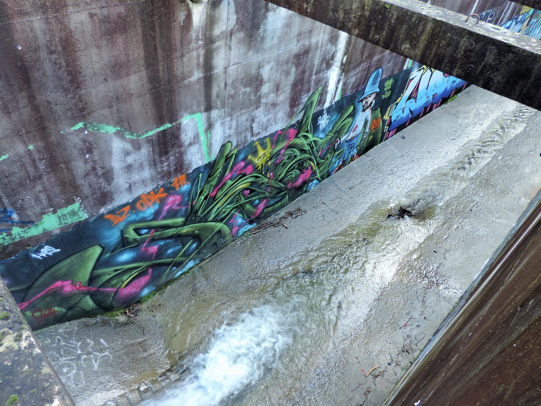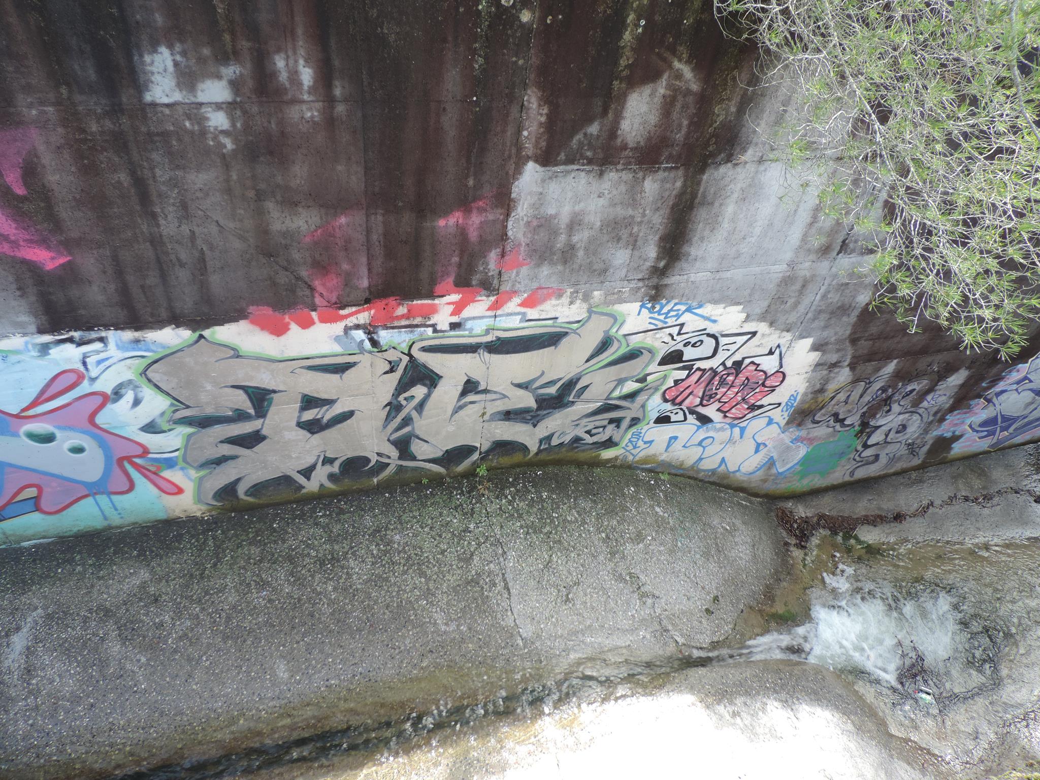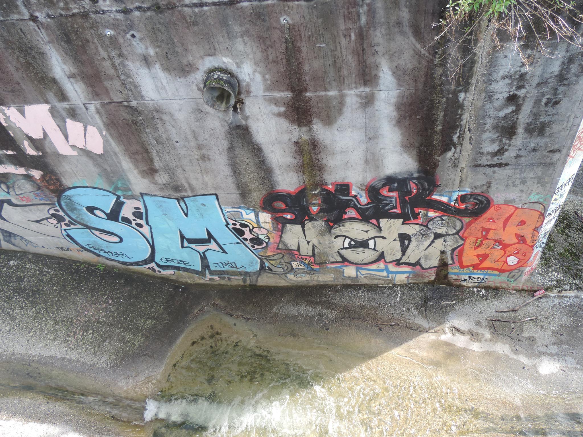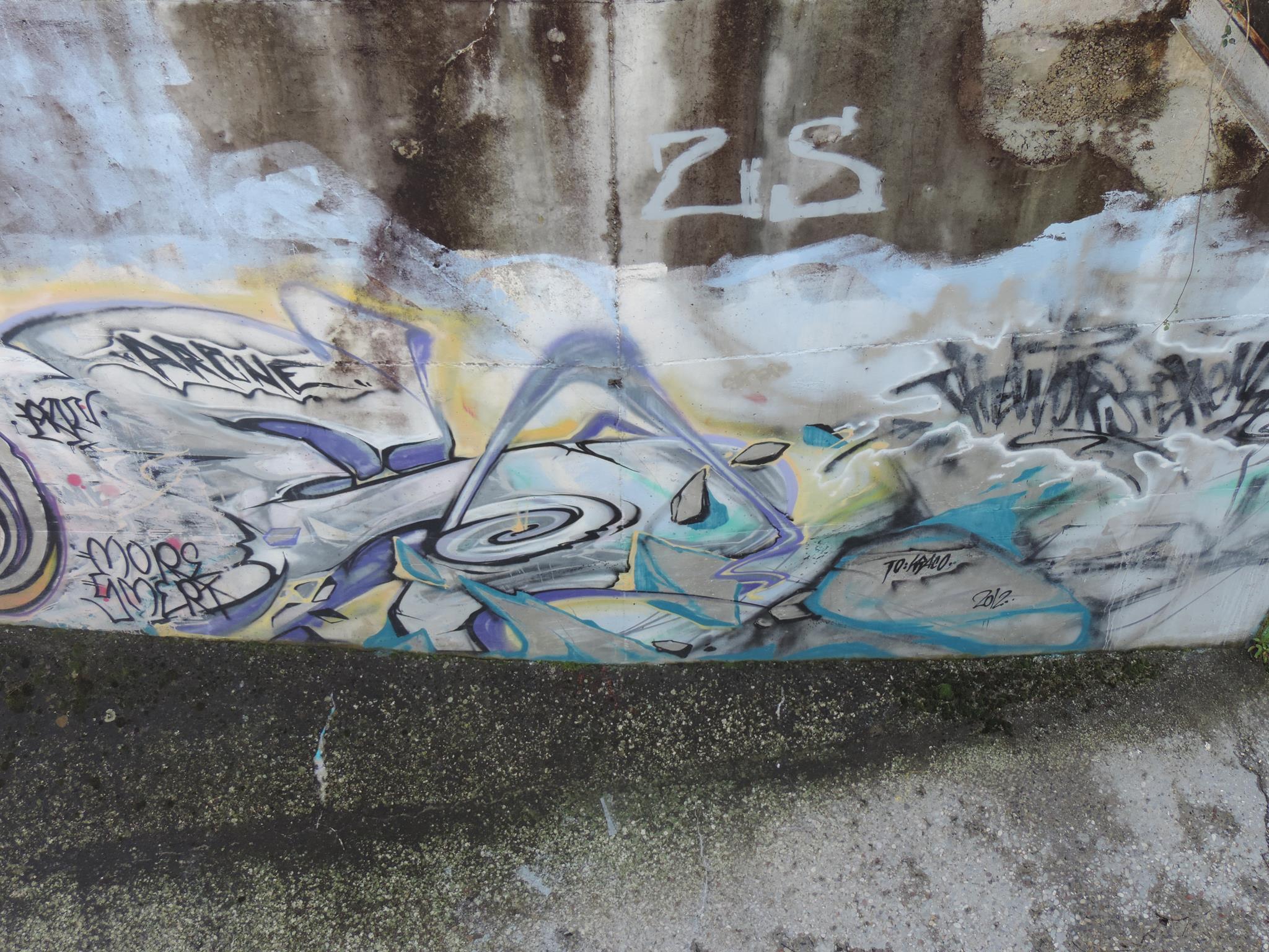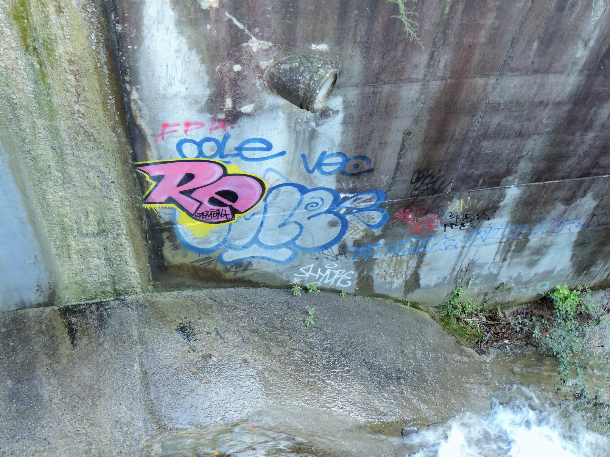 In the north of Nice in the municipality of Castagniers, between the Vallon de Massac and the Vallon de Roguez, lies the city’s necropolis with its cemetery and cremation site. The water flows from the mountain towards the foot of the Var river via the two Vallons and above the Necropolis area the inflow is channeled into a concreted canal. This can carry a lot of water at peak times, but often it is simply empty. So of water, but not of color. Because the walls are filled with great graffiti which have accumulated over many years. It is definitely a historic urban art place and off the beaten track, not easy to reach and not easy to photograph. Or you can go down into the canal, but you should bring a little more time for the complete walk from top to bottom. Here we have a collection of graffiti from the canal, it’s just a small selection. If you have your own photos of this spot, send them to info@vagabundler.com and we will add them to this page.