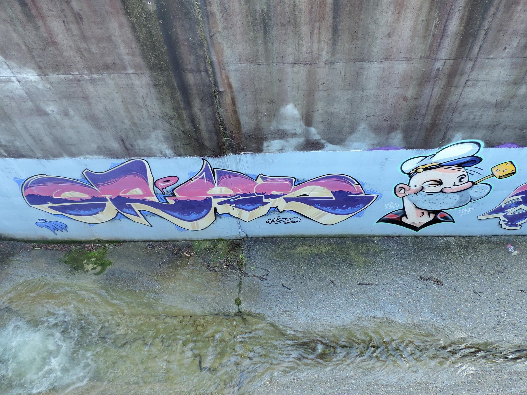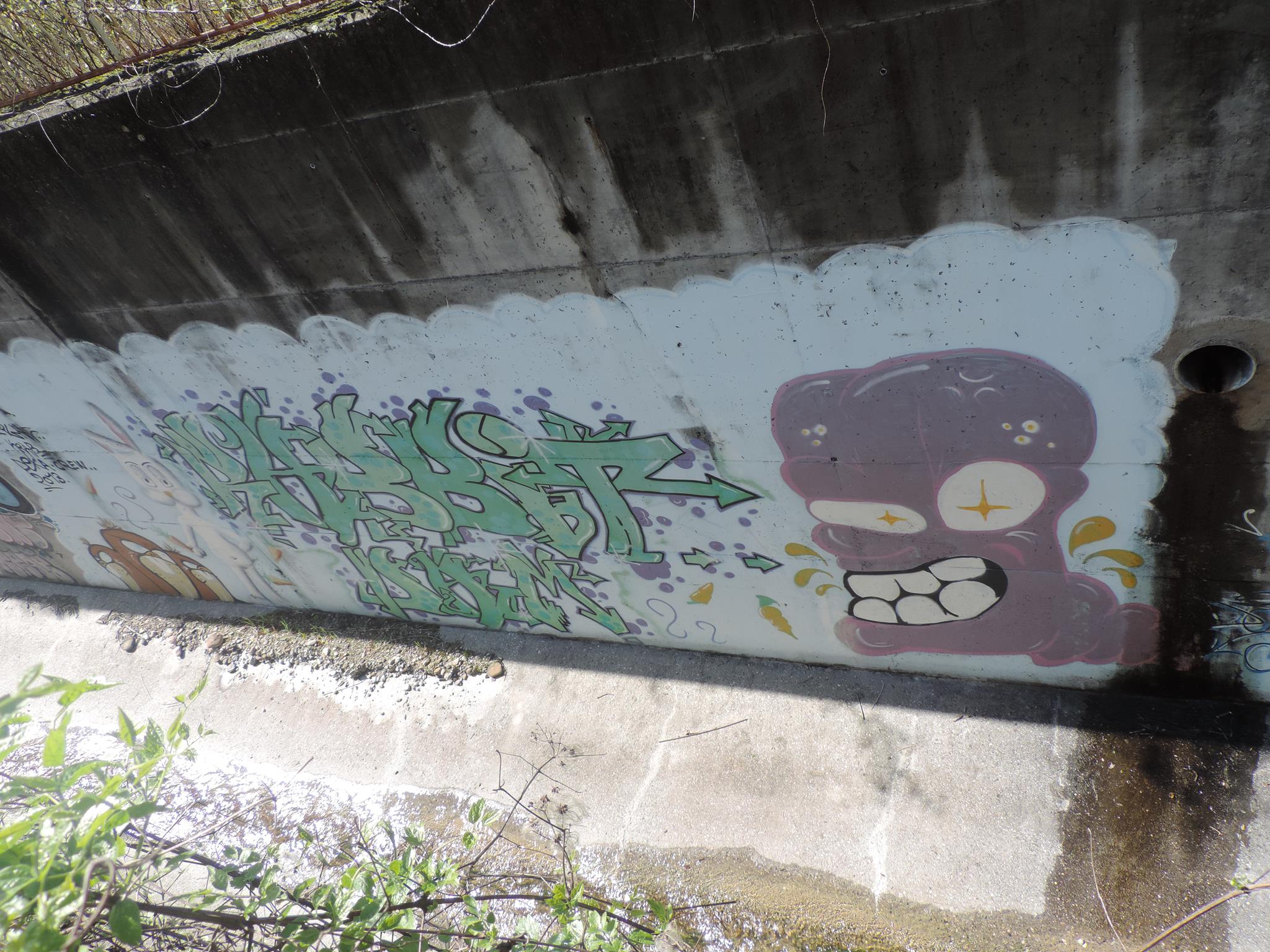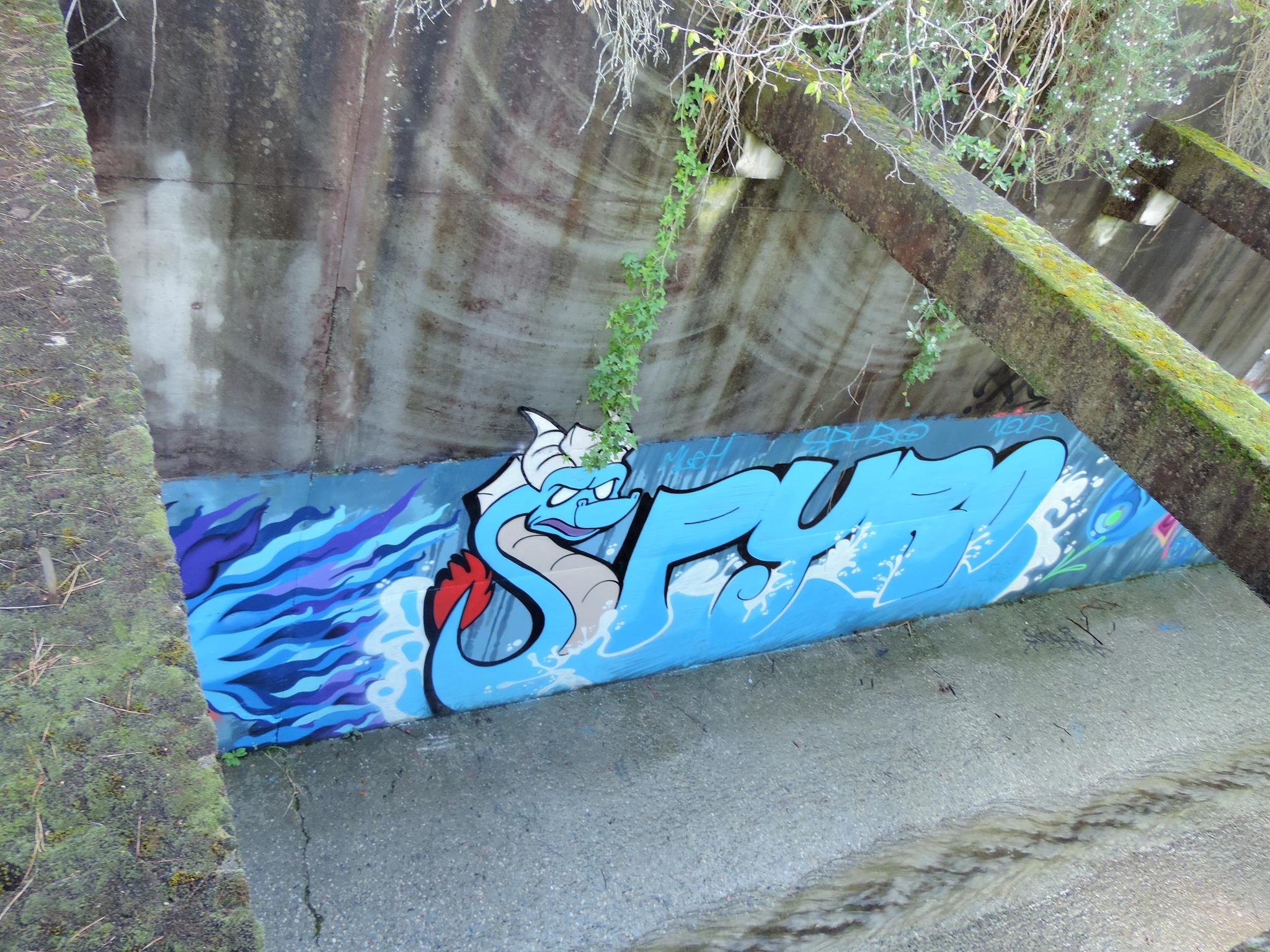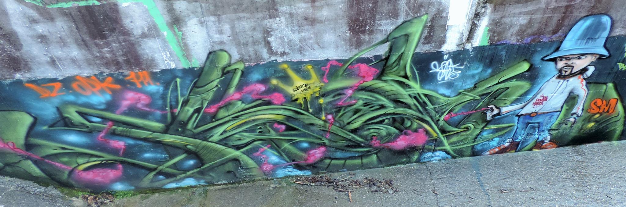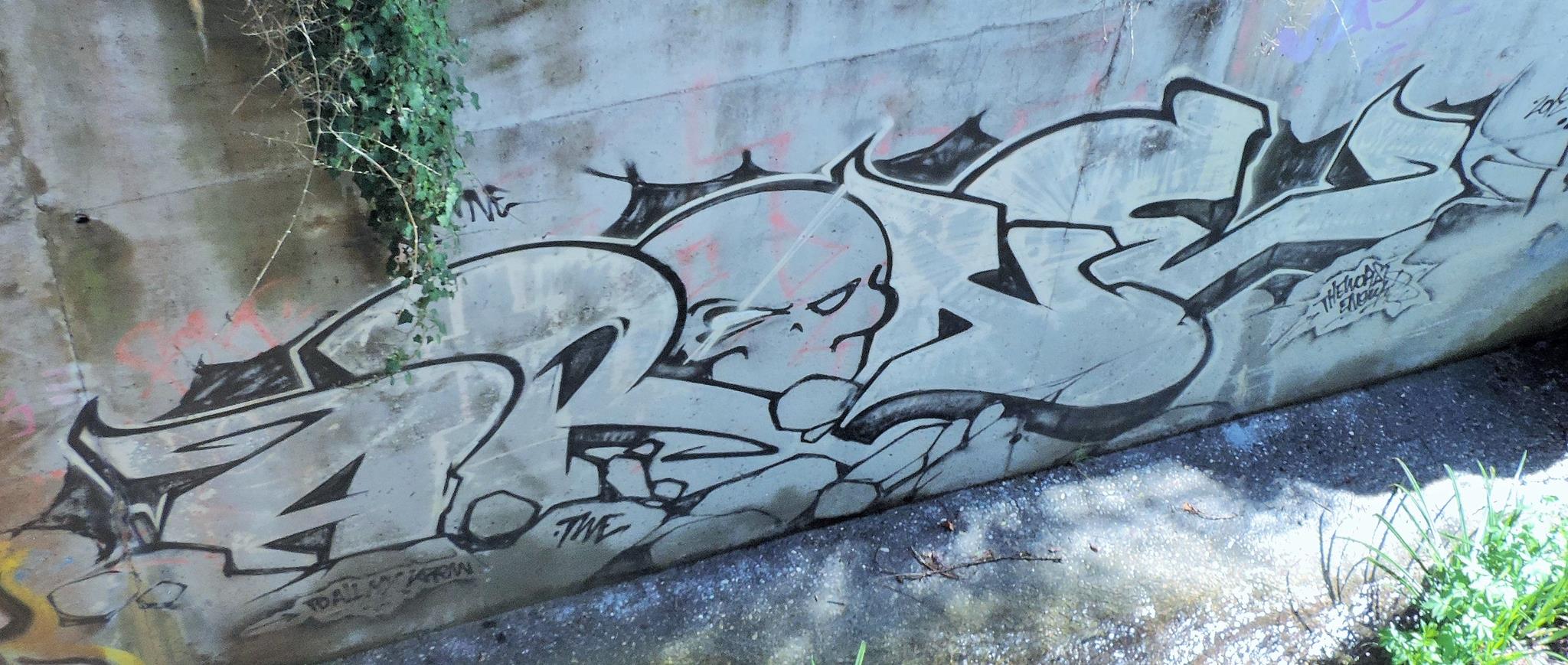 In the north of Nice in the municipality of Castagniers, between the Vallon de Massac and the Vallon de Roguez, lies the city’s necropolis with its cemetery and cremation site. The water flows from the mountain towards the foot of the Var river via the two Vallons and above the Necropolis area the inflow is channeled into a concreted canal. This can carry a lot of water at peak times, but often it is simply empty. So of water, but not of color. Because the walls are filled with great graffiti which have accumulated over many years. It is definitely a historic urban art place and off the beaten track, not easy to reach and not easy to photograph. Or you can go down into the canal, but you should bring a little more time for the complete walk from top to bottom. Here we have a collection of graffiti from the canal, it’s just a small selection. If you have your own photos of this spot, send them to info@vagabundler.com and we will add them to this page.