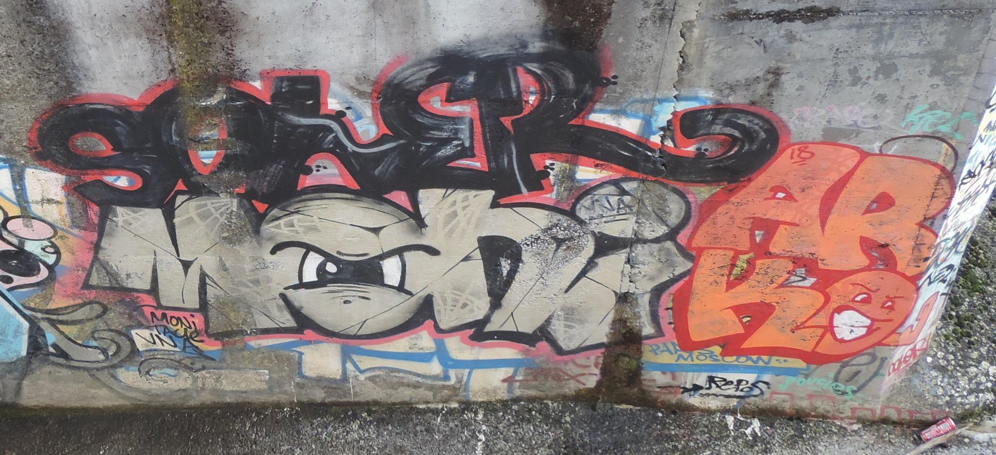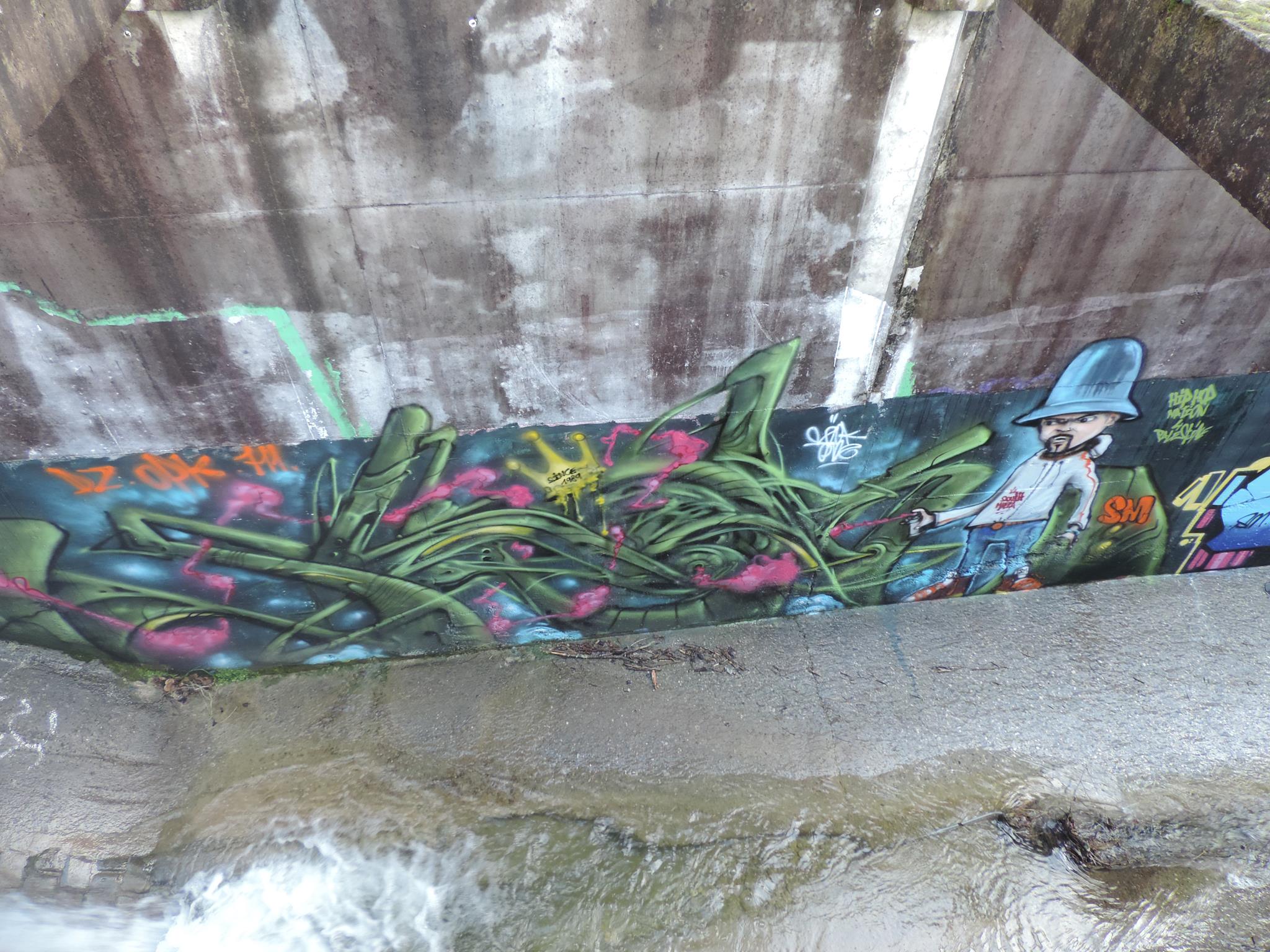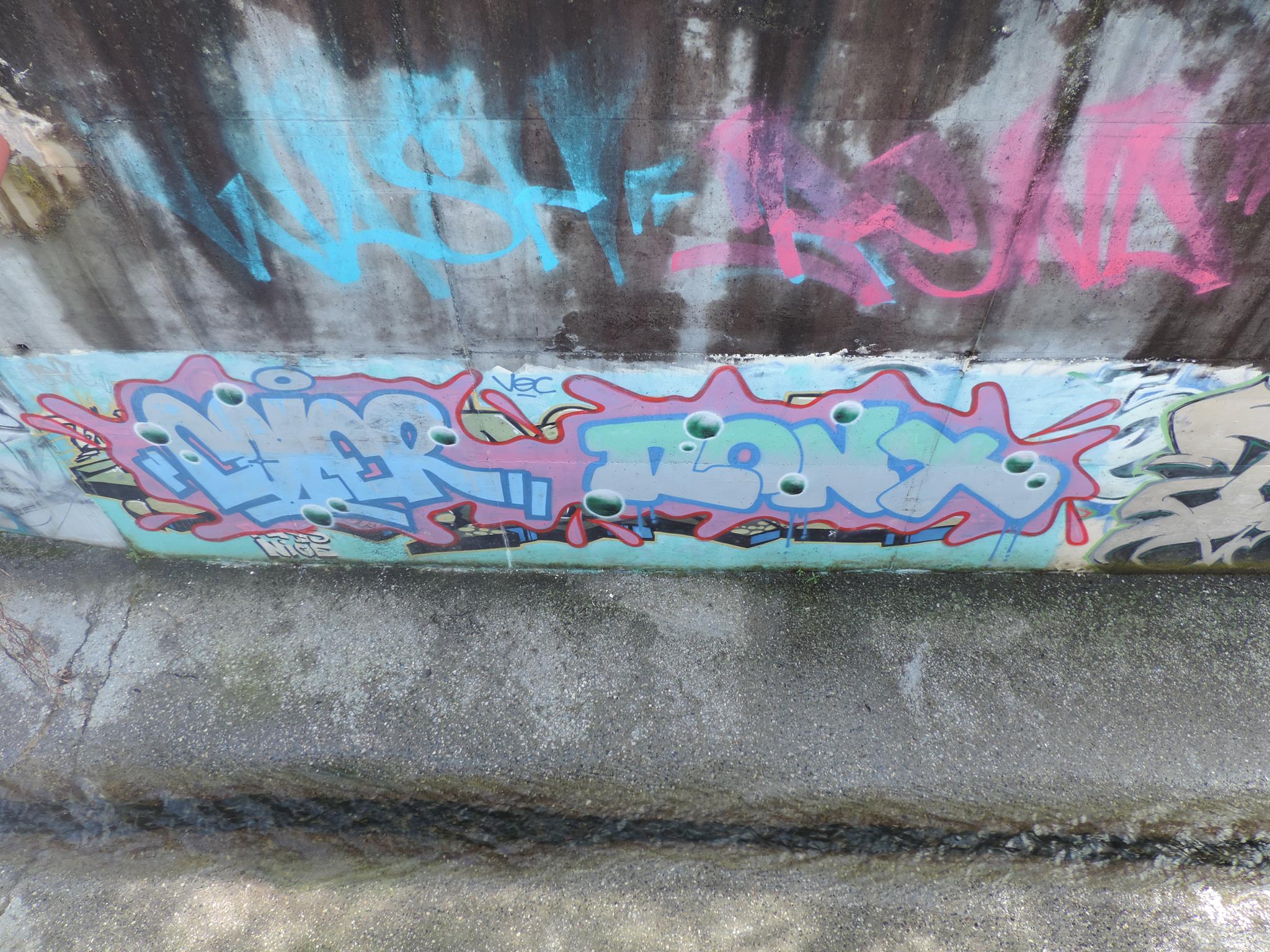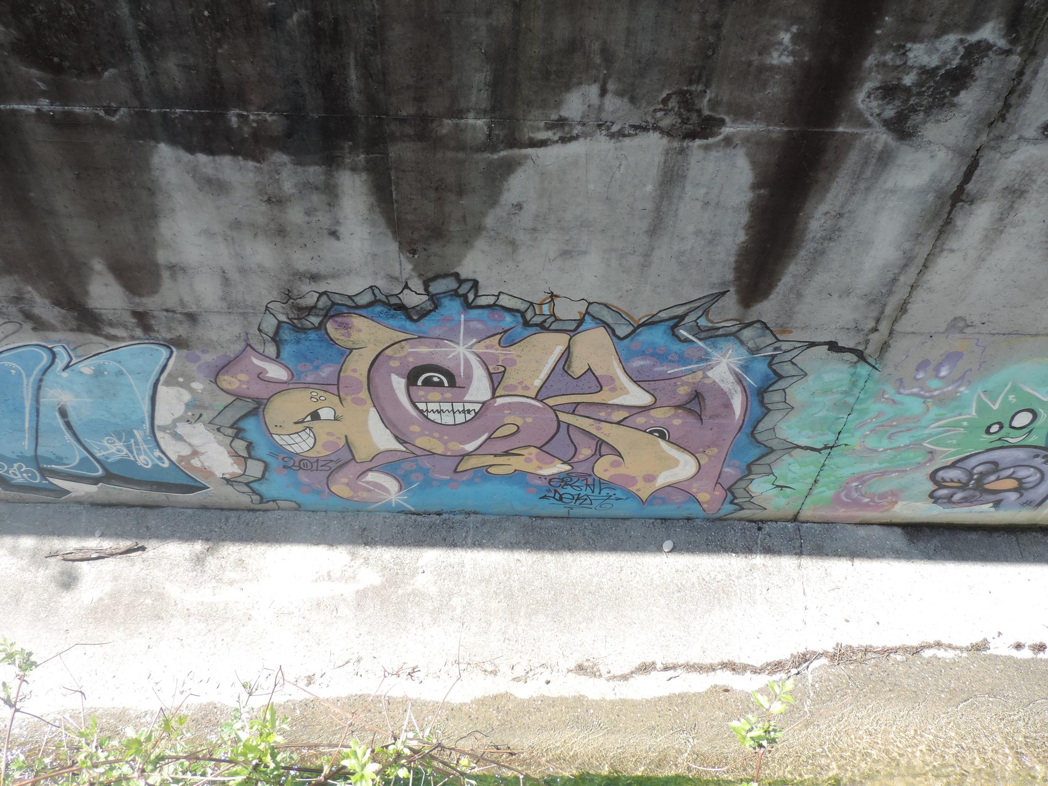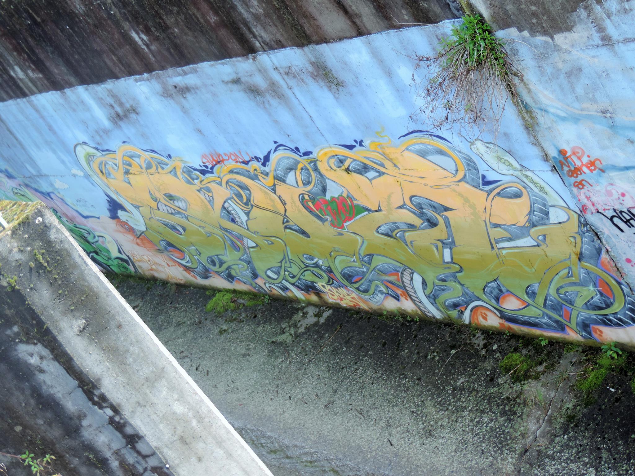 In the north of Nice in the municipality of Castagniers, between the Vallon de Massac and the Vallon de Roguez, lies the city’s necropolis with its cemetery and cremation site. The water flows from the mountain towards the foot of the Var river via the two Vallons and above the Necropolis area the inflow is channeled into a concreted canal. This can carry a lot of water at peak times, but often it is simply empty. So of water, but not of color. Because the walls are filled with great graffiti which have accumulated over many years. It is definitely a historic urban art place and off the beaten track, not easy to reach and not easy to photograph. Or you can go down into the canal, but you should bring a little more time for the complete walk from top to bottom. Here we have a collection of graffiti from the canal, it’s just a small selection. If you have your own photos of this spot, send them to info@vagabundler.com and we will add them to this page.