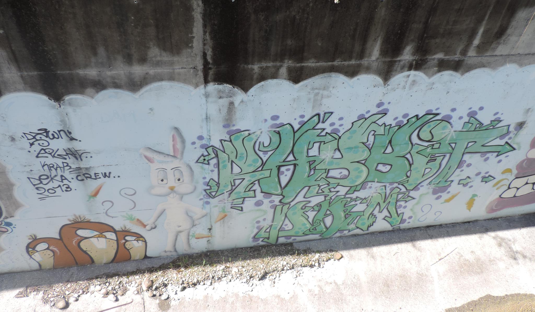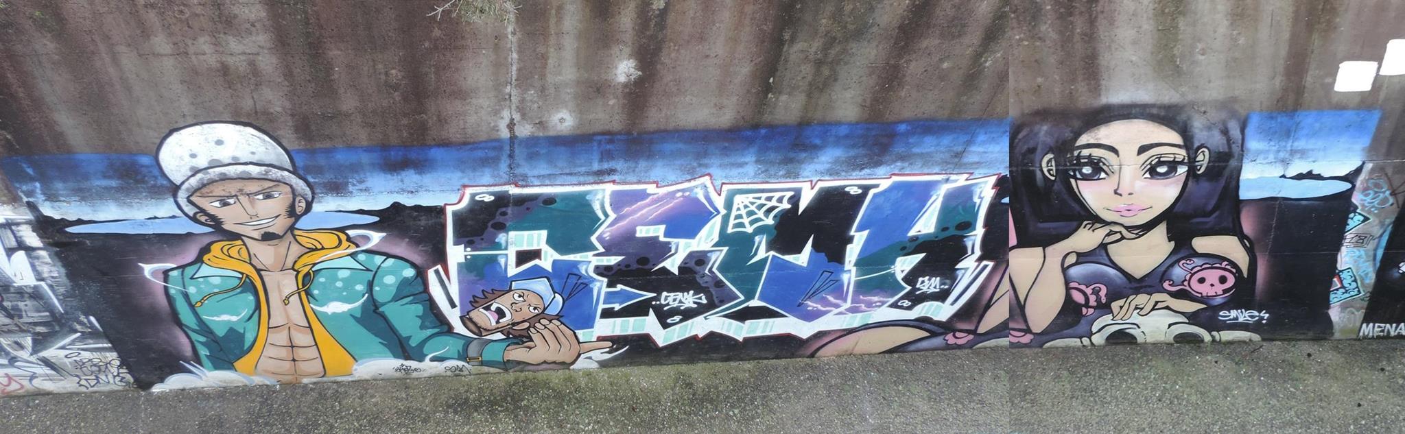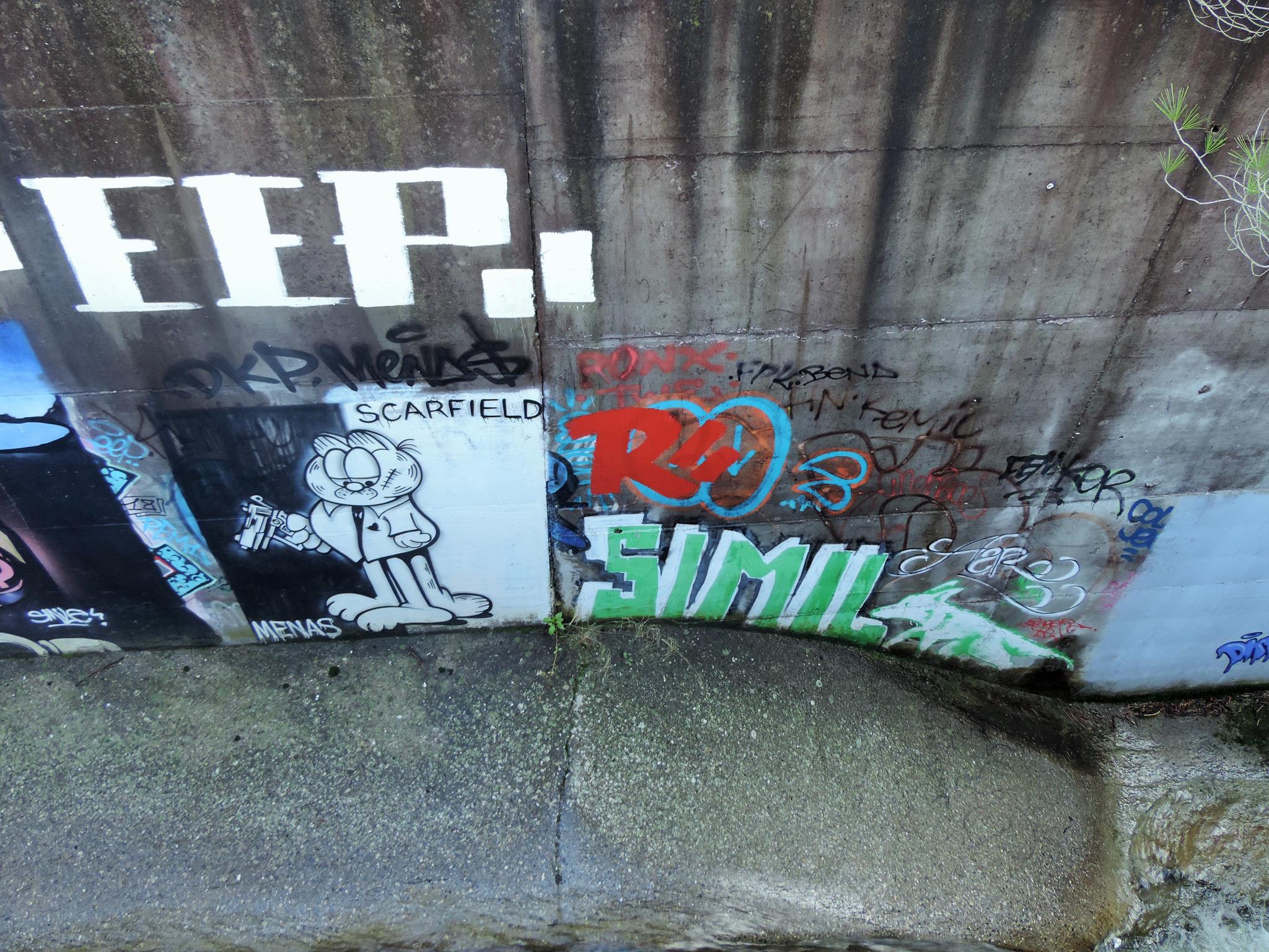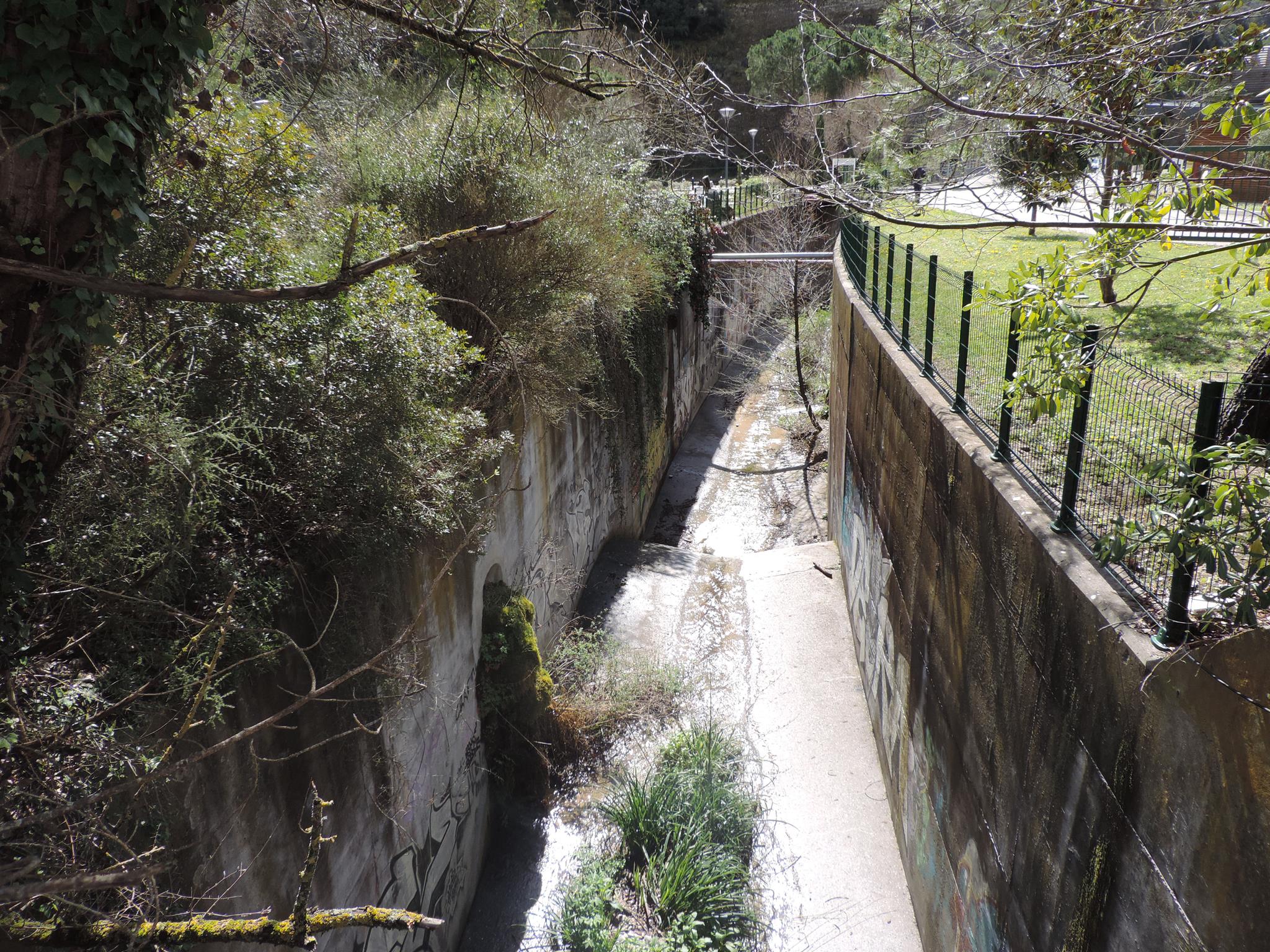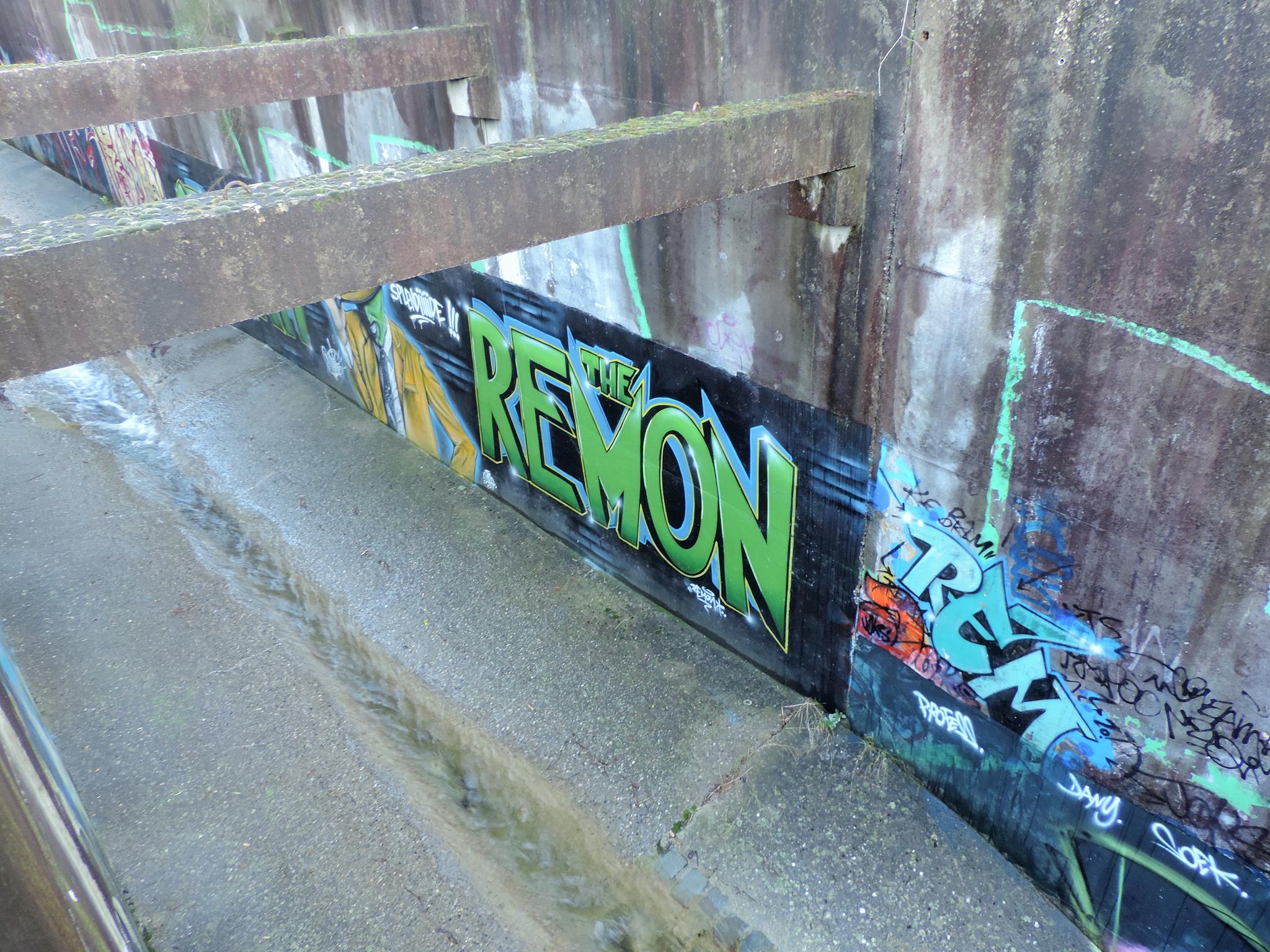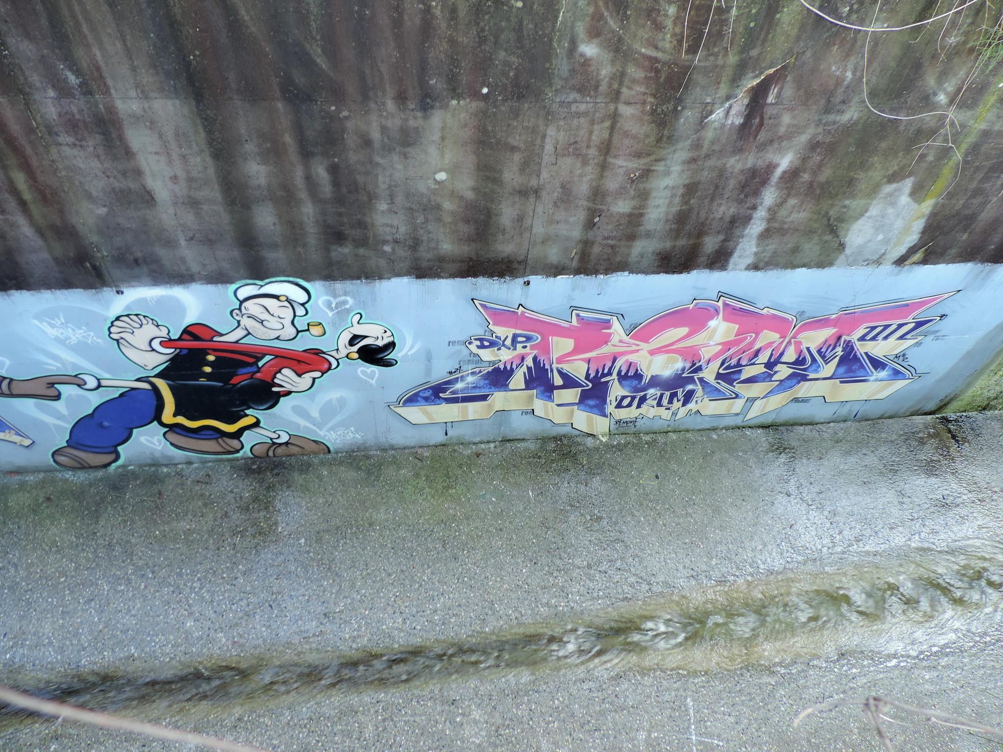 In the north of Nice in the municipality of Castagniers, between the Vallon de Massac and the Vallon de Roguez, lies the city’s necropolis with its cemetery and cremation site. The water flows from the mountain towards the foot of the Var river via the two Vallons and above the Necropolis area the inflow is channeled into a concreted canal. This can carry a lot of water at peak times, but often it is simply empty. So of water, but not of color. Because the walls are filled with great graffiti which have accumulated over many years. It is definitely a historic urban art place and off the beaten track, not easy to reach and not easy to photograph. Or you can go down into the canal, but you should bring a little more time for the complete walk from top to bottom. Here we have a collection of graffiti from the canal, it’s just a small selection. If you have your own photos of this spot, send them to info@vagabundler.com and we will add them to this page.