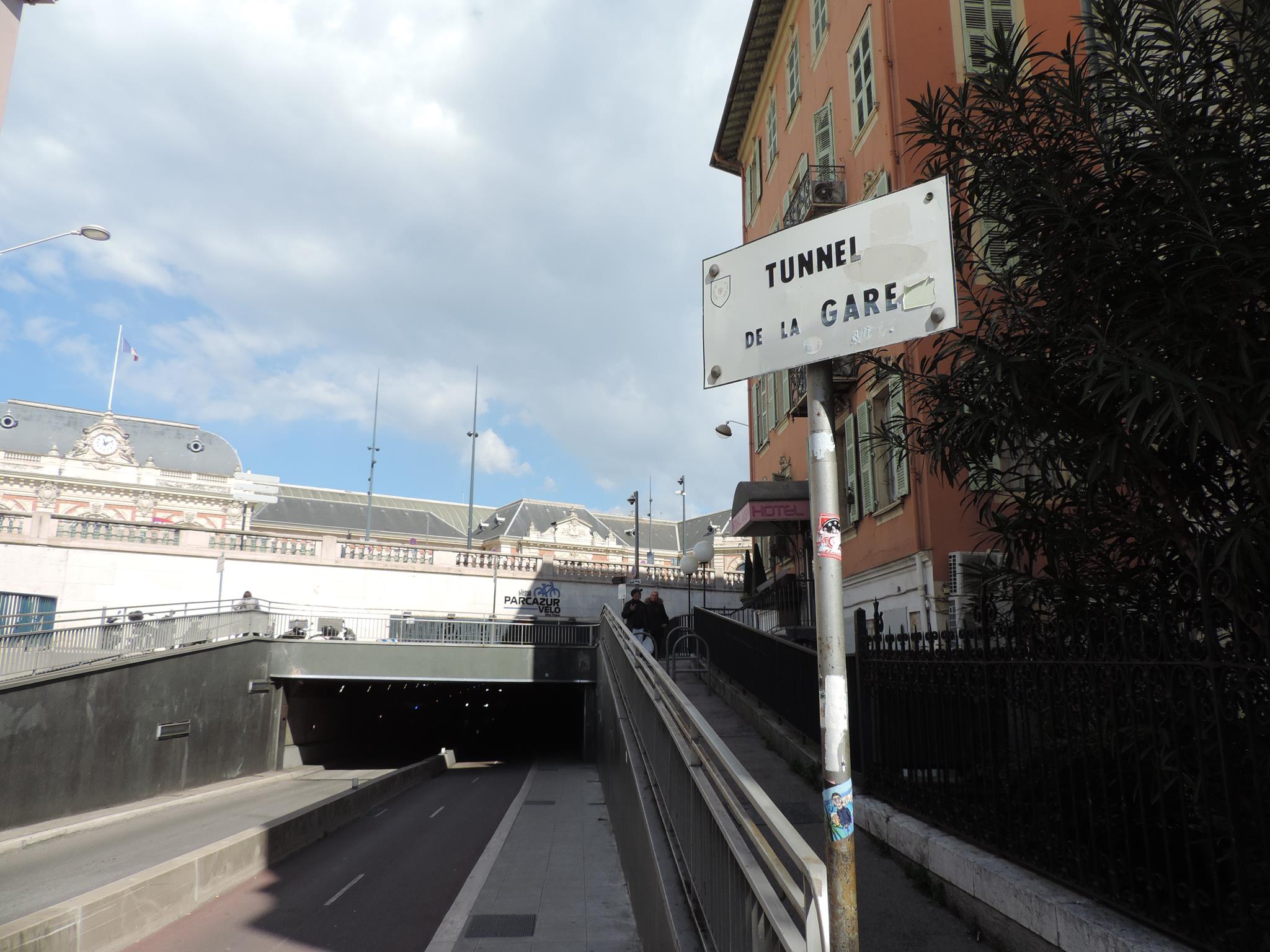 From Rue de Villeneuve in the north, a single-lane road tunnel runs under the main train station to Avenue Durante in the south, the „Tunnel de la Gare“. Cars drive through it, but there is also a cycle lane and a walkway. For many years, pedestrians tended to avoid the tunnel because it was a dark and scary passageway, especially at night and it’s generally a bit weird around a central station anyway. But a little color and creativity could change that. The great local artist OTOM was commissioned by the City of Nice in spring of 2020 to create a mural throughout that tunnel and he developed a special concept for this named „Regards“.