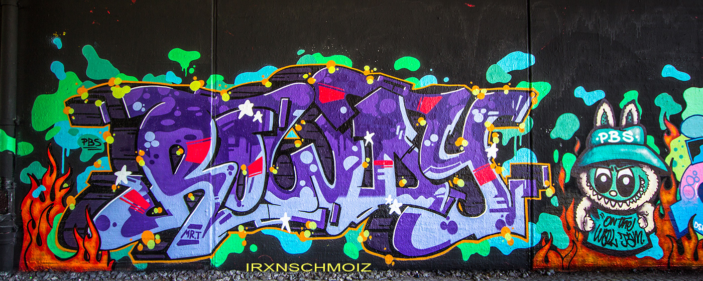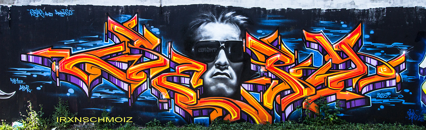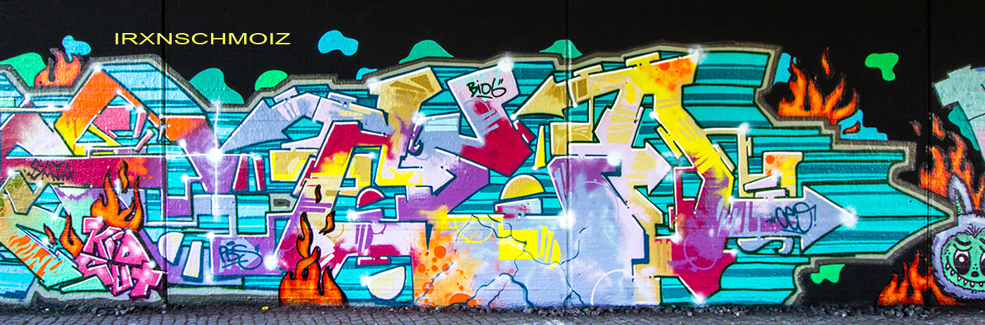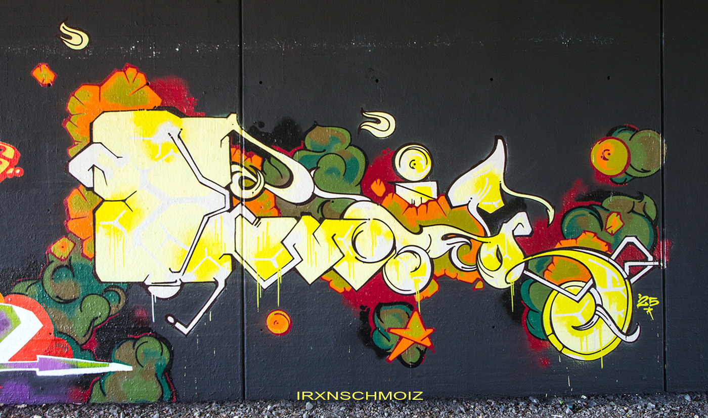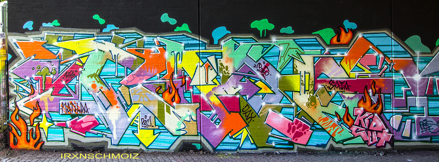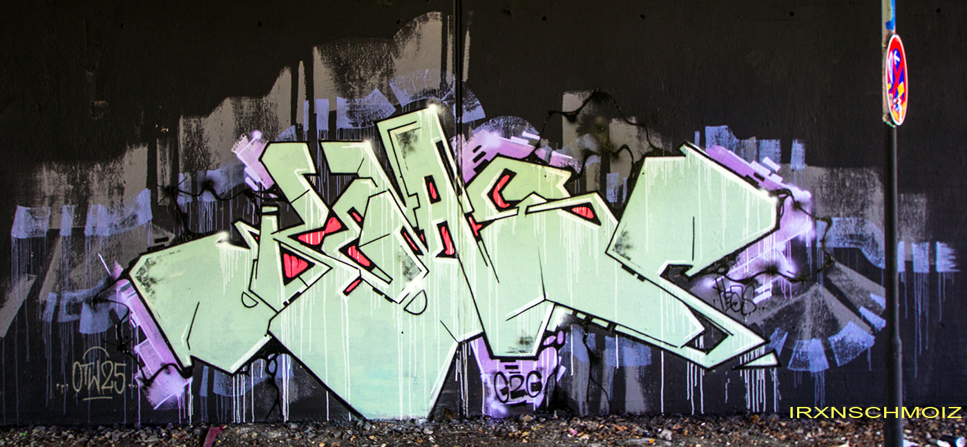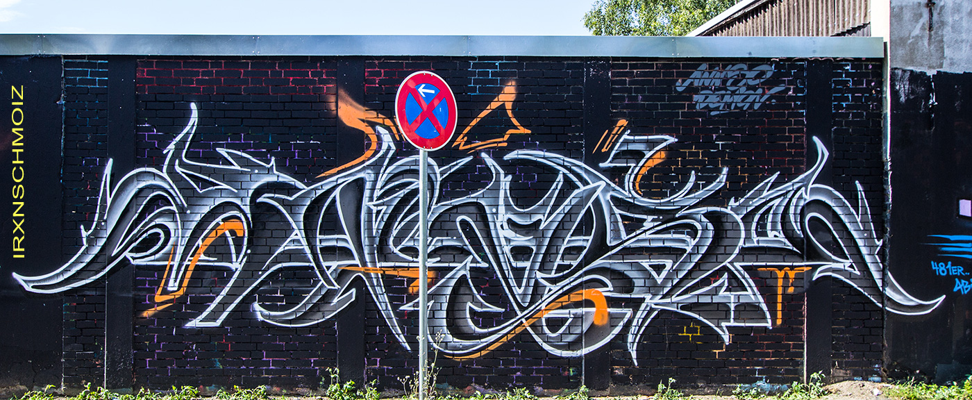 In the Westliches Ringgebiet district at the Westbahnhofstrasse below the bridge of Münchenstrasse and the surrounding walls, there is a fantastic Hall of Fame in a class of its own. The hall consists of two opposing bridge plinths with smooth formwork concrete and an approx. 100 m long unplastered wall as an extension of one of the plinths. The area under the bridge was developed by the city as a small event location with tiered seating platforms for watching and lingering, as well a bicycle path crosses the middle. The quality of the pieces is usually above average. The spot often surprises with unconventional styles in fresh colors in masterly execution and is certainly – next to the Ihme Hall and Glocksee Hall in Hannover – one of the best in Lower Saxony, but is topped by the Hall at the Skatepark, which is only a few minutes‘ walk away! The hall can be reached by streetcar line 5 from Braunschweig main station in around 20 minutes and a further 3 minutes on foot from the „Am Jödebrunnen“ station. There are two more individual pages for the artworks from the Hola Utopia! festival in 2024 and for murals and streetart around Braunschweig. – Irxnschmoiz