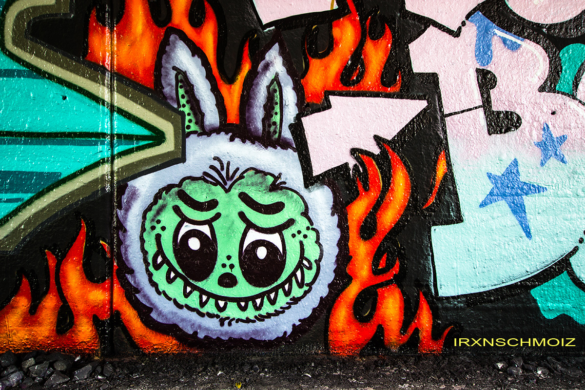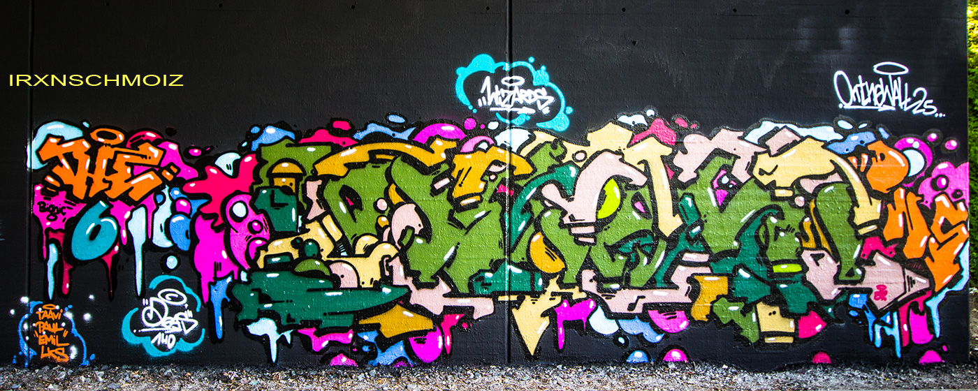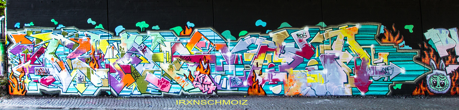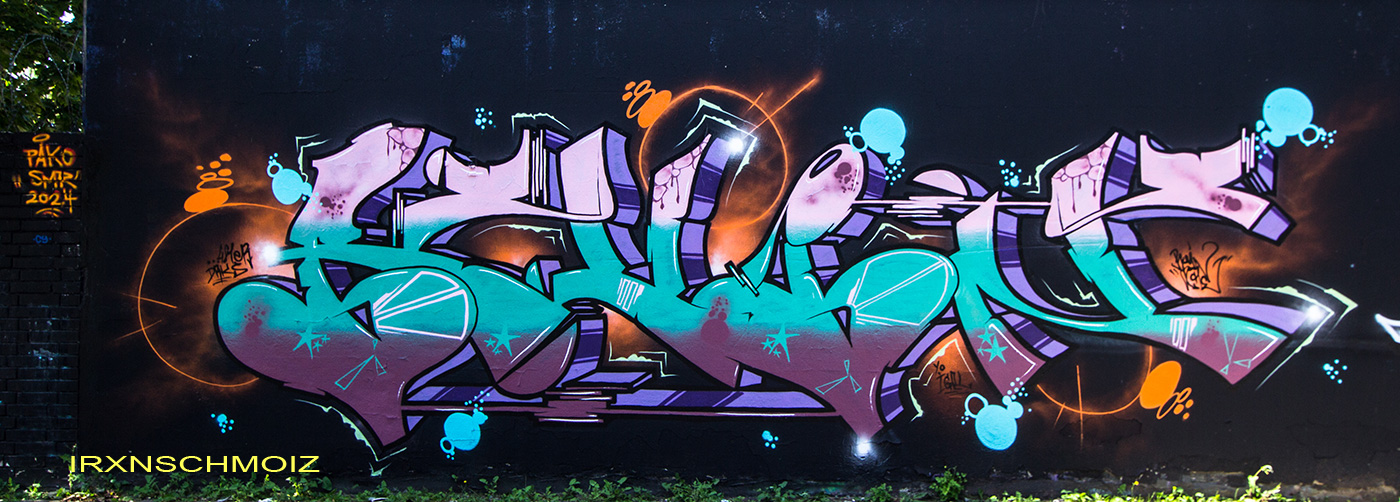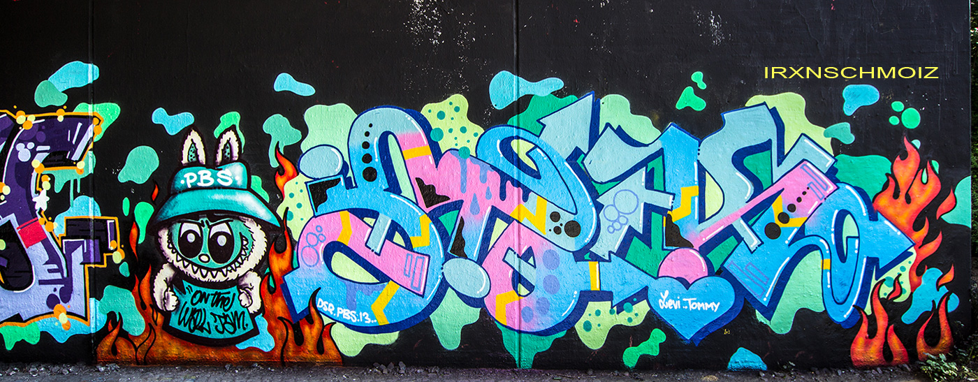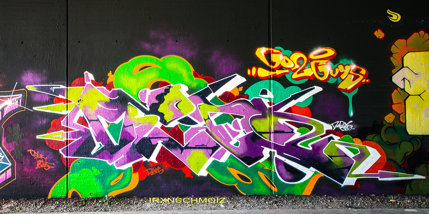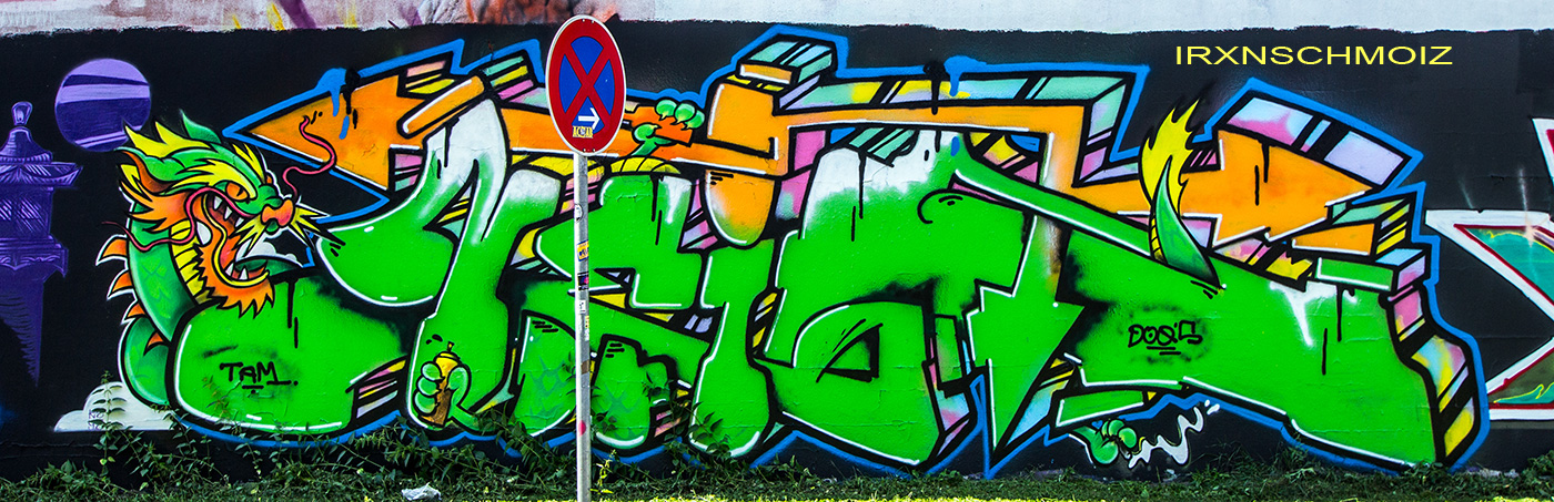 In the Westliches Ringgebiet district at the Westbahnhofstrasse below the bridge of Münchenstrasse and the surrounding walls, there is a fantastic Hall of Fame in a class of its own. The hall consists of two opposing bridge plinths with smooth formwork concrete and an approx. 100 m long unplastered wall as an extension of one of the plinths. The area under the bridge was developed by the city as a small event location with tiered seating platforms for watching and lingering, as well a bicycle path crosses the middle. The quality of the pieces is usually above average. The spot often surprises with unconventional styles in fresh colors in masterly execution and is certainly – next to the Ihme Hall and Glocksee Hall in Hannover – one of the best in Lower Saxony, but is topped by the Hall at the Skatepark, which is only a few minutes‘ walk away! The hall can be reached by streetcar line 5 from Braunschweig main station in around 20 minutes and a further 3 minutes on foot from the „Am Jödebrunnen“ station. There are two more individual pages for the artworks from the Hola Utopia! festival in 2024 and for murals and streetart around Braunschweig. – Irxnschmoiz