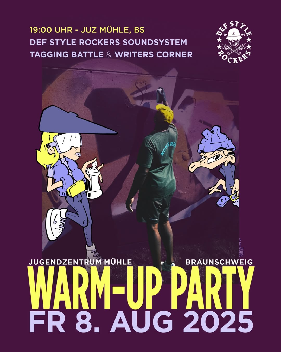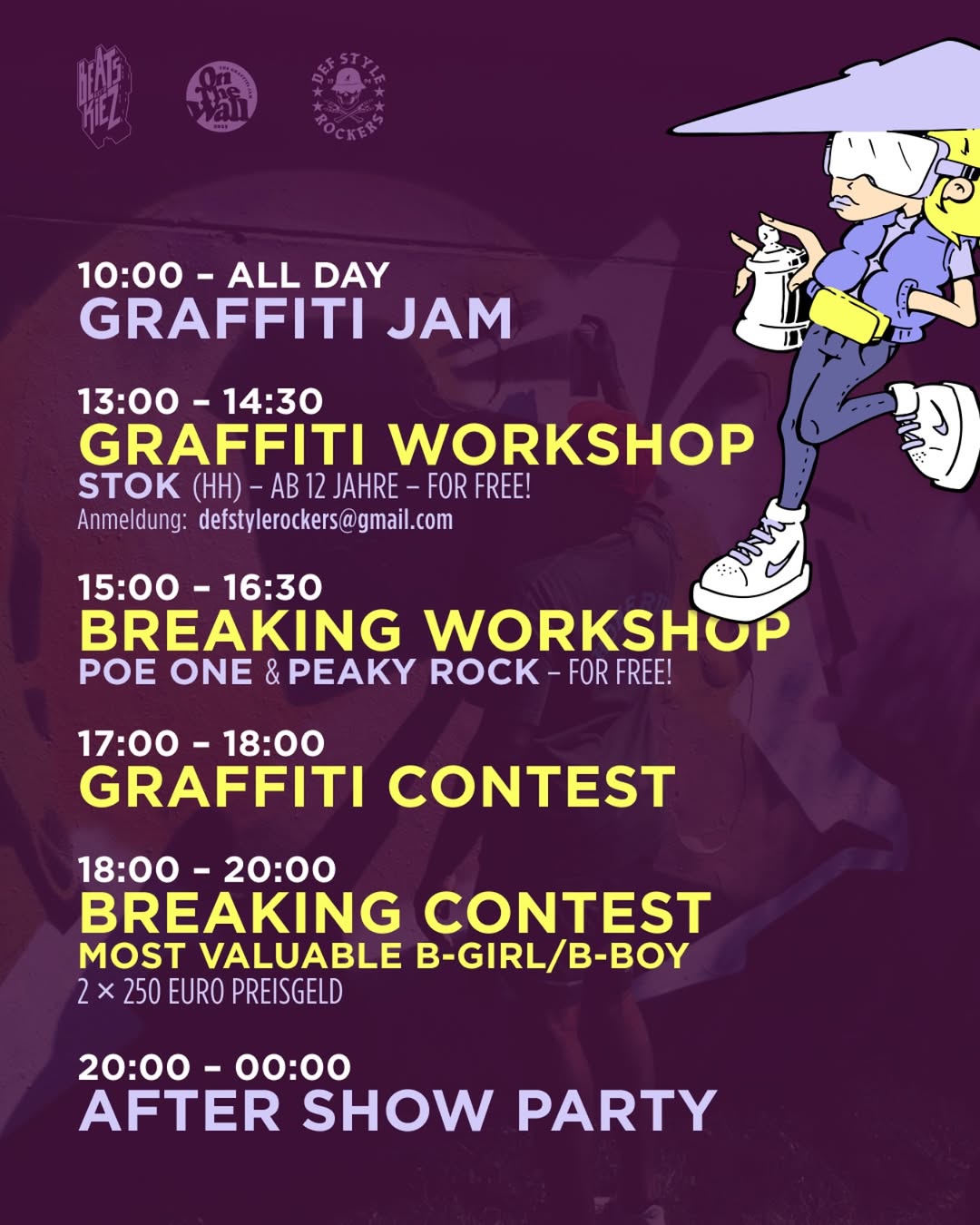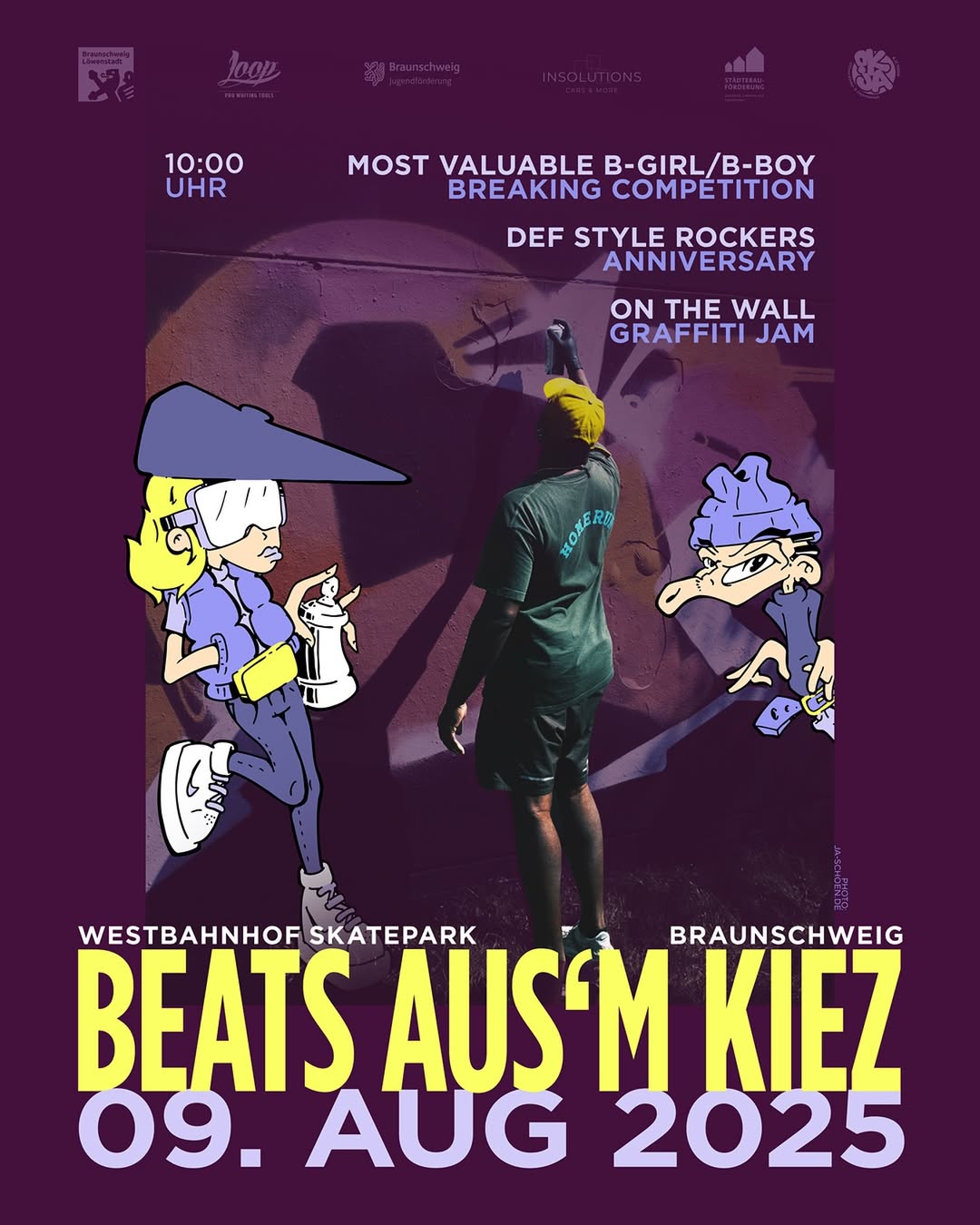 On August 9th in 2025, the fantastic graffiti jam ON THE WALL took place again at two locations in Braunschweig. In addition to the Westbahnhof Hall, urban artworks were also created at the Skate Park Hall. The event kicked off with a warm-up party on August 8th, followed by the annual „Most Valuable B-Girl/B-Boy Breaking Competition“ hosted by BEATS AUS’M KIEZ on the main day. The graffiti part was organized by the DEF STYLE ROCKERS and KEAS with other members of the G2G CREW aka GO2GUYS and the support of the youth center JUZ MÜHLE.
