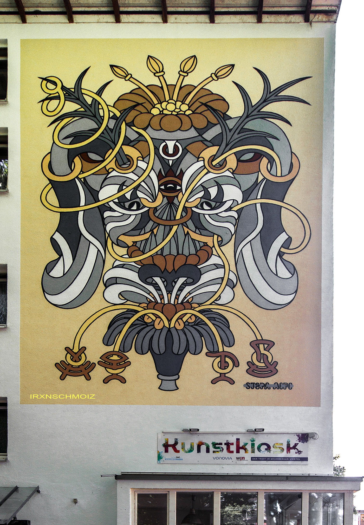 STEPA AIFO is a muralist and post-graffiti artist. In his work, he explores legends and modern myths. He creates mystical beings, spirits, and helper figures. Stepa Aifo believes that art should save us from the truth. Therefore, he consciously distances himself from the literal representation of reality—and seeks access to another space, filled with new life forms, symbols, interconnections, and clues. His visual style is characterized by a passion for architecture and archaeology, typography, and natural forms.  –  Mural City