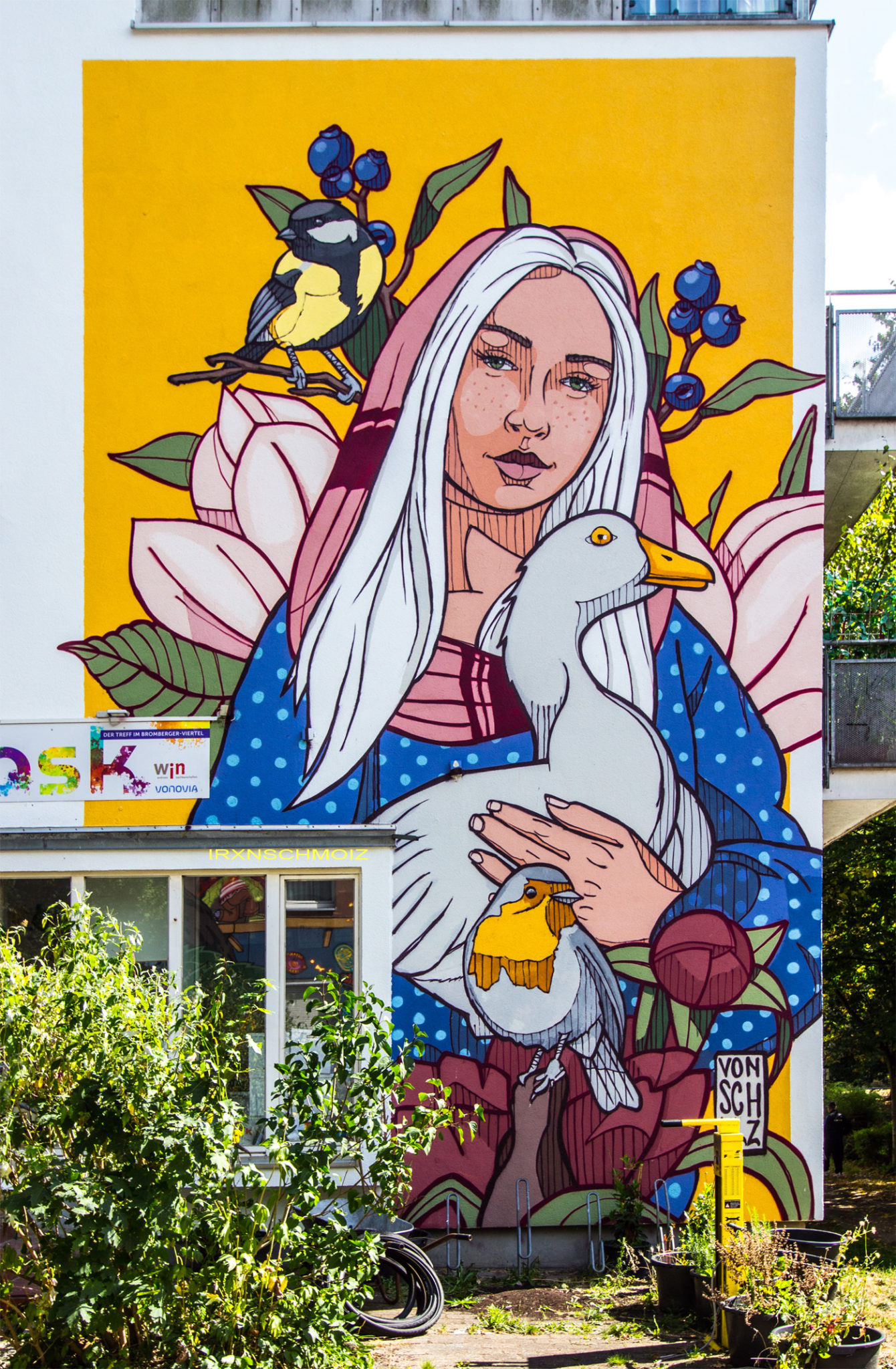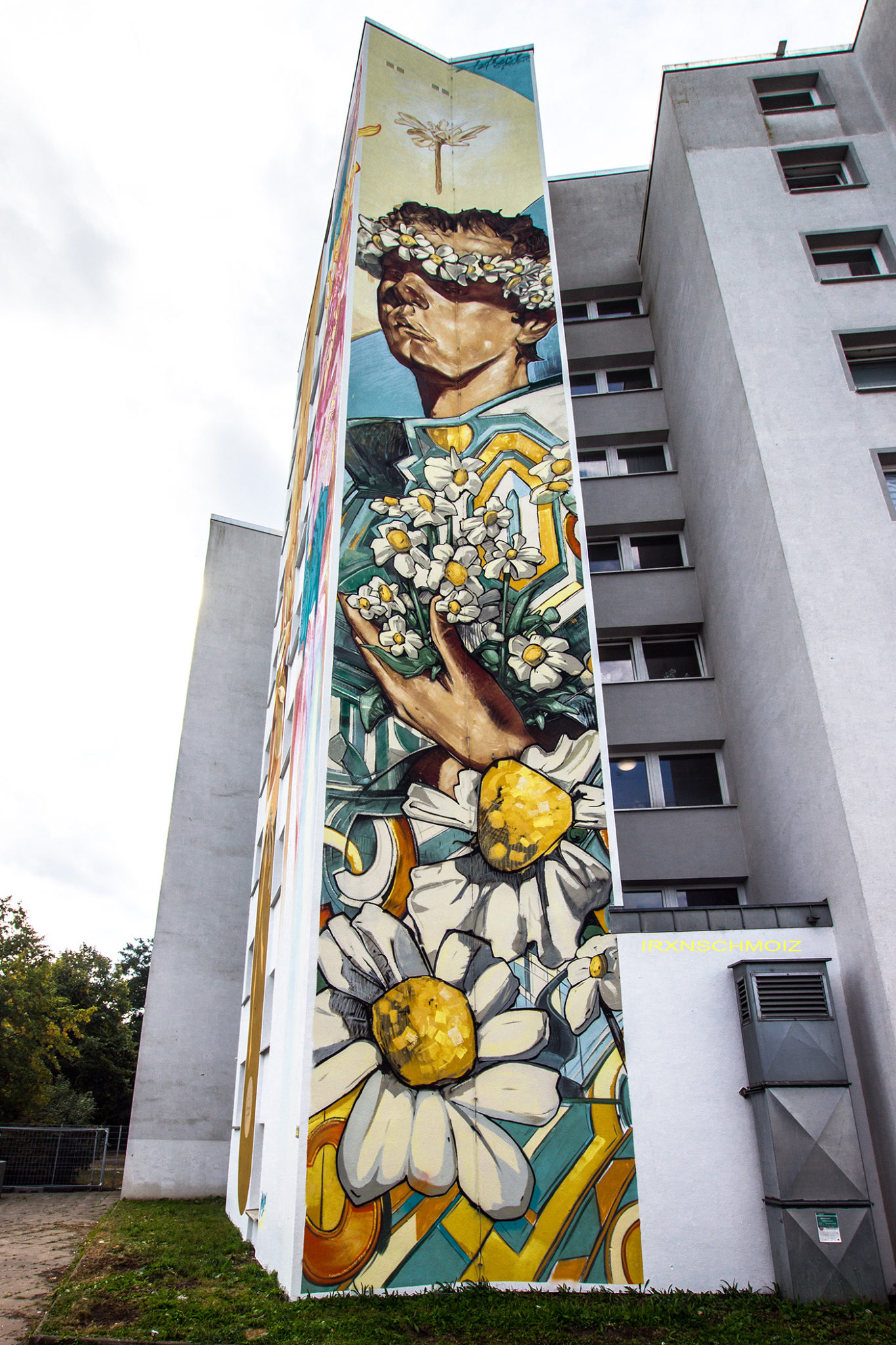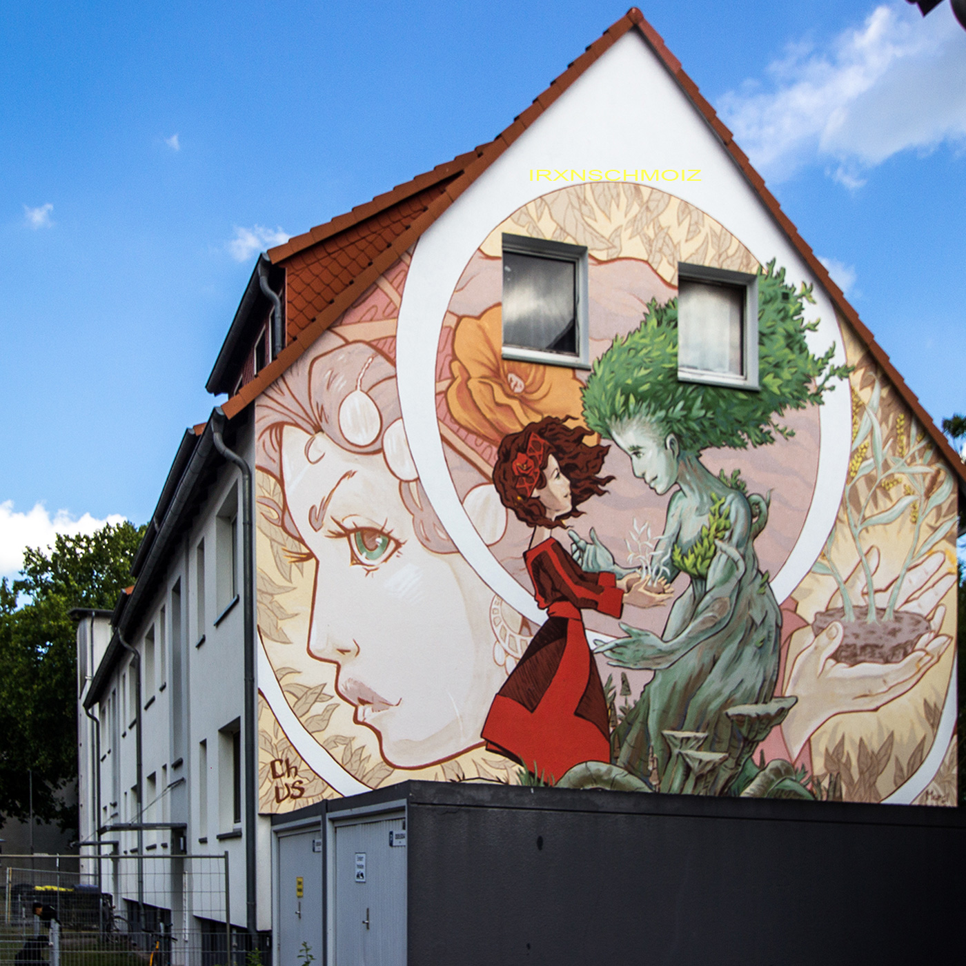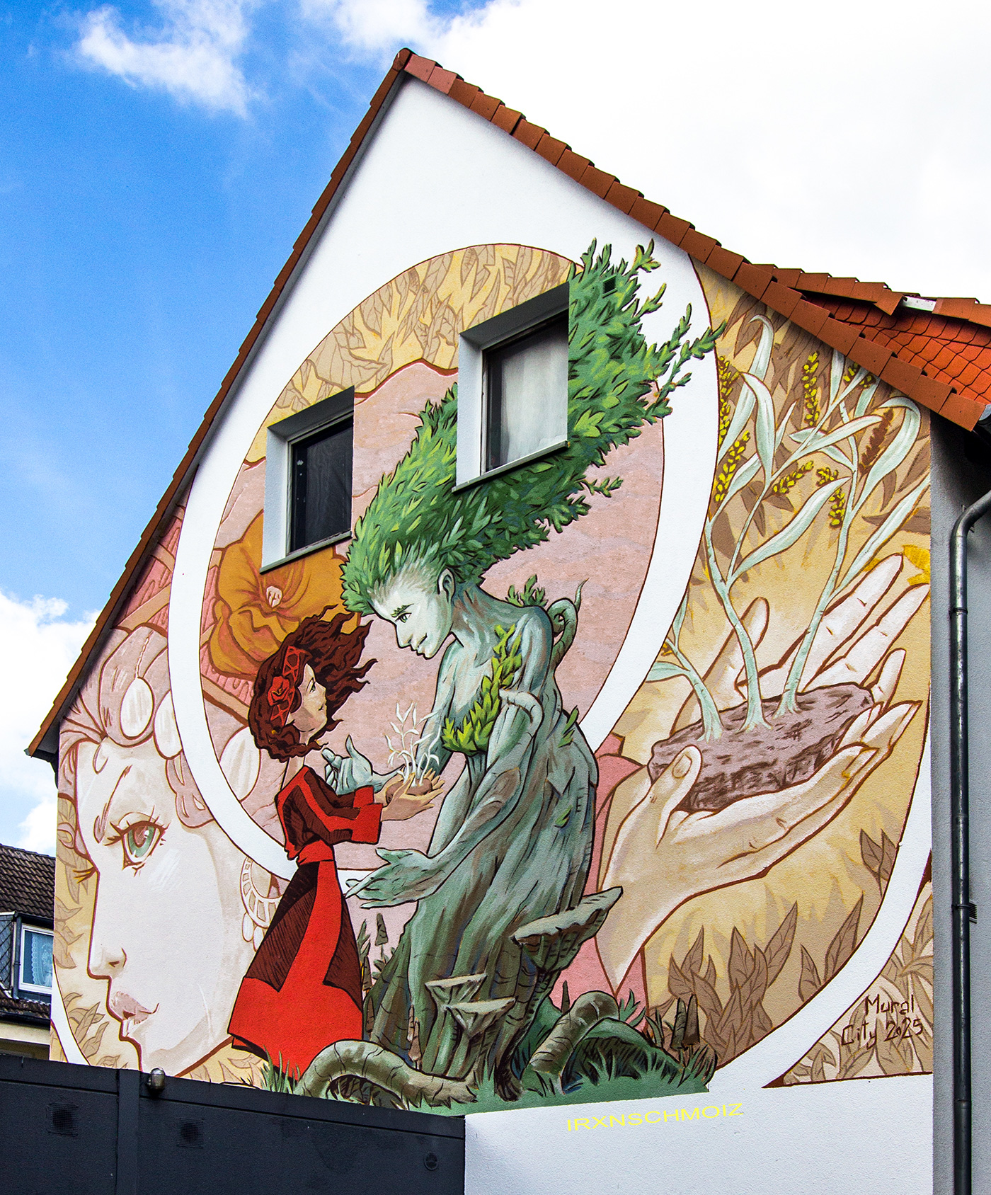 The mural is structured like a triptych. At the center: the encounter of a young girl with a magical, nature-loving figure. In a welcoming gesture, she receives a gift from the „green lady“ – young, green, sprouting trees. Bright colors and strong contrasts draw the eye to this scene. The side panels are more subdued: on the left, a portrait of the girl; on the right, the meeting hands from which new life grows. Across the upper edge, in the shape of a seed, a root pattern extends to the main figures – a symbol that nurtured roots and the right seeds allow a better future to grow.  –  CHUS