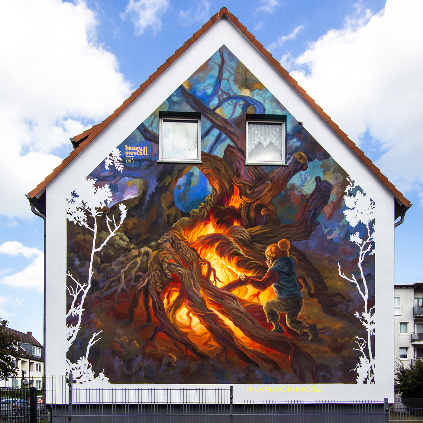 „As a child, I once said a tree is a living being – and I was told that wasn’t true. I disagreed then – and I still do today. This mural captures precisely that childlike instinct: A child kneels before a glowing tree heart, sensing the wonder within. „The Heart of the Forest“ is a tribute to the quiet vitality of nature. It invites us to pause, listen – and remember that the world is much more alive than we are often led to believe.“  –  LINA BESEDINA