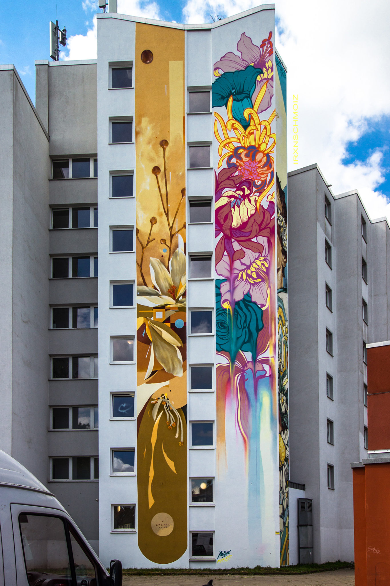 „In this mural, melting flowers symbolize the fragility of nature in the face of climate change. Their slow decay becomes a metaphor for the passing of time—and with it, the disappearance of the ecosystems upon which we depend. As an artist, I see my role not only as creating images, but also as bearing witness to the changes taking place in our world. This work doesn’t aim to provide answers—rather, it aims to raise awareness through color, movement, and emotion.“  –  NERONE