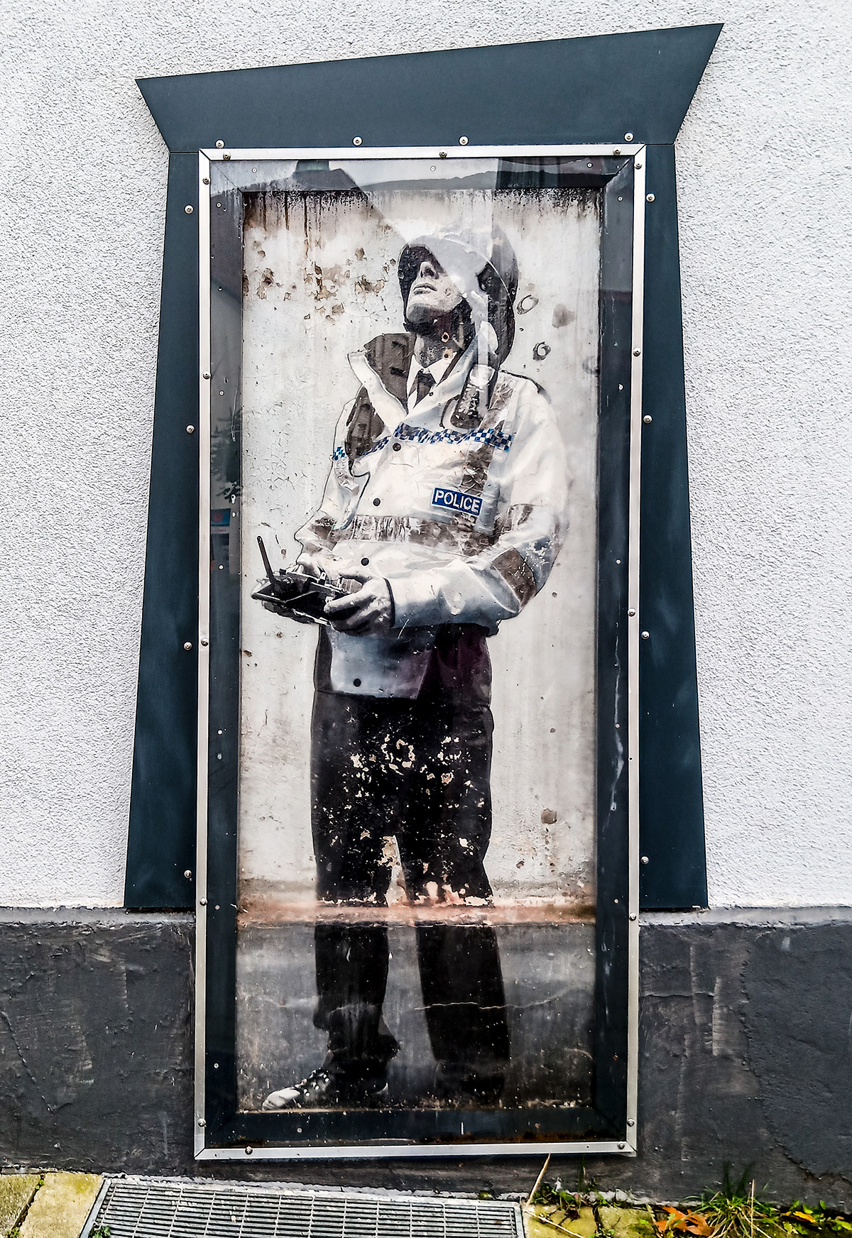 This work was created in 2013 during the HANSE STREETARTWORKS urban art happening, based on a template by the famous British stencil artist BOXI, who is known for his portrait works of people from everyday life, but slightly altered with a message and thought-provoking. The work is protected from weather and damage by a glass pane.