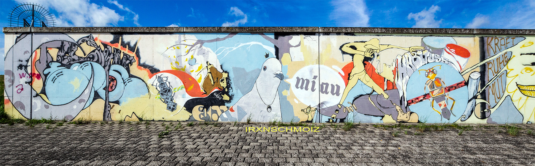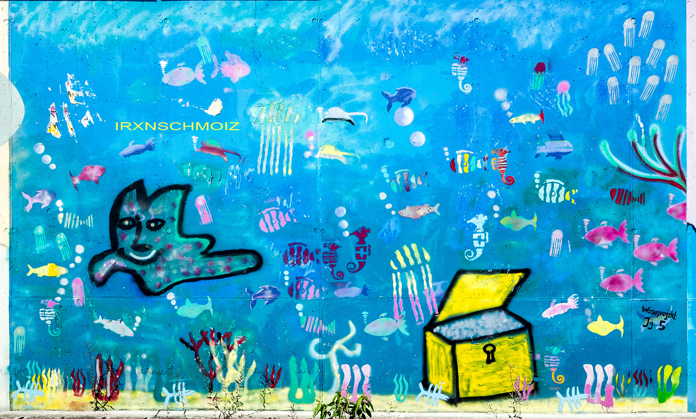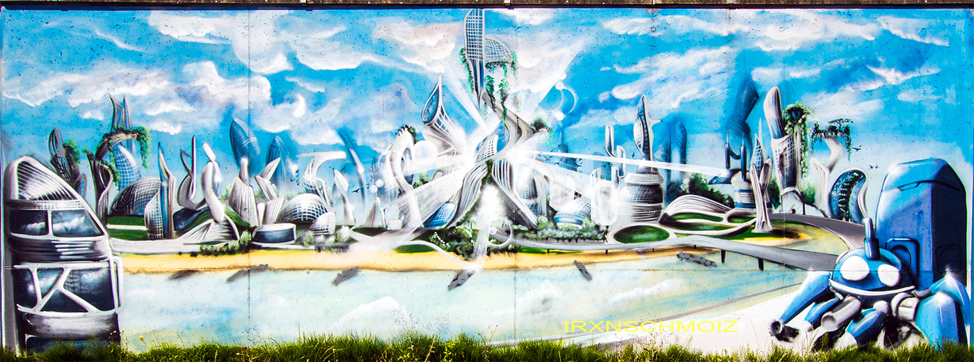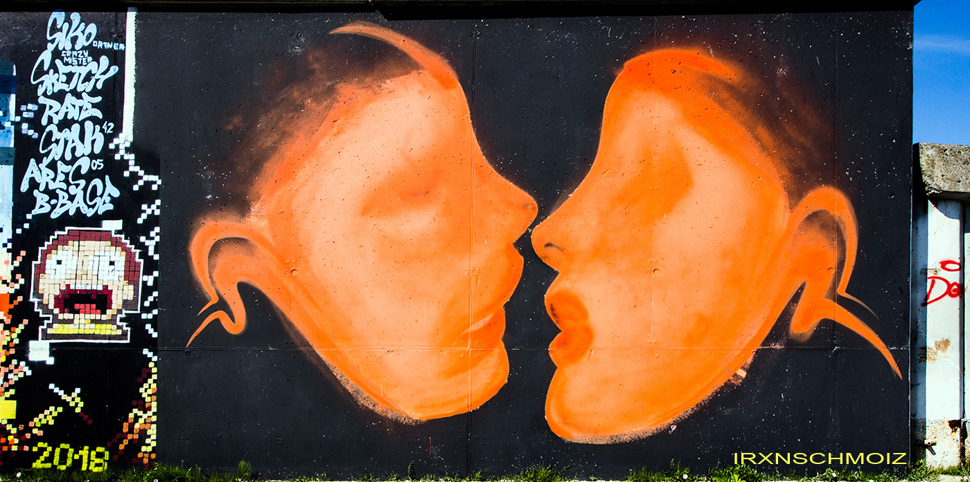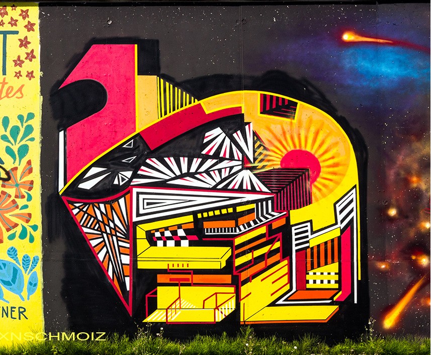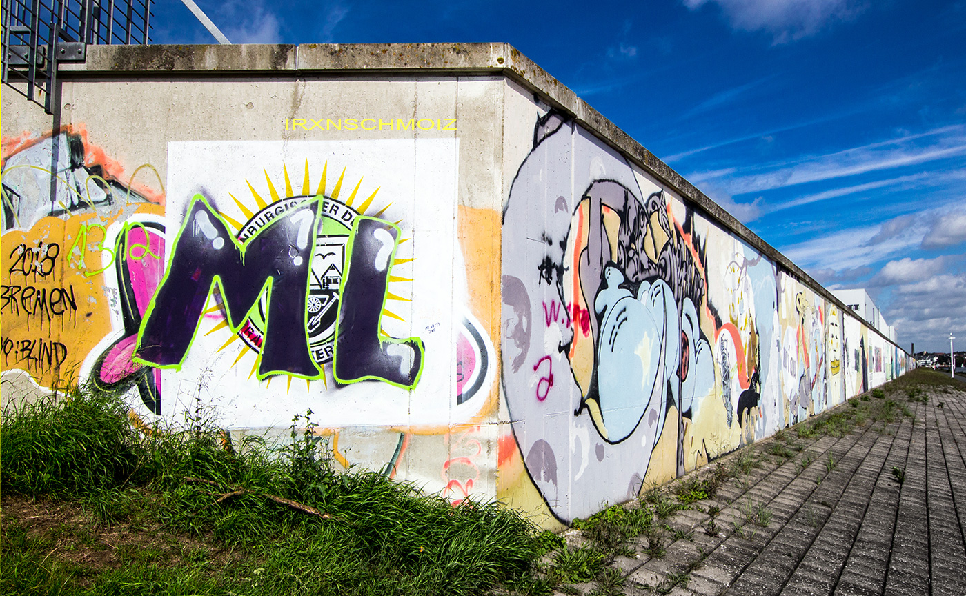 On this page, you will find the artworks from the FARBFLUT FESTIVAL in 2018 in the order in which they were created on the long wall, from south to north. The northern section runs from 53.160483, 8.623277 to 53.155256, 8.624222 with 585 meters long, followed by an unpainted section with 65 meters long, and the southern section runs from 53.154667, 8.624316 to 53.152240, 8.624713 with 271 meters. This results in a painted area of 856 meters with around 3000 m². Clicking on the artist’s name will take you to a subpage with more photos and sometimes videos of the artwork, along with comprehensive information about its creators. For more information about the event and an alphabetical sorting of the artists, take a look at the main page of the WESER SIDE GALLERY.