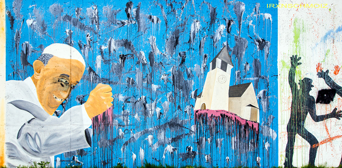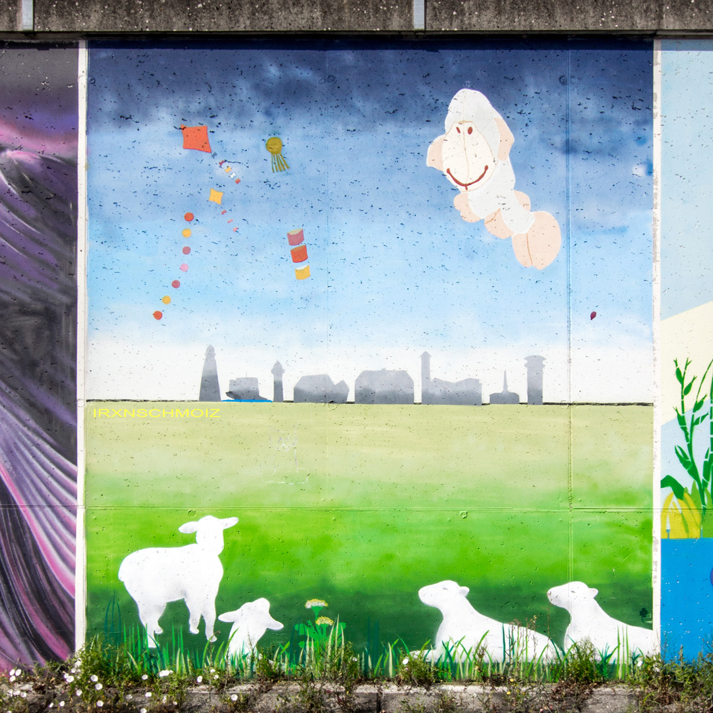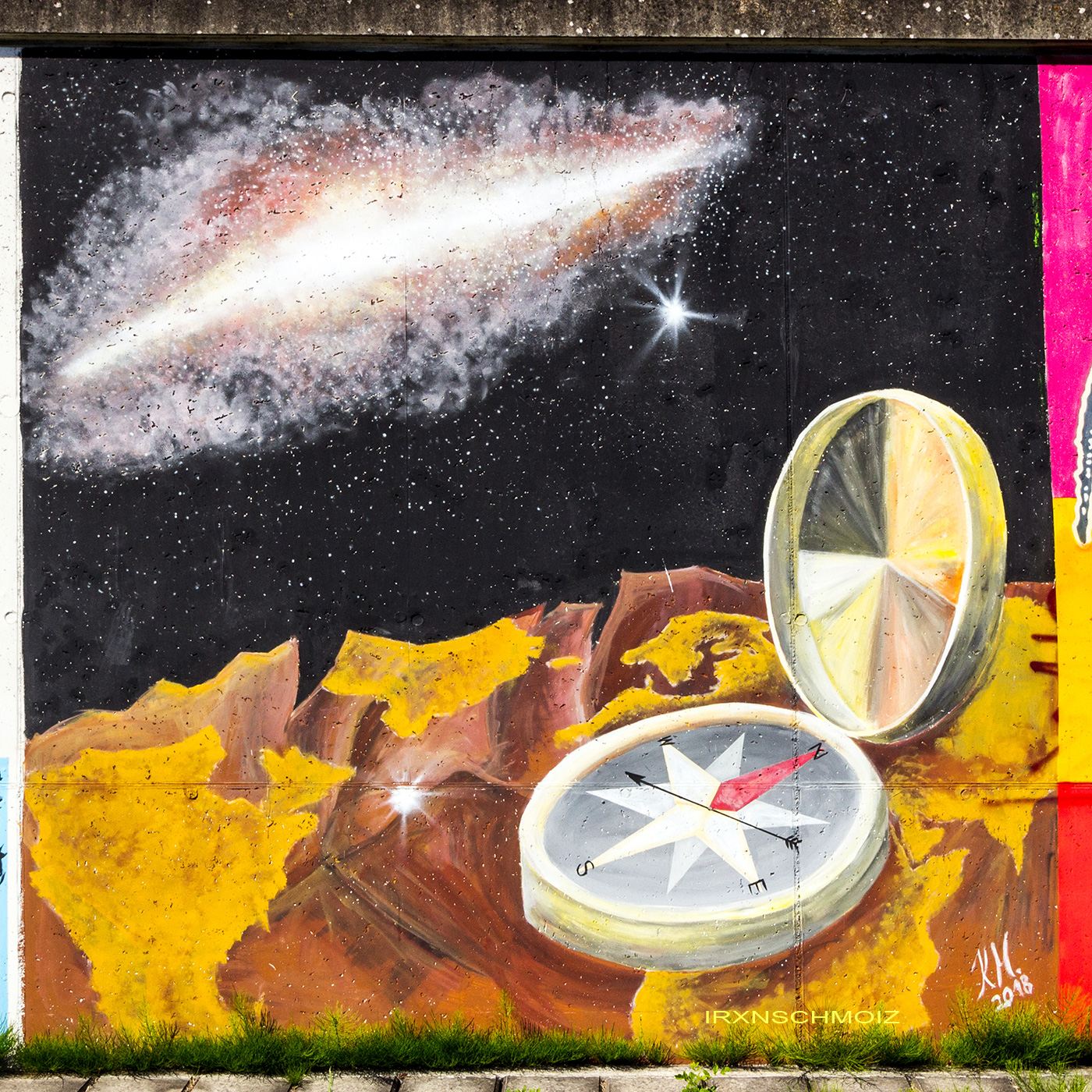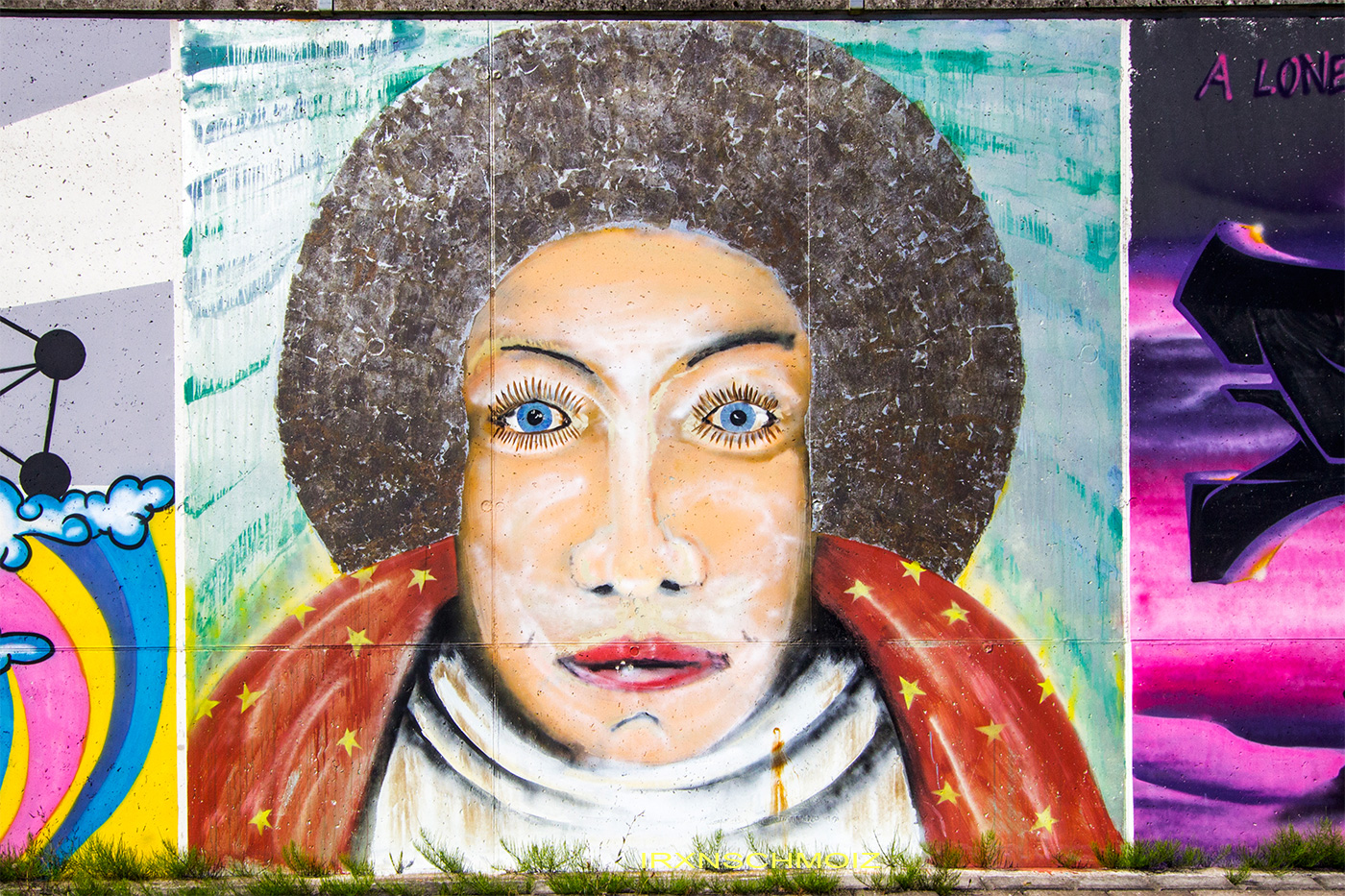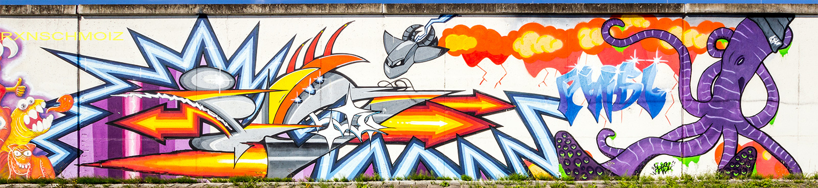 On this page, you will find the artworks from the FARBFLUT FESTIVAL in 2018 in the order in which they were created on the long wall, from south to north. The northern section runs from 53.160483, 8.623277 to 53.155256, 8.624222 with 585 meters long, followed by an unpainted section with 65 meters long, and the southern section runs from 53.154667, 8.624316 to 53.152240, 8.624713 with 271 meters. This results in a painted area of 856 meters with around 3000 m². Clicking on the artist’s name will take you to a subpage with more photos and sometimes videos of the artwork, along with comprehensive information about its creators. For more information about the event and an alphabetical sorting of the artists, take a look at the main page of the WESER SIDE GALLERY.