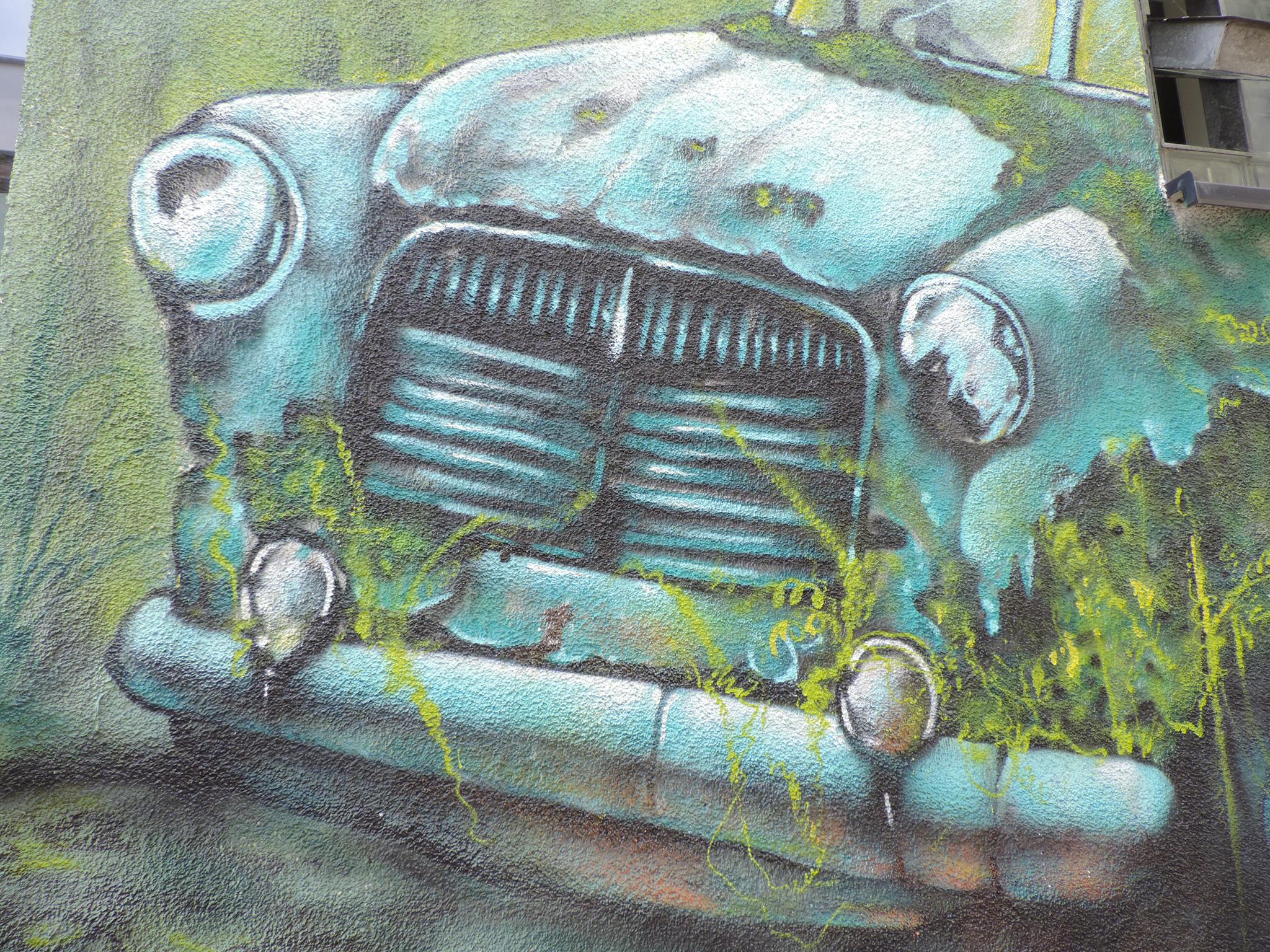 This great artwork is part of a collaboration mural about and underwater concept scenery with ocean creatures, created by artists from Brazil and Mexico. The character on the left riding the sea dragons was made by RAIOS, the octopus monkey is from GNOK, the sunken bus was made by DELEON, the water creature following to the upper right with an orange head was made by KBÇA, the mermaid below is from CABULOSO and the crab rider on the right side of the building was made by MIGUEL MOLINA
