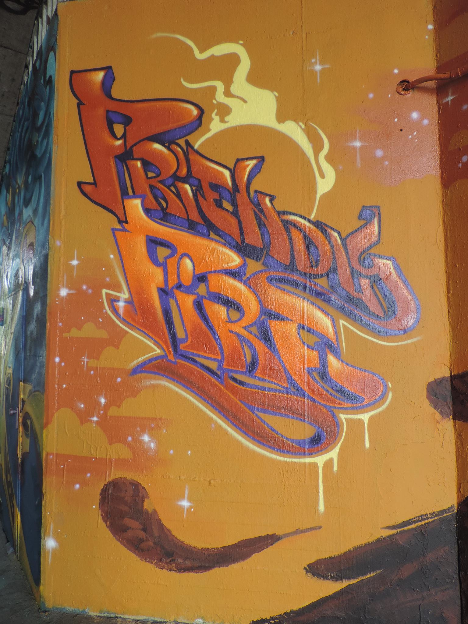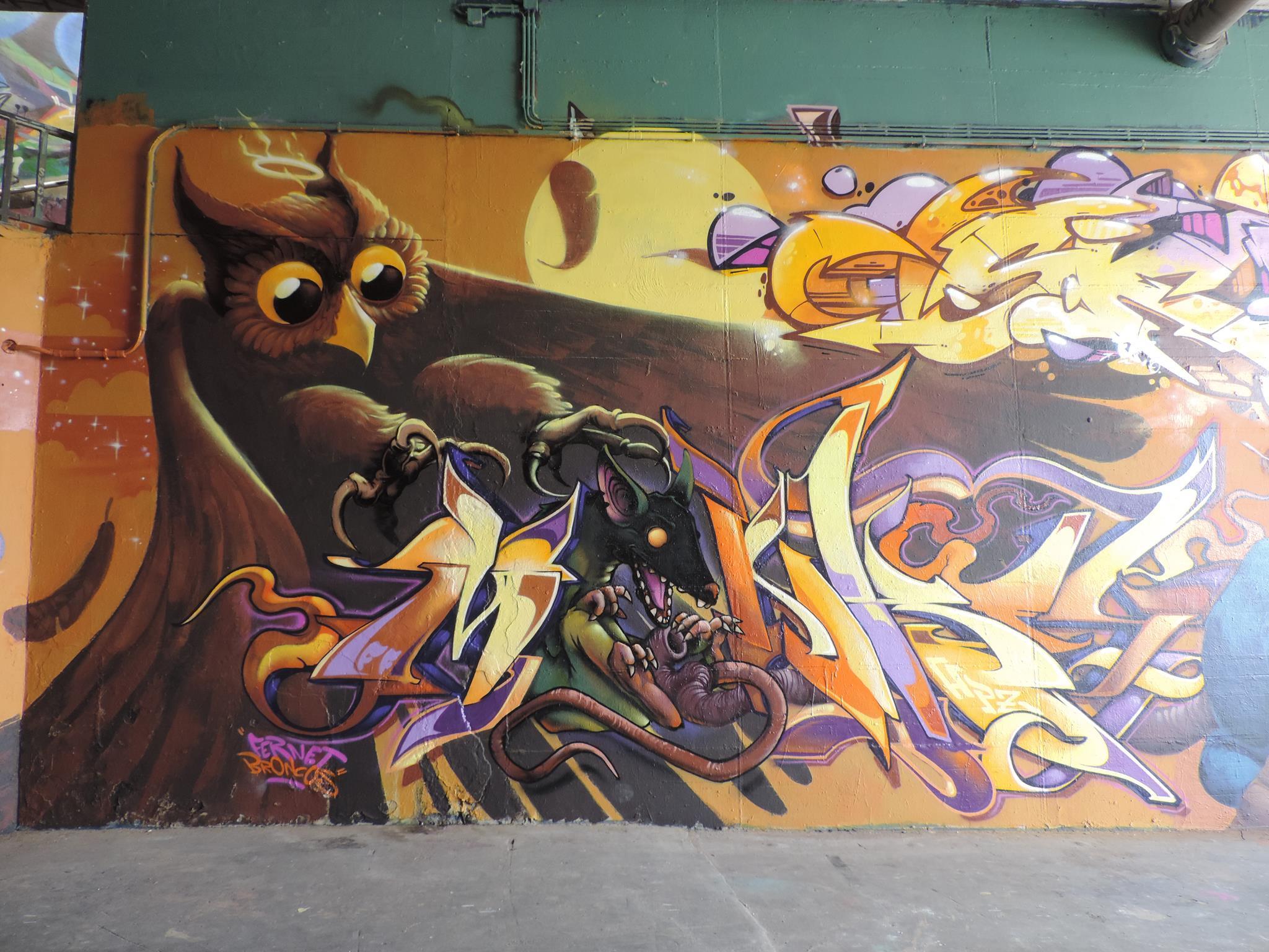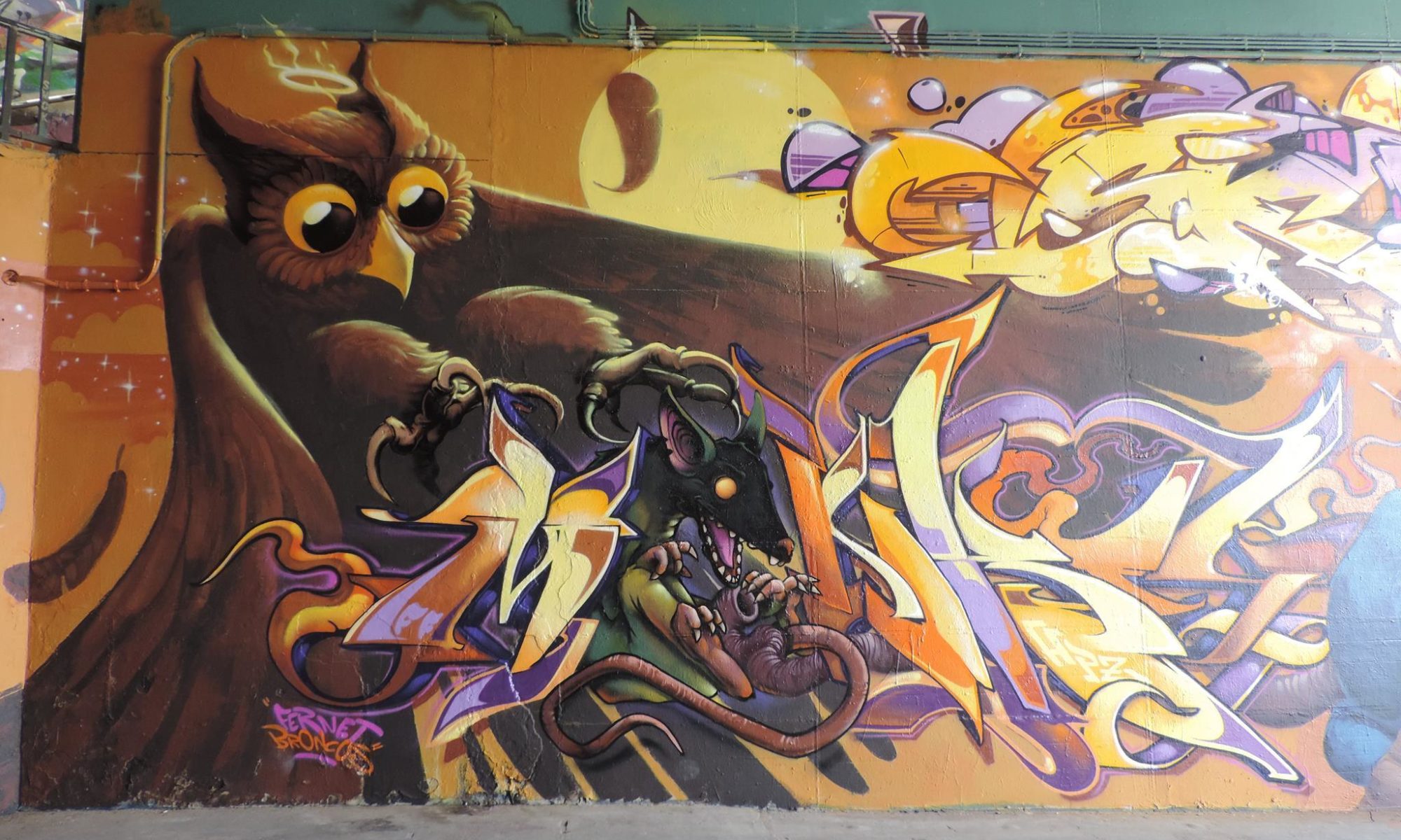 This character is part of a magnificent thematic concept wall on the south-east facade of the main tunnel. The fantastic collaboration mural was created by the artists MONKEY, PIXELJUICE, DOE, SKER, ANDREY PALVAL and ELEVENADE. Each participant sprayed individual works, but the background was done together resulting in an amazing masterpiece.