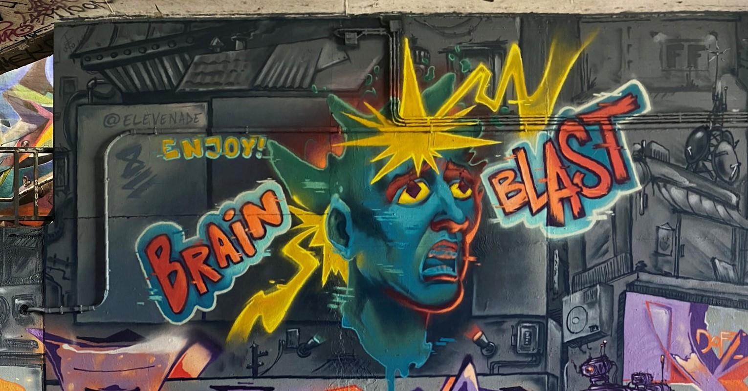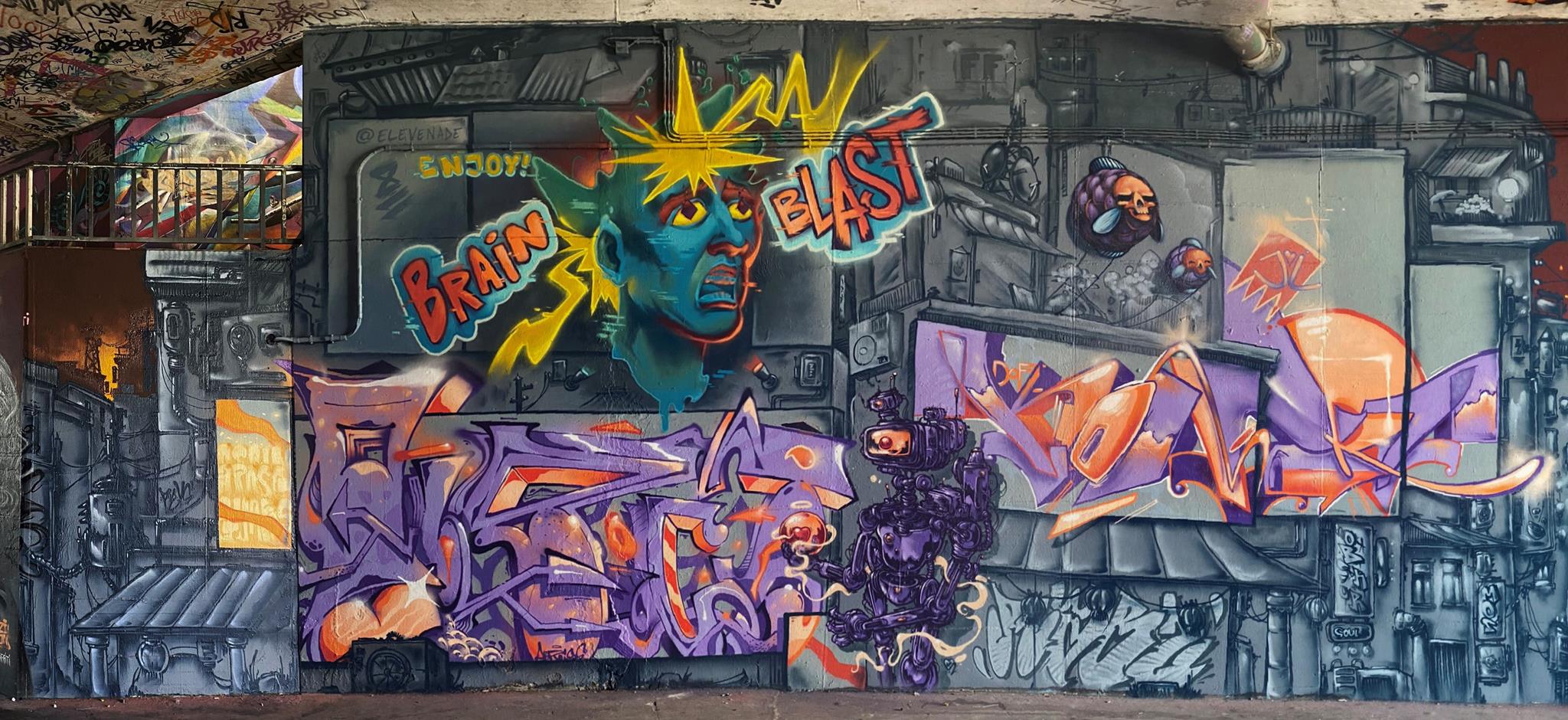 This character is part of a magnificent thematic concept wall on the south-east facade of the main tunnel. The fantastic collaboration mural was created by the artists MONKEY, PIXELJUICE, DOE, SKER, ANDREY PALVAL and ELEVENADE. Each participant sprayed individual works, but the background was done together resulting in an amazing masterpiece.