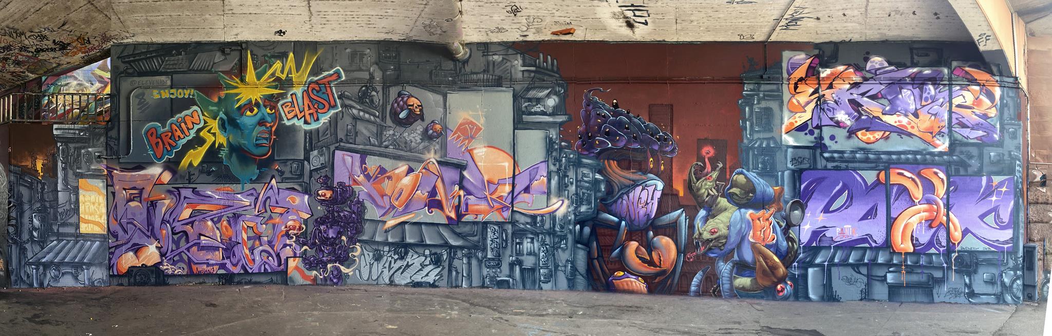This artwork is part of a magnificent thematic concept wall on the south-east facade of the main tunnel. The fantastic collaboration mural was created by the artists QUAPOS, ELEVENADE, DOE, MONKEY, PIXELJUICE, SKER, PANIK and RABATZ. Each participant sprayed individual works and the great background scenery was especially done by RABATZ resulting in an amazing masterpiece.