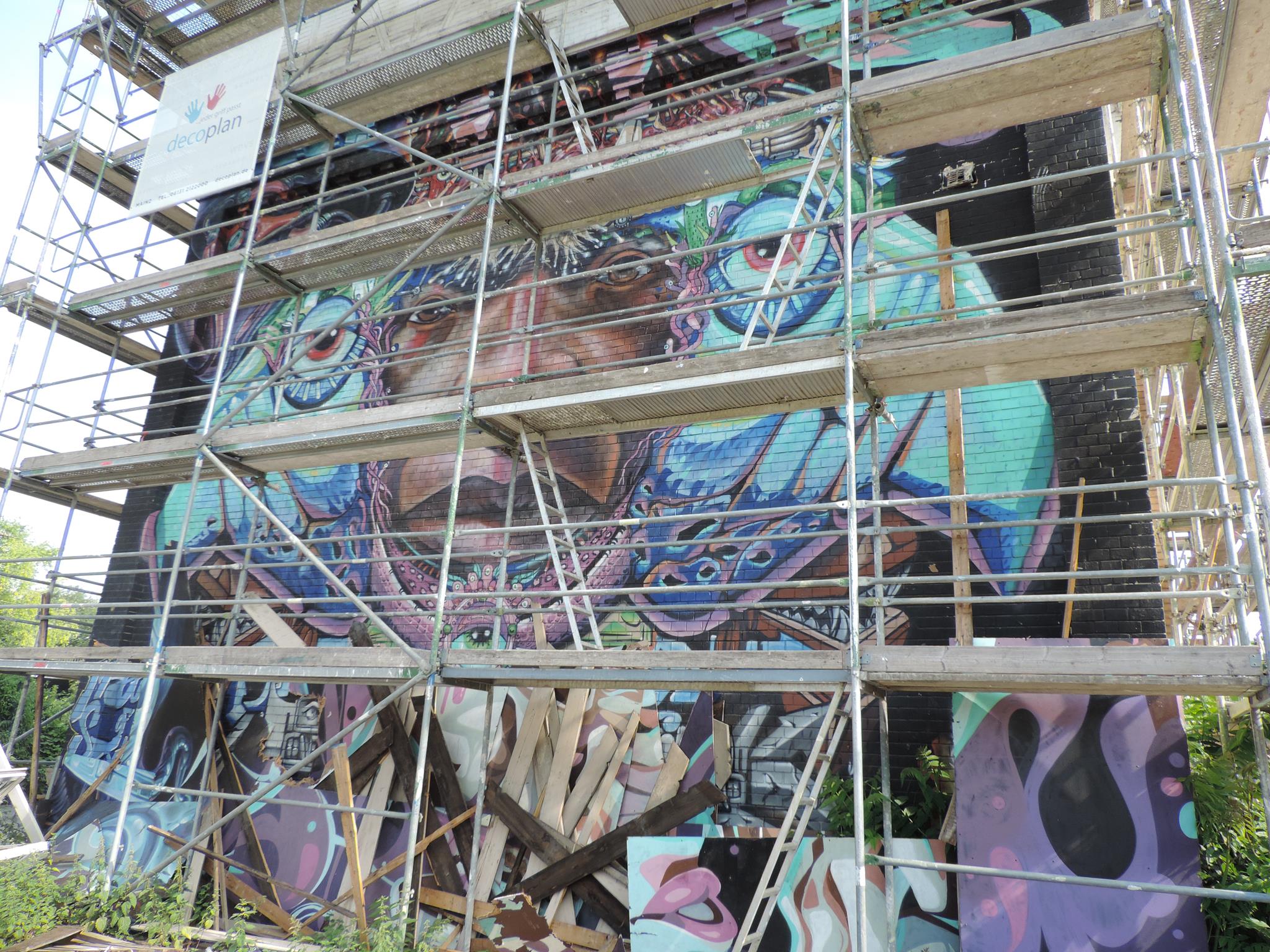 Unfortunately we have only these photos from the mural so far. If you have photos from this artwork, sent them to info@vagabundler.com and we will add them to the page. The upper part is already demolished which was covered with three figurative artworks by WILD DRAWING, KEY DETAIL and JULIA LIXIR aka YUBABA. The middle part was made together by JACKSON, ISAAC BARREDA and SUPO CAOS. Below there was a graffiti made by BERNS. Most of the participating artists especially from Peru are part of the legendary DMJC CREW aka DEDOS MANCHADOS DE LA JUNGLA DE CONCRETO.
