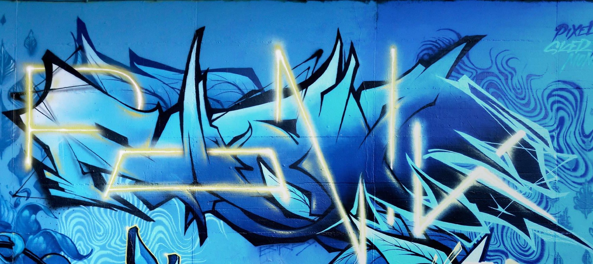 This graffiti is part of a magnificent thematic concept wall on the south-east facade of the main tunnel. The fantastic collaboration mural was created by the artists PIXELJUICE, SKER, MONSTER, MONKEY, PANIK and DOE. Each participant sprayed individual works, but the background was done together resulting in an amazing masterpiece.