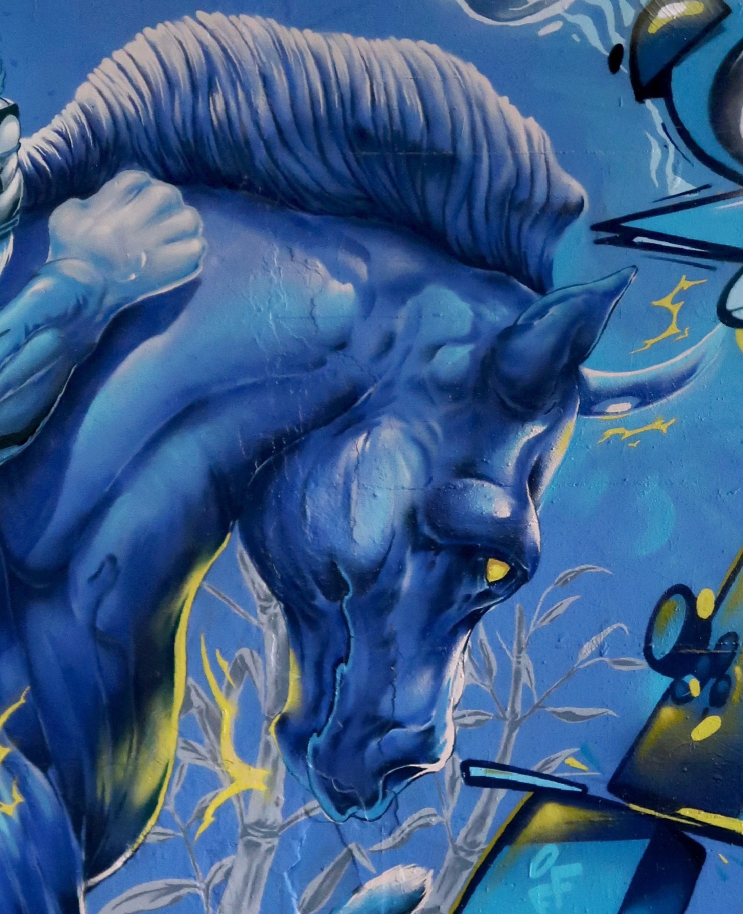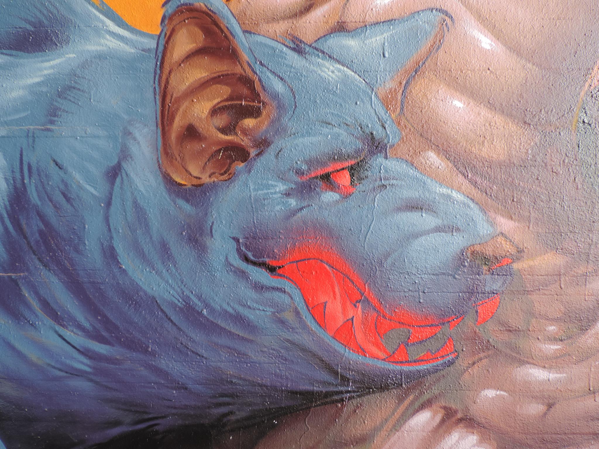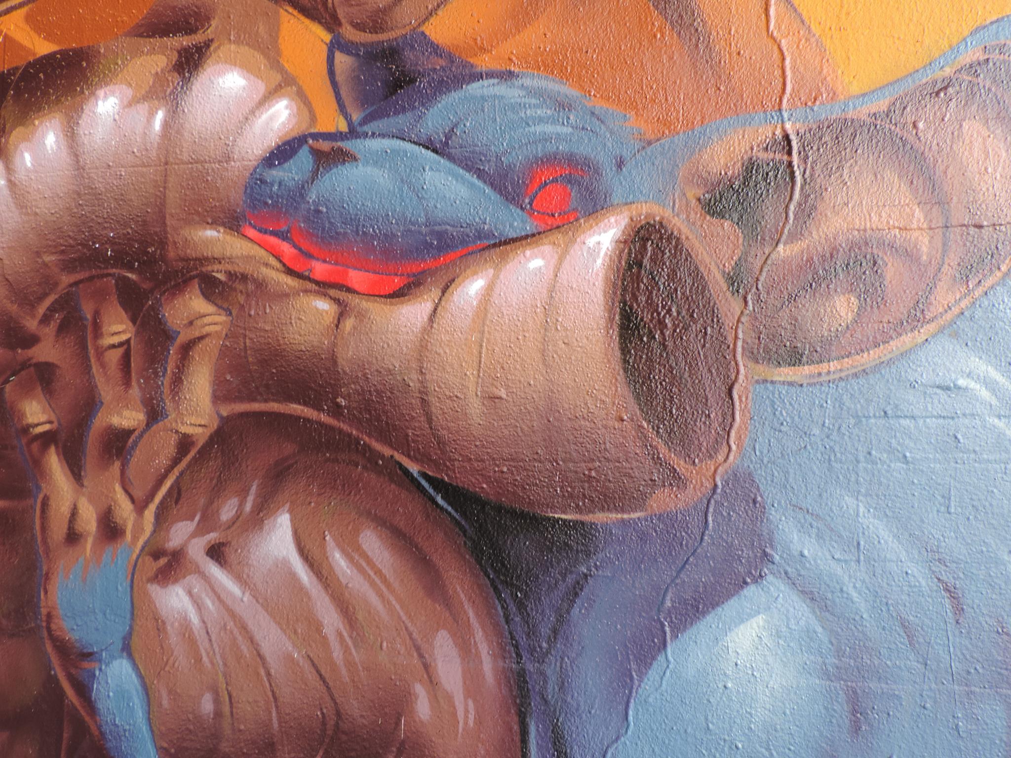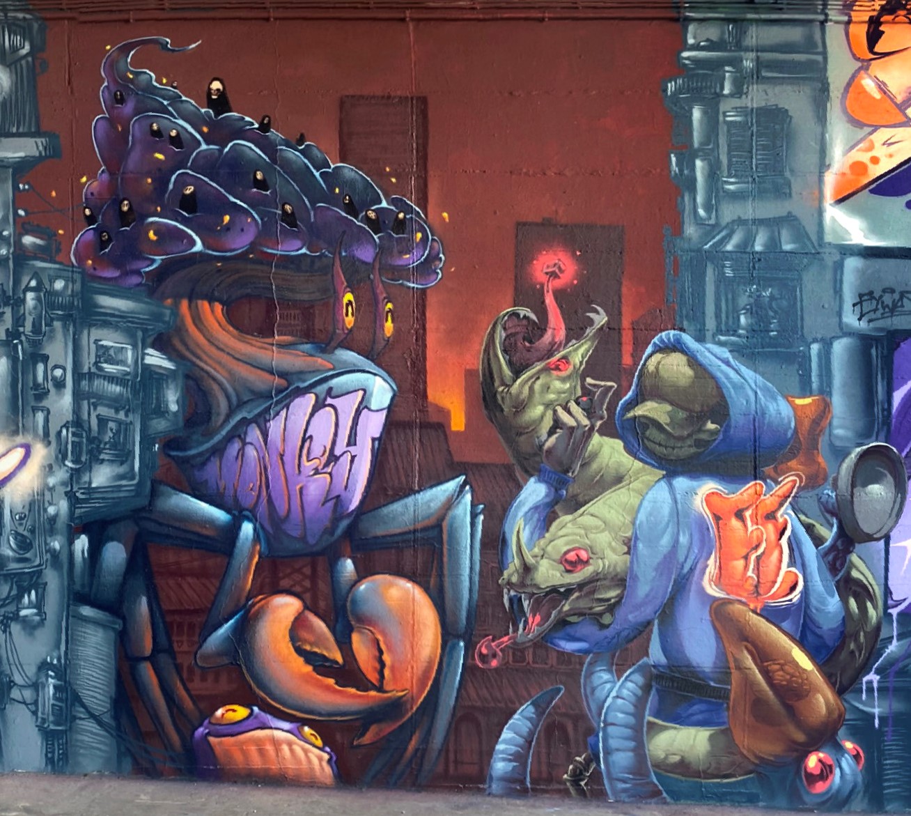 These characters are part of a magnificent thematic concept wall on the south-east facade of the main tunnel. The fantastic collaboration mural was created by the artists PIXELJUICE, SKER, MONSTER, MONKEY, PANIK and DOE. Each participant sprayed individual works, but the background was done together resulting in an amazing masterpiece.