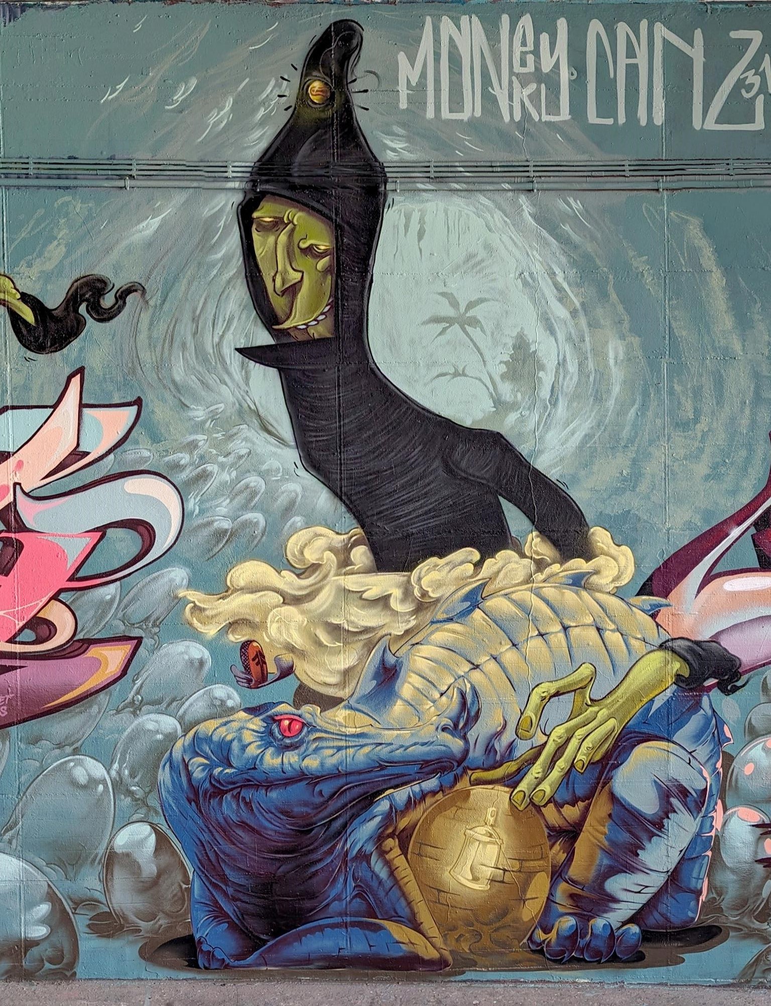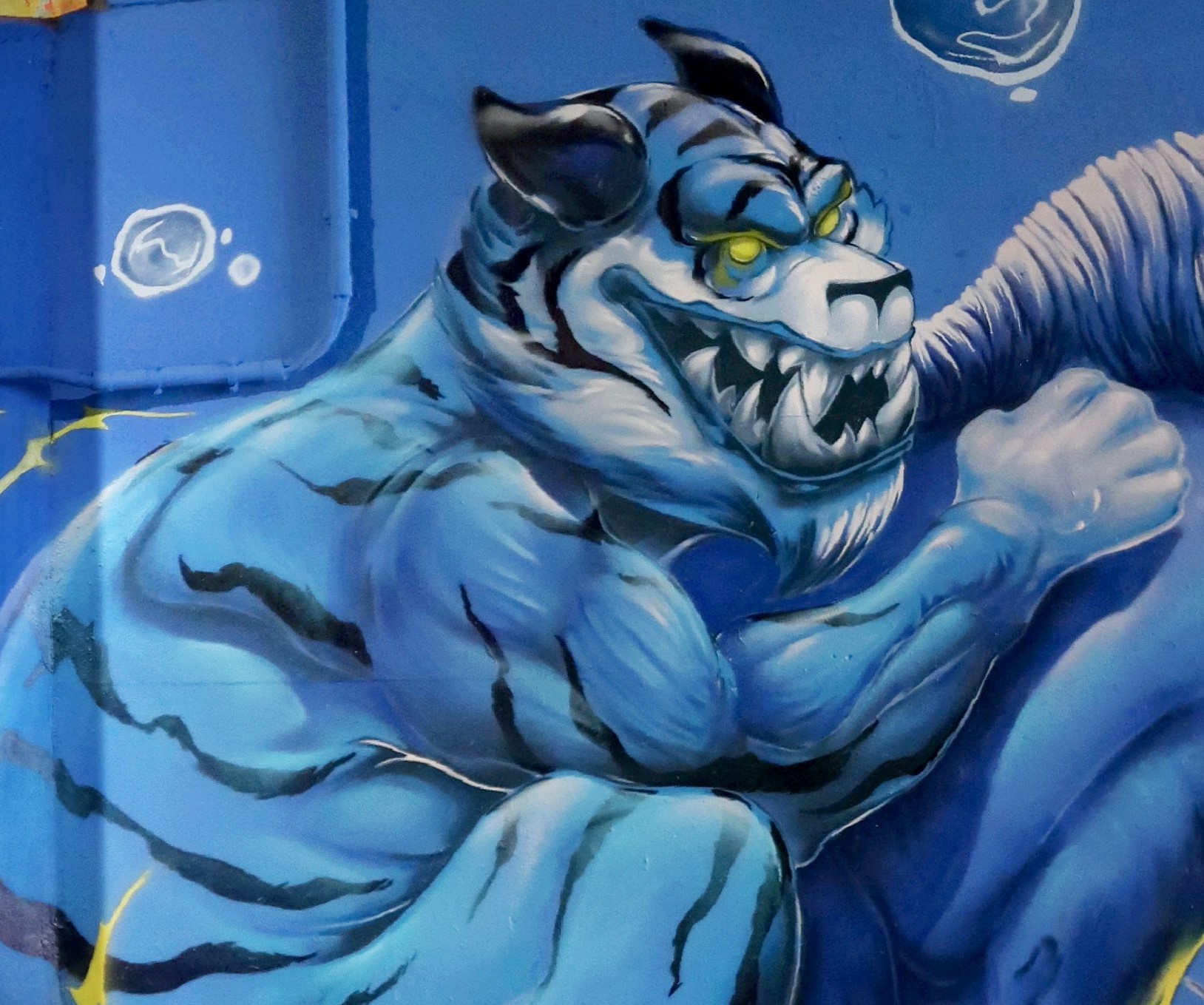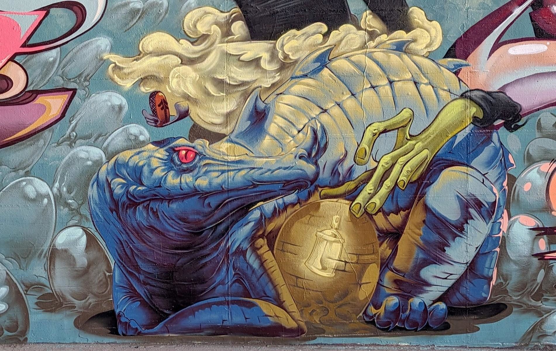 This crocodile artwork is part of a magnificent thematic concept wall on the south-east facade of the main tunnel. The fantastic collaboration mural was created by the artists MONSTER, MONKEY, CANZ 31, DOE, SKER and PIXELJUICE. Each participant sprayed individual works, but the background was done together resulting in an amazing masterpiece.