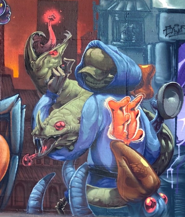 These dragons are part of a magnificent thematic concept wall on the south-east facade of the main tunnel. The fantastic collaboration mural was created by the artists MONKEY, PIXELJUICE, DOE, SKER, ANDREY PALVAL and ELEVENADE. Each participant sprayed individual works, but the background was done together resulting in an amazing masterpiece.