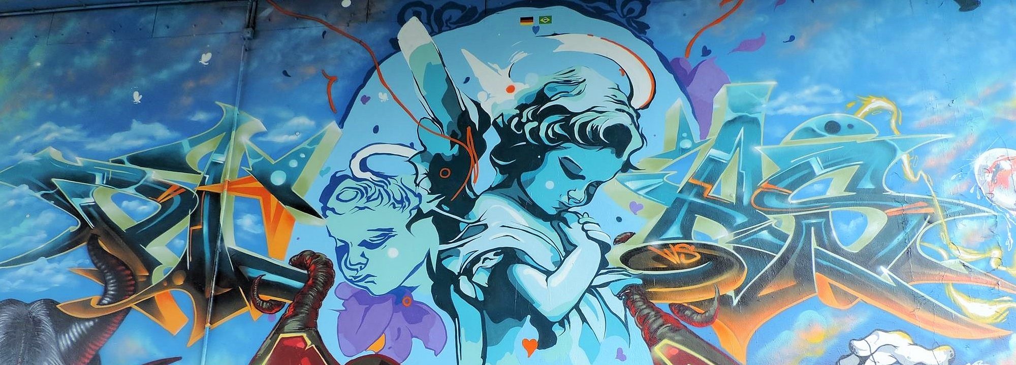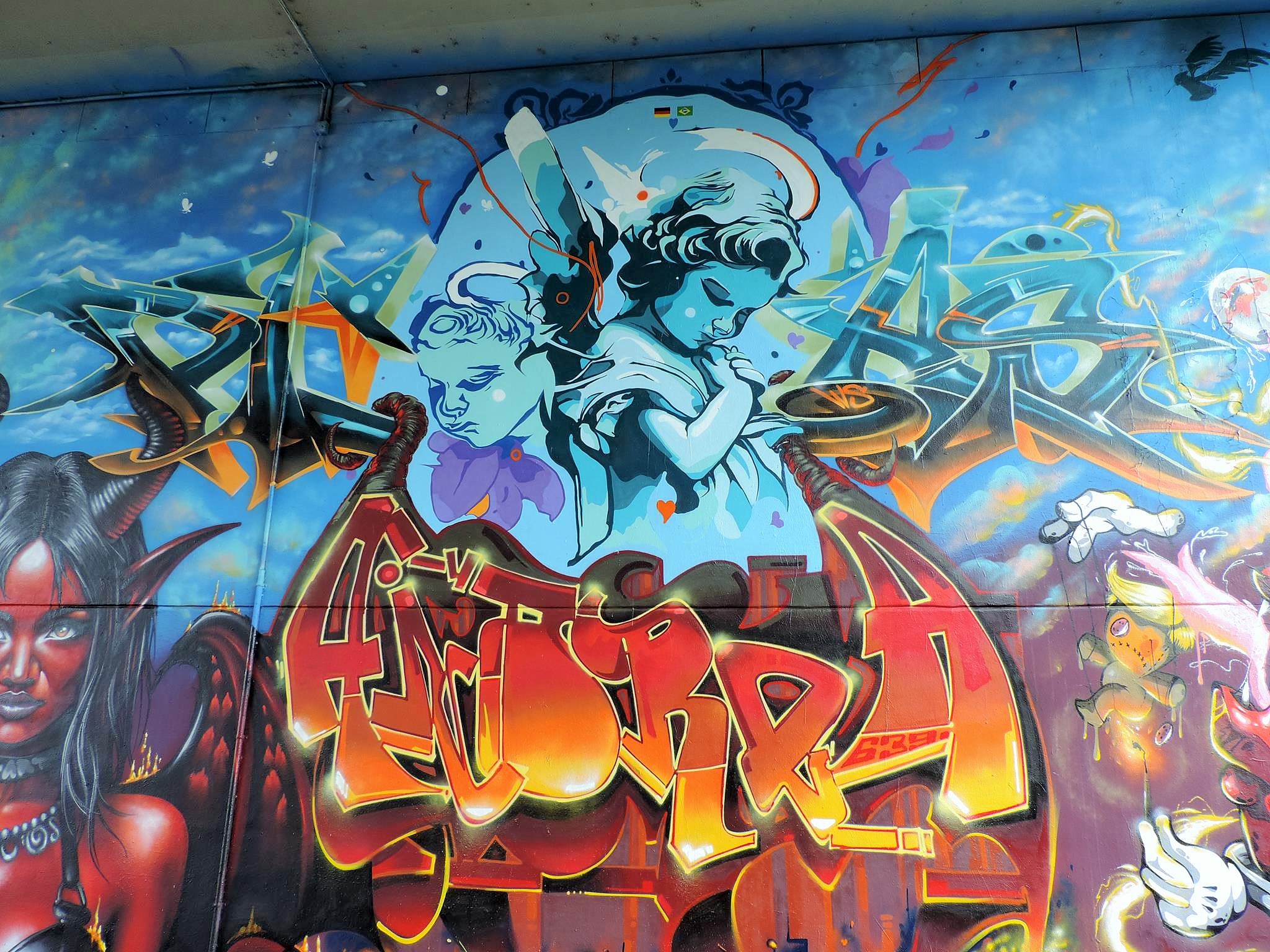 The blue children in the middle were made by THIAGU AGU and the graffiti below is from ANDREA 639