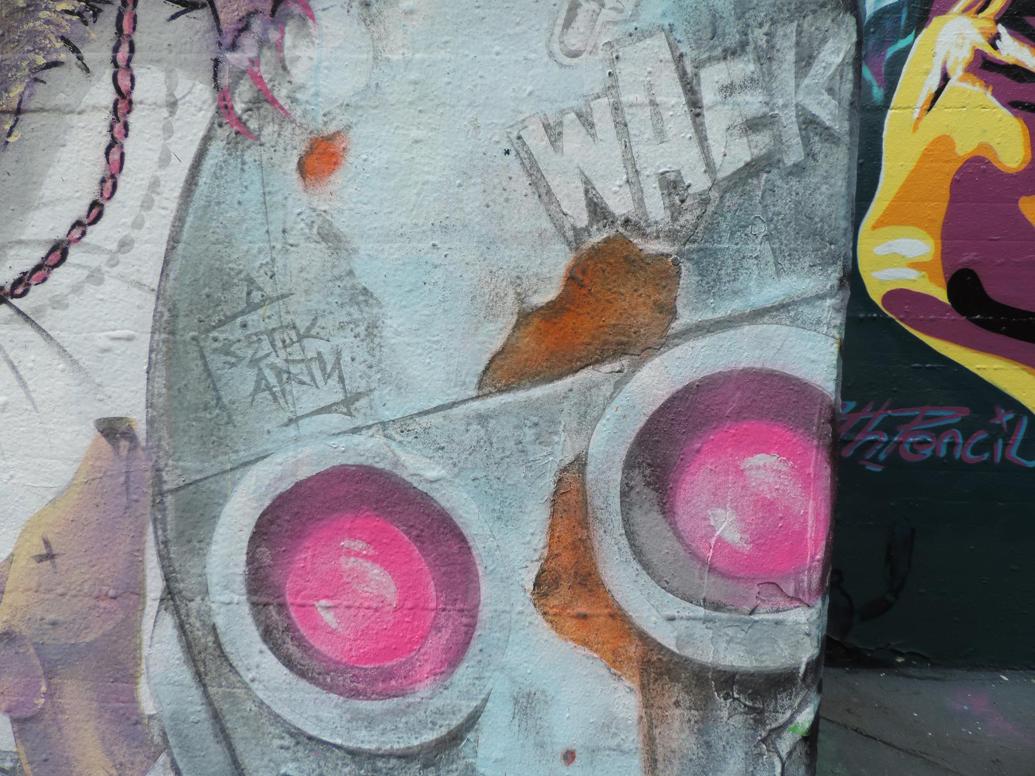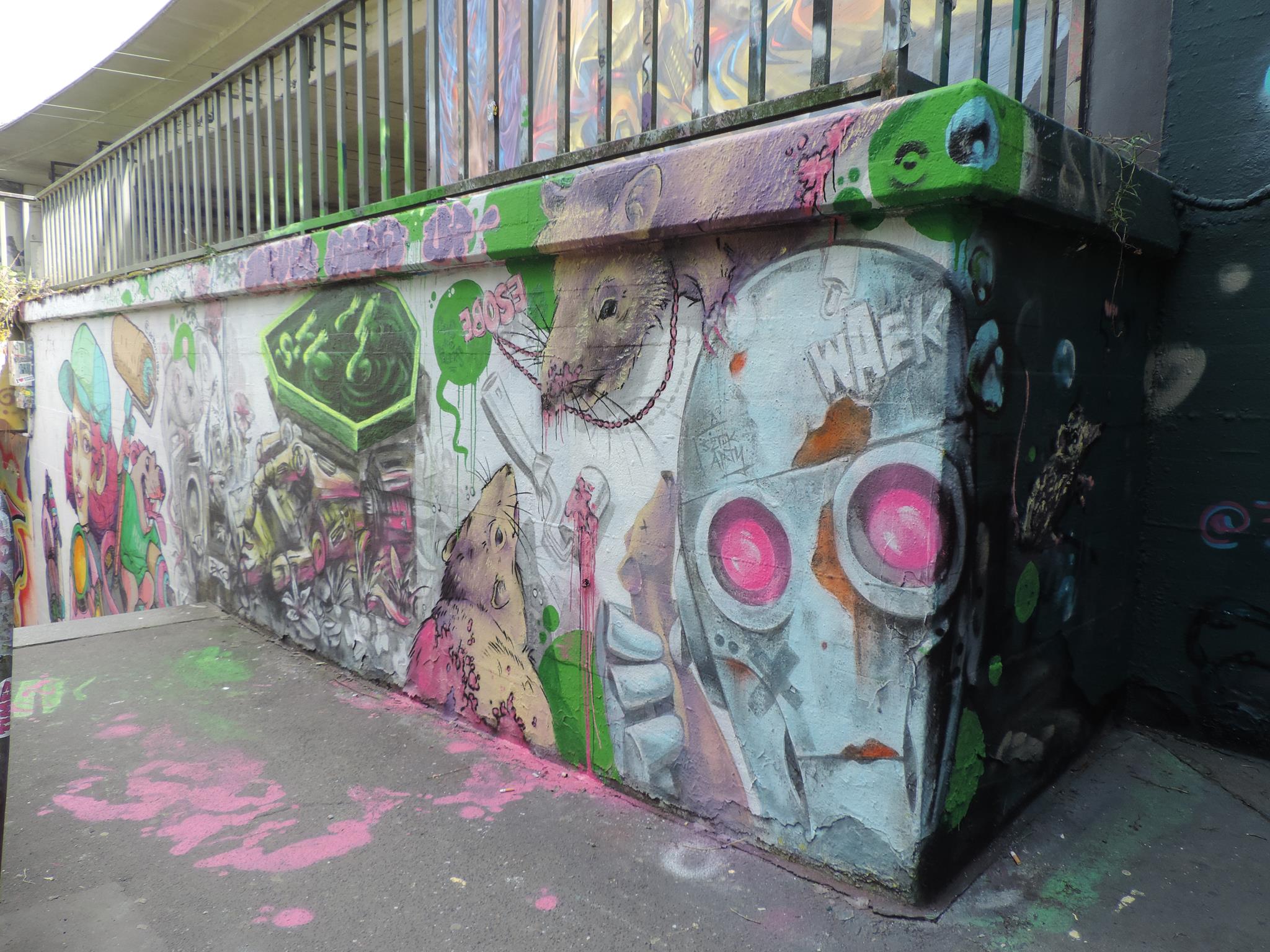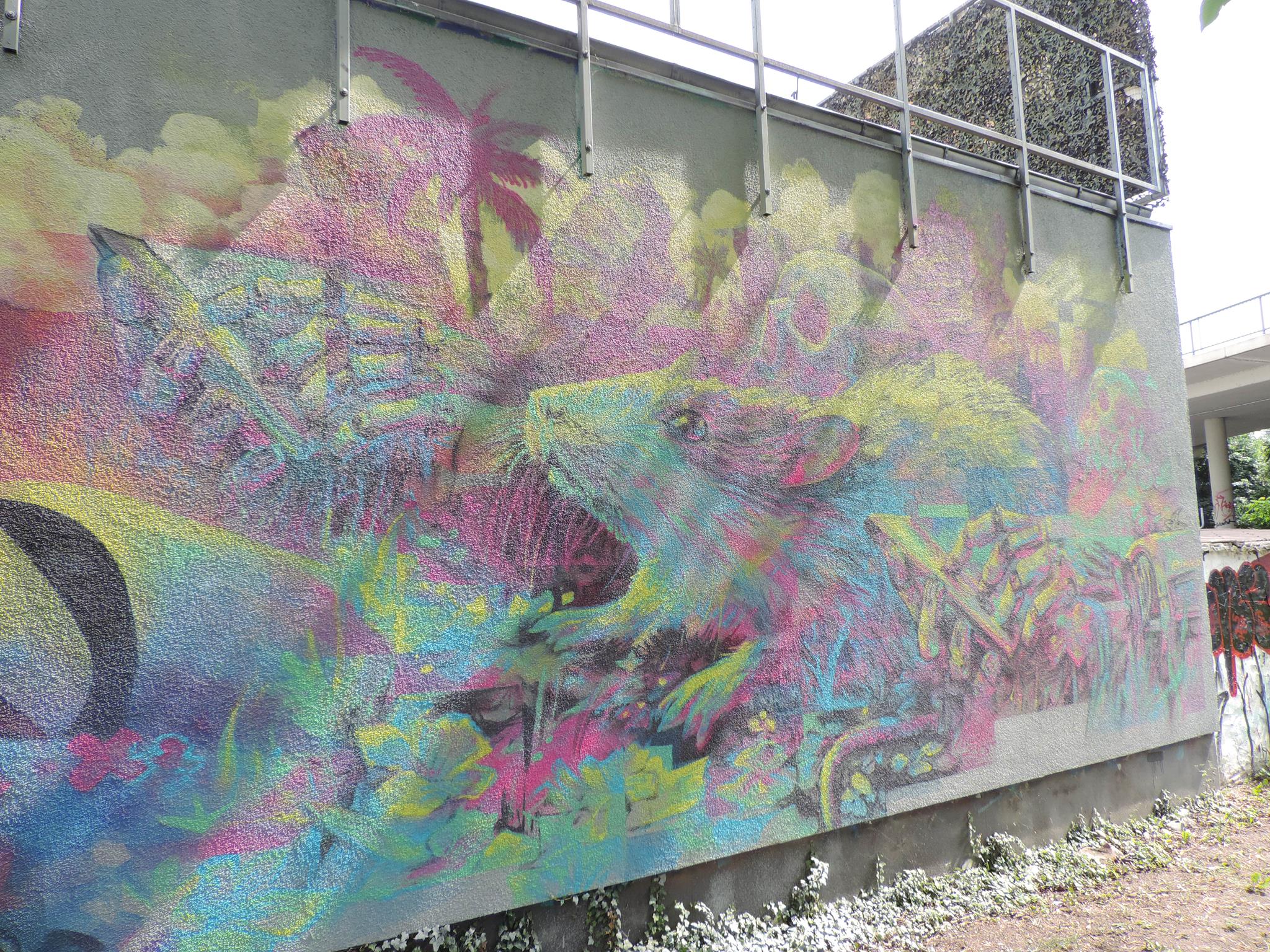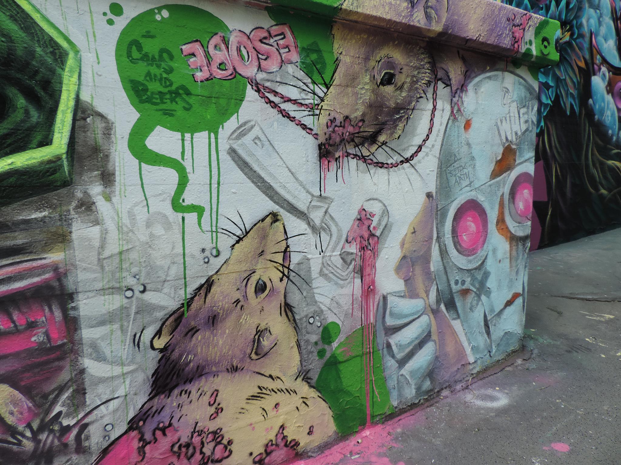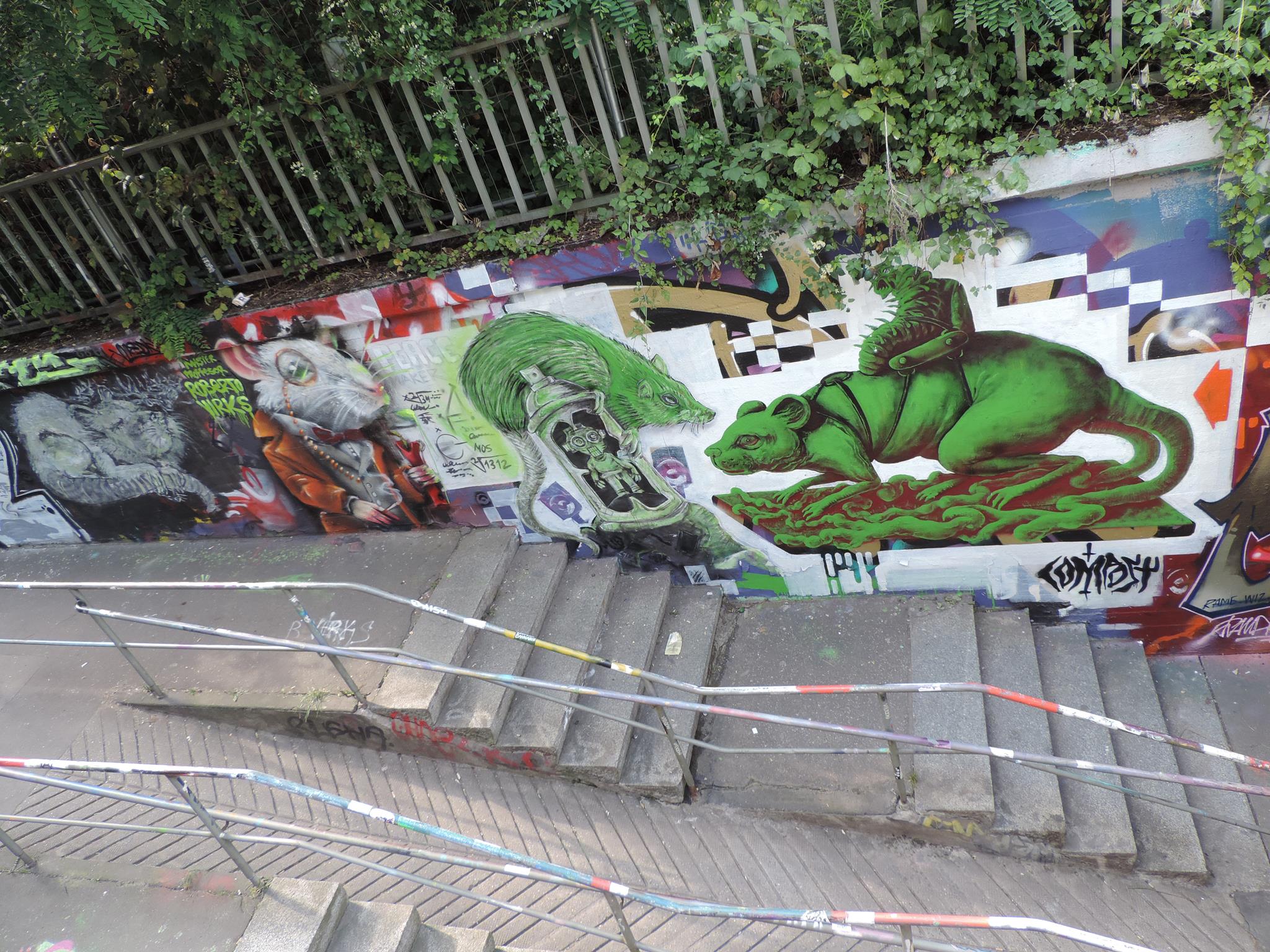 The artists involved in the two entrance walls to the basement on the west side have already painted several other larger works on the main walls. Here, they played around and just put stuff together, creating a fantastic smorgasbord, eaten away and overrun by rats. The walls on the underpass entrance to the left and right were created in a wonderful chaotic rat theme by BIKO, COMPOST, DELEON, ESOBE, SOBE and WEAK.