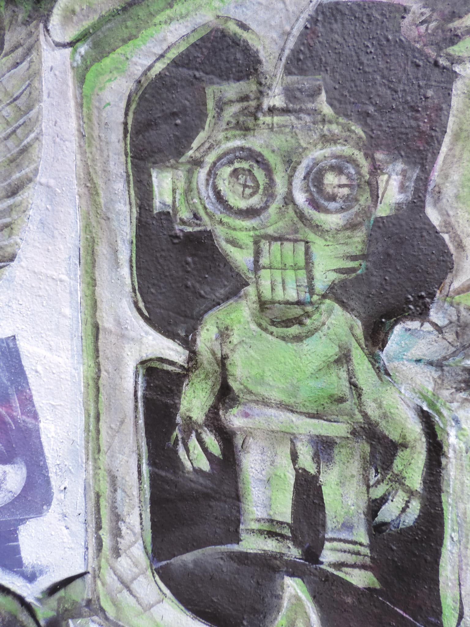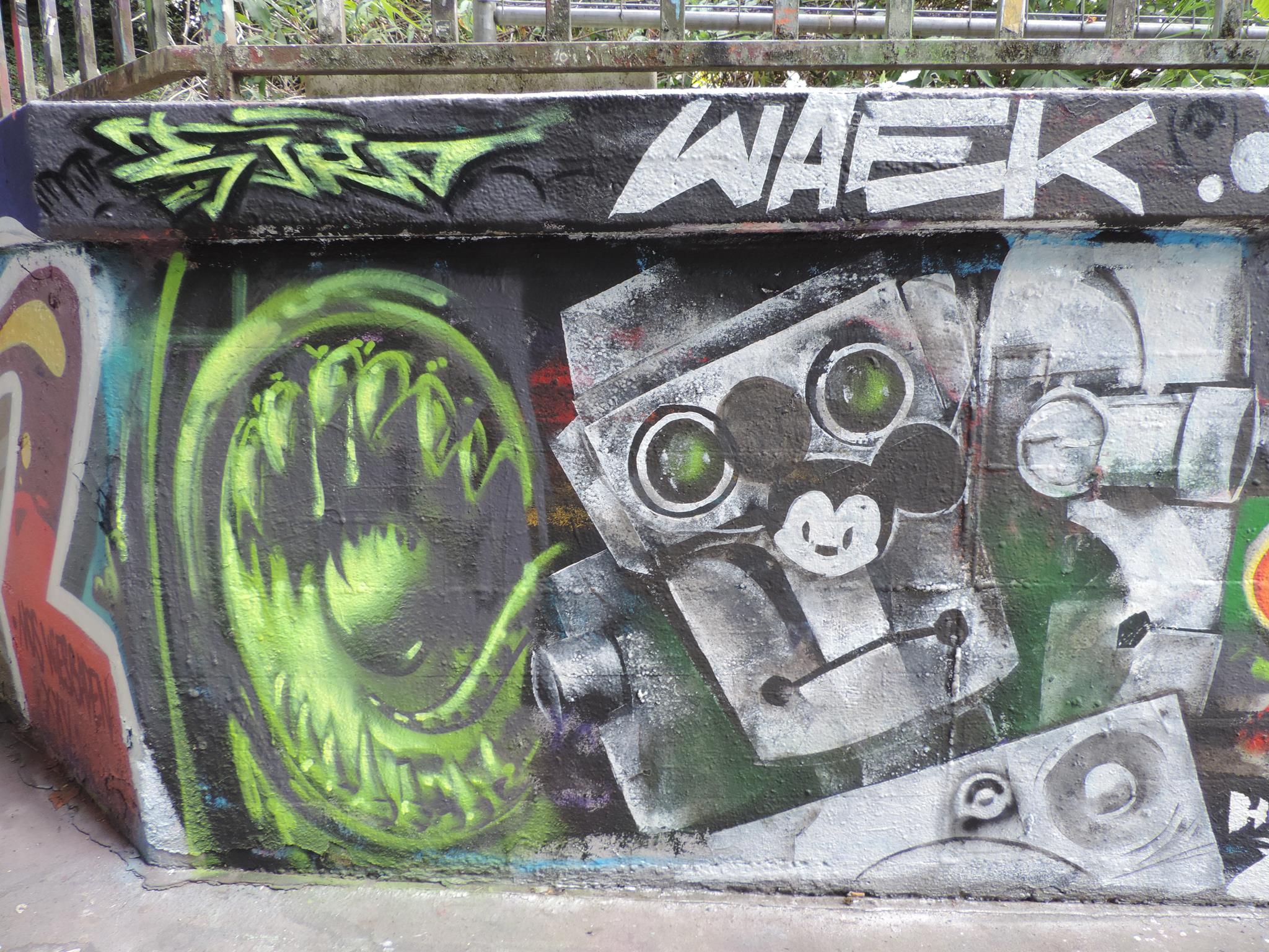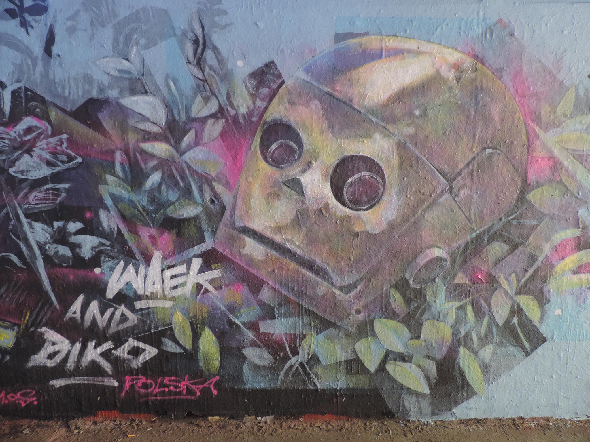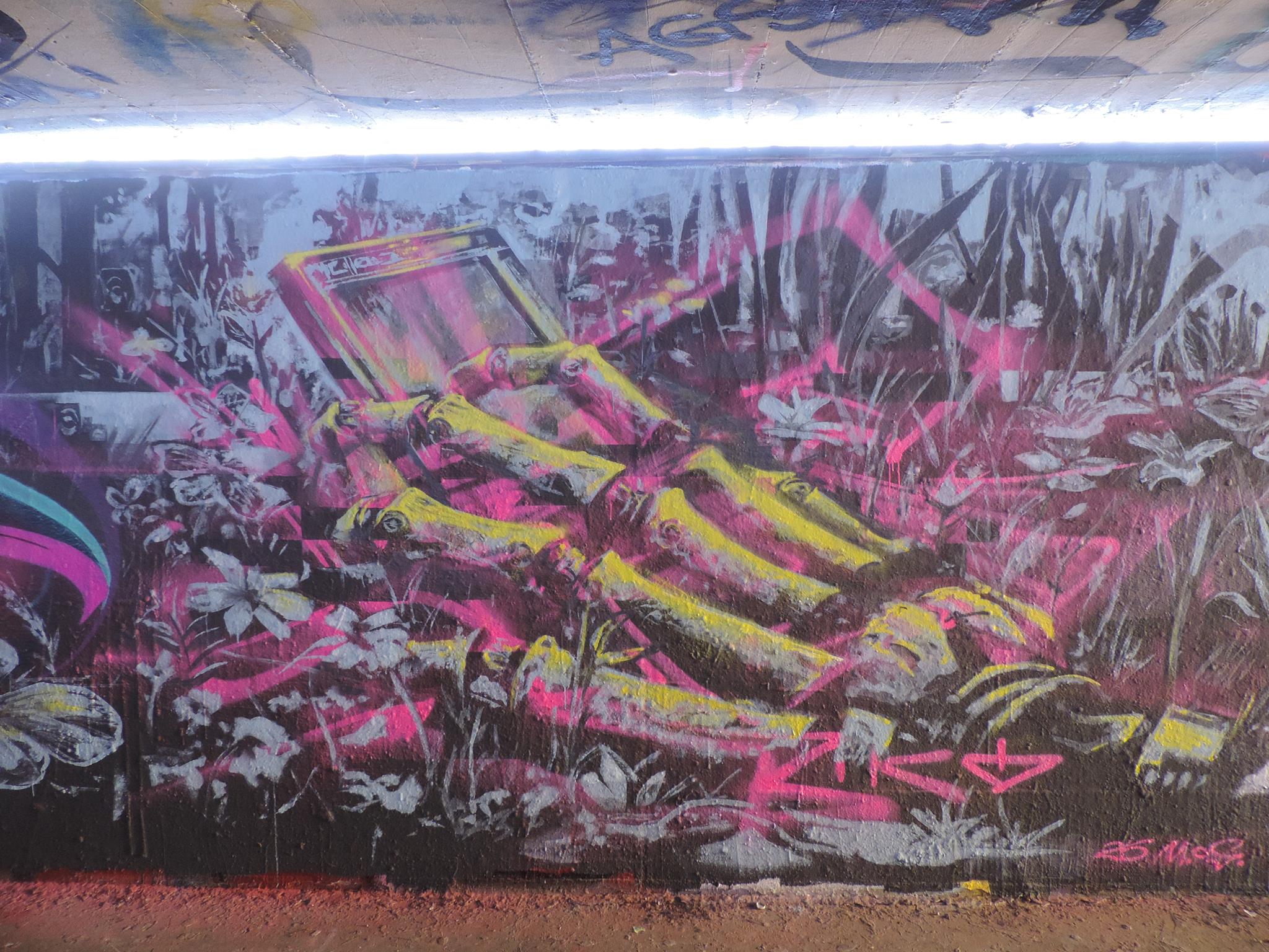 The artists involved in the two entrance walls to the basement on the west side have already painted several other larger works on the main walls. Here, they played around and just put stuff together, creating a fantastic smorgasbord, eaten away and overrun by rats. The walls on the underpass entrance to the left and right were created in a wonderful chaotic rat theme by BIKO, COMPOST, DELEON, ESOBE, SOBE and WEAK.