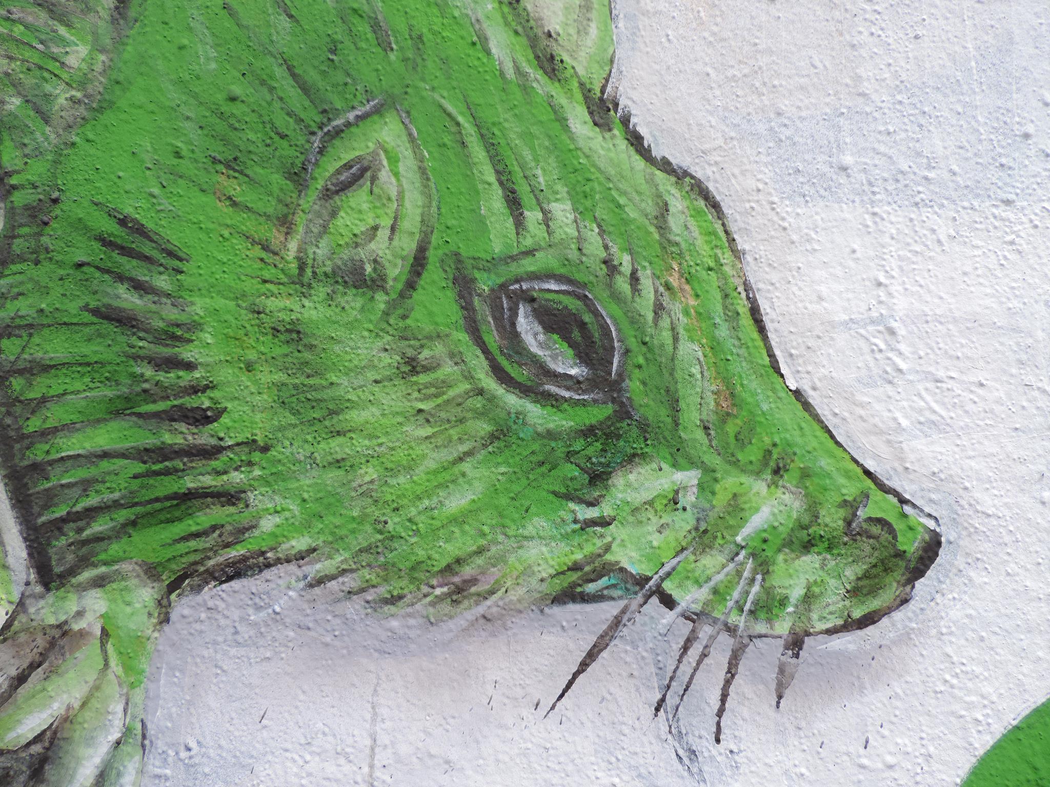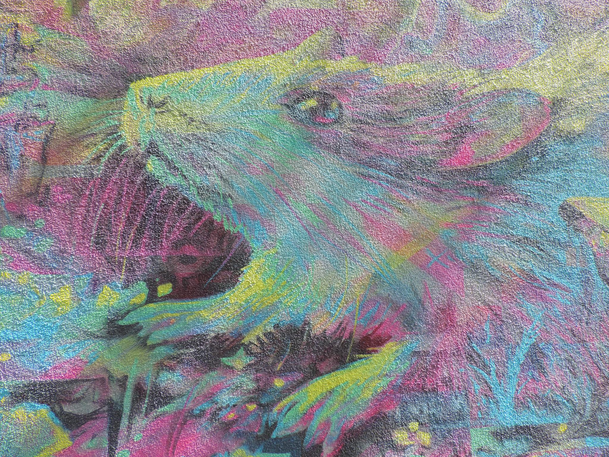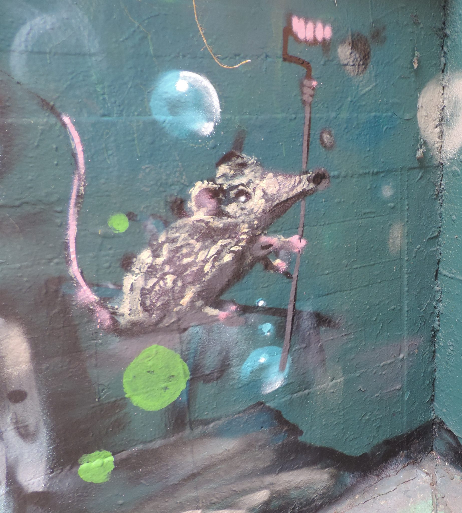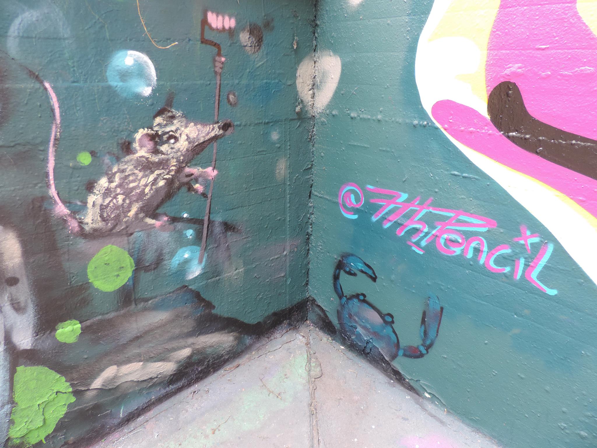 The spraying girl on the far left with rat on the backpack was made by DELEON, following the rat with the roboter hand which are from BIKO, above the rat bath was made by COMPOST, and the rats just on the left are from ESOBE. Above you can see parts of the artworks from MARCOS CONDE, NOBLE QUIQUE and STRIPE.