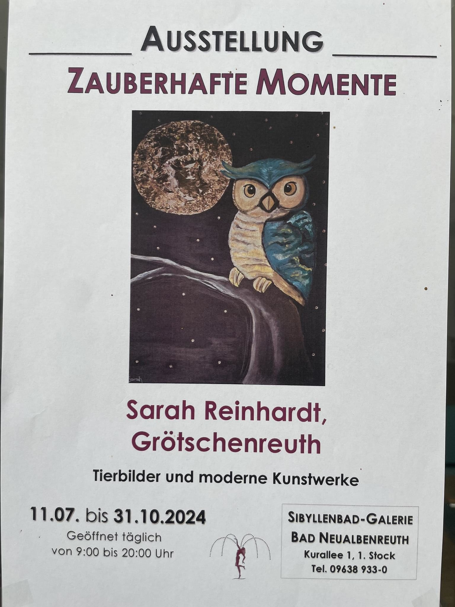 Interesting exhibitions regularly take place in the art gallery at the wellness center Sibyllenbad in Bad Heualbenreuth. From 11th July to 31st October 4th, 2024, artist SARAH REINHARDT’s beautiful works were shown under the title „Zauberhafte Momente“ or in English „Magical Moments“. A focus in her artworks are modern abstracts and animal motifs. Check out as well the artworks of OLGA KELWIG.