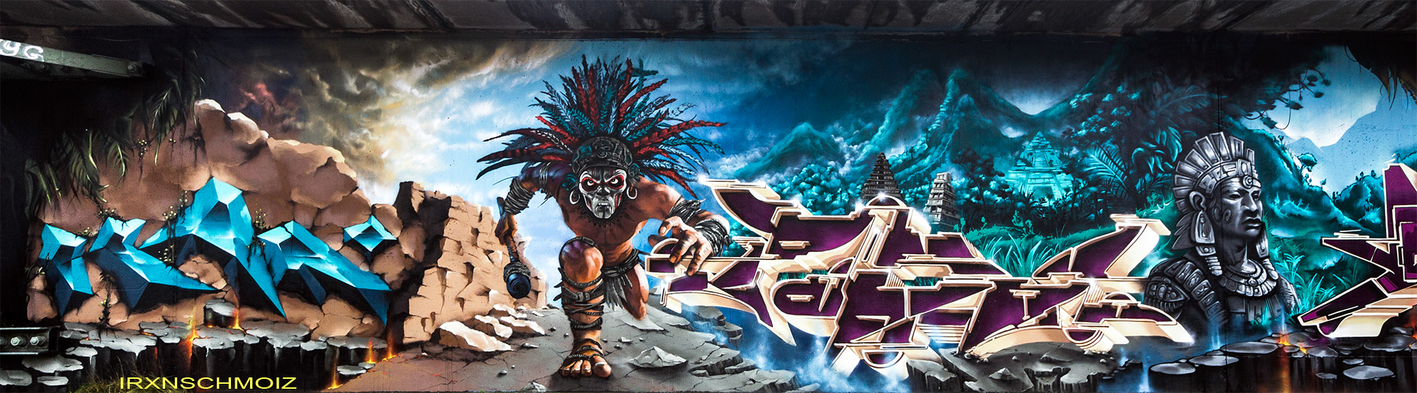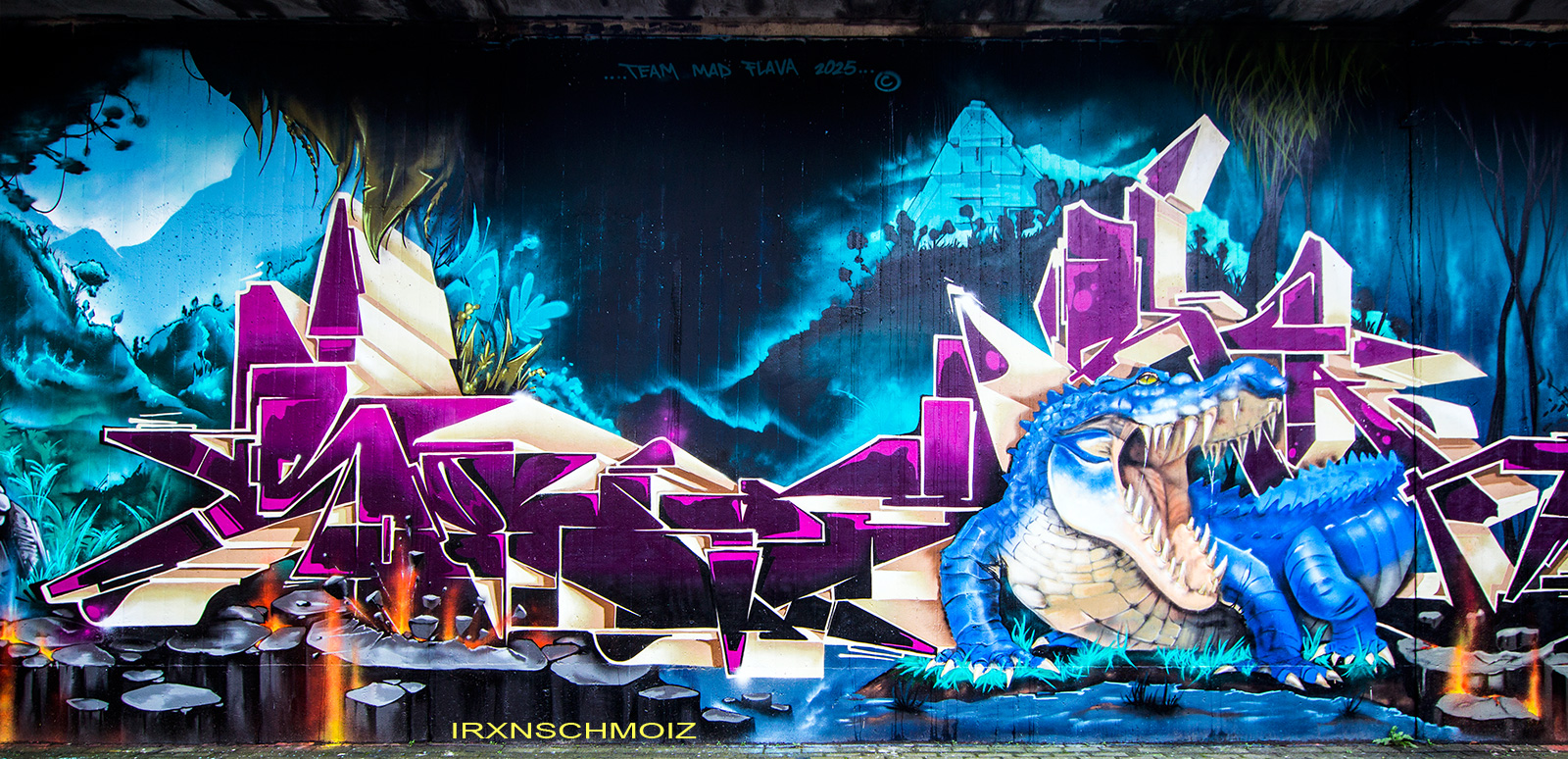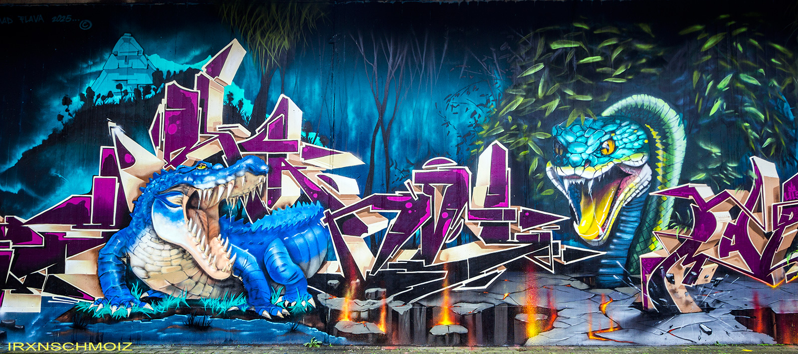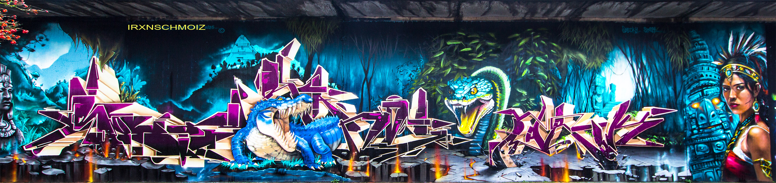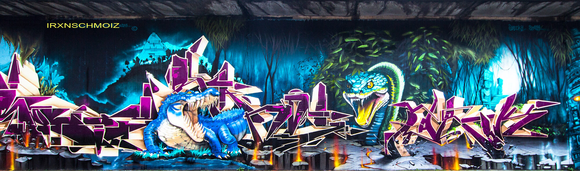 This page features works from the Graffiti Hall of Fame, which is mainly located on the northern wall of the railway embankment facing Donnerschweer Street. There is a legal wall for painting here since 2022, but large-scale collaborative projects are also carried out. For example, in August 2025, the amazing crew TEAM MAD FLAVA created a breathtaking concept wall with an Aztec jungle theme. This masterpiece and other works are of astonishing quality and definitely worth a visit. As well check out the individual pages for the artworks especially from the MEMUR FESTIVAL and for the other artworks throughout the city.