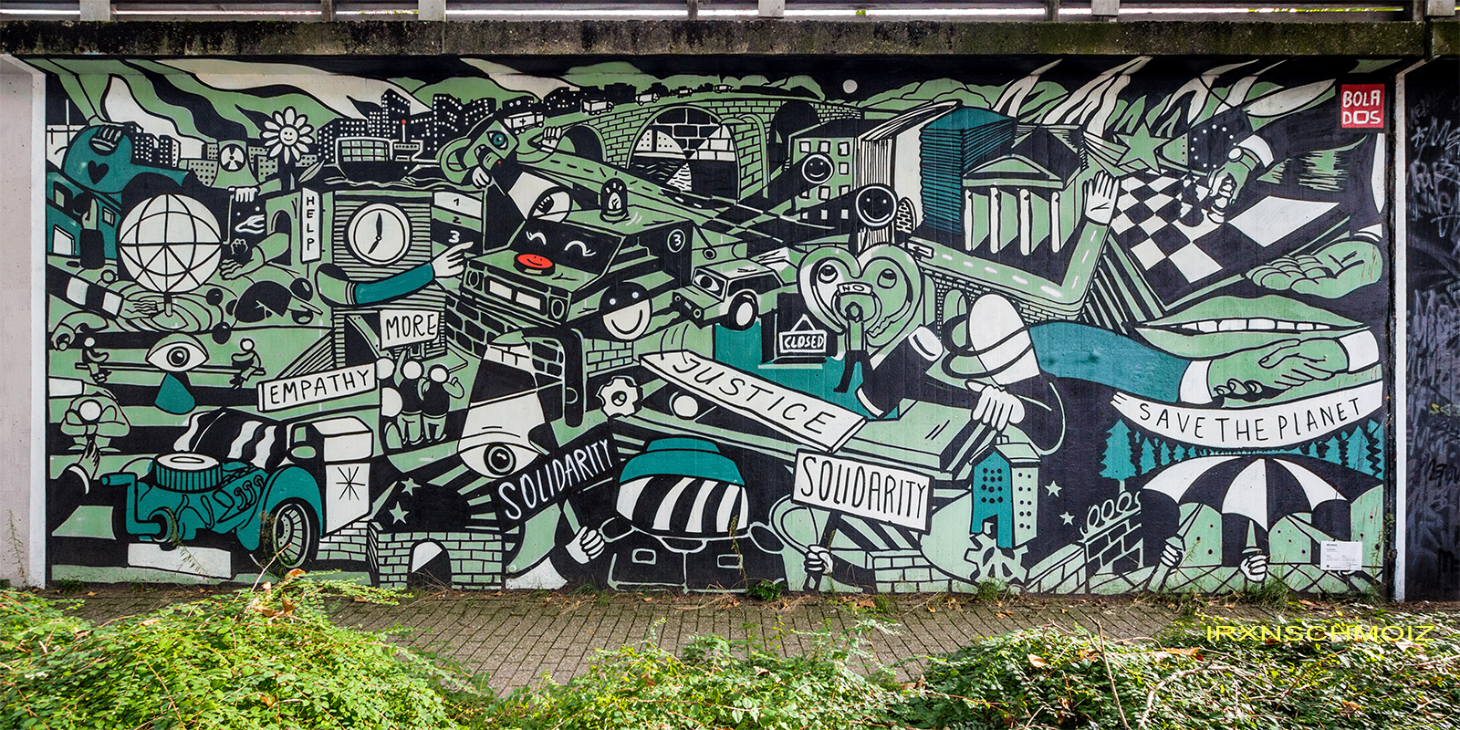 „The motif was created in direct reference to a graphic recording project for three different workshops that were led and developed by the Katholische Adademie Hannover. The three different workshops focused on the current political issues of solidarity and justice.“  –  BOLADOS