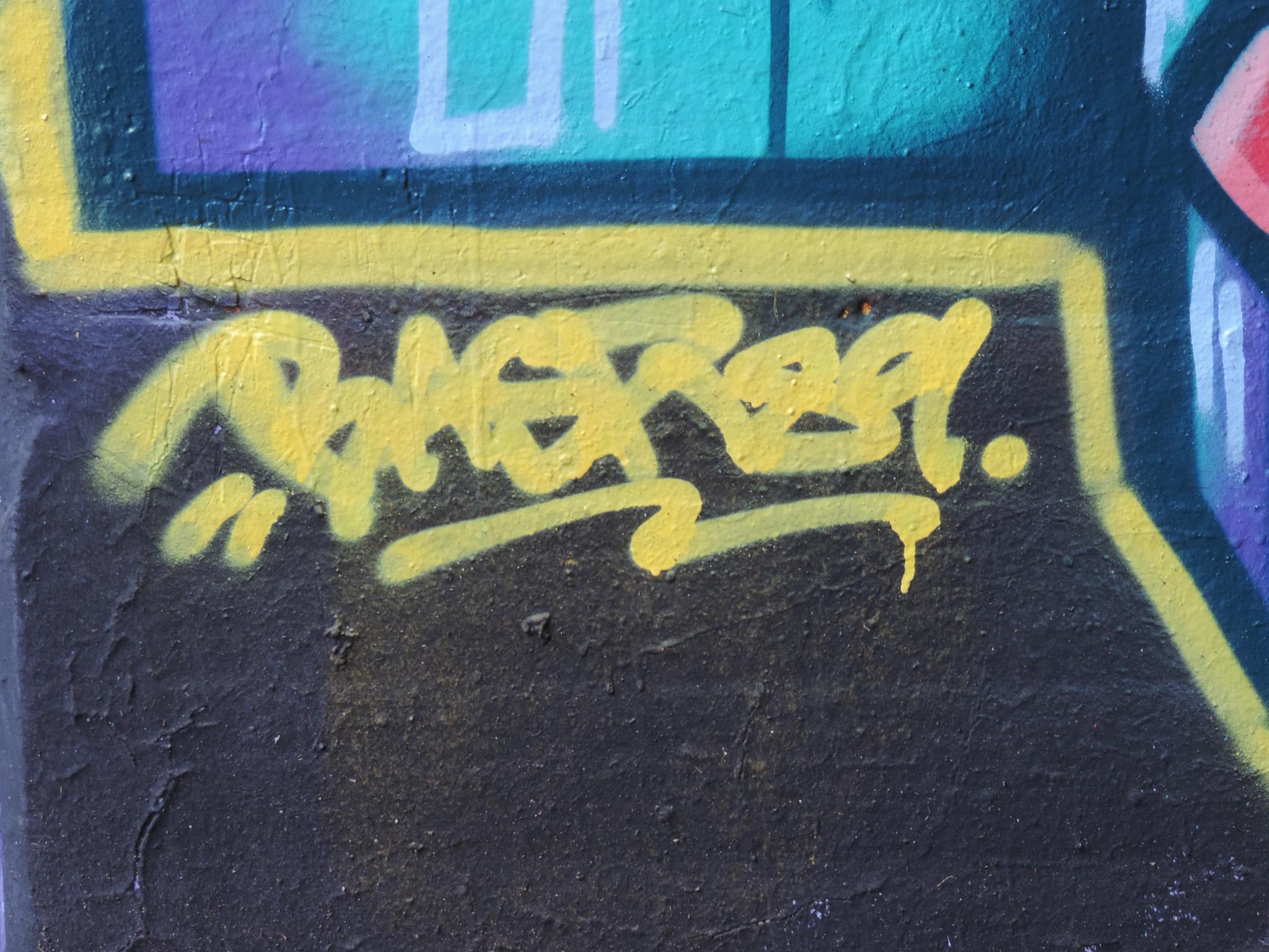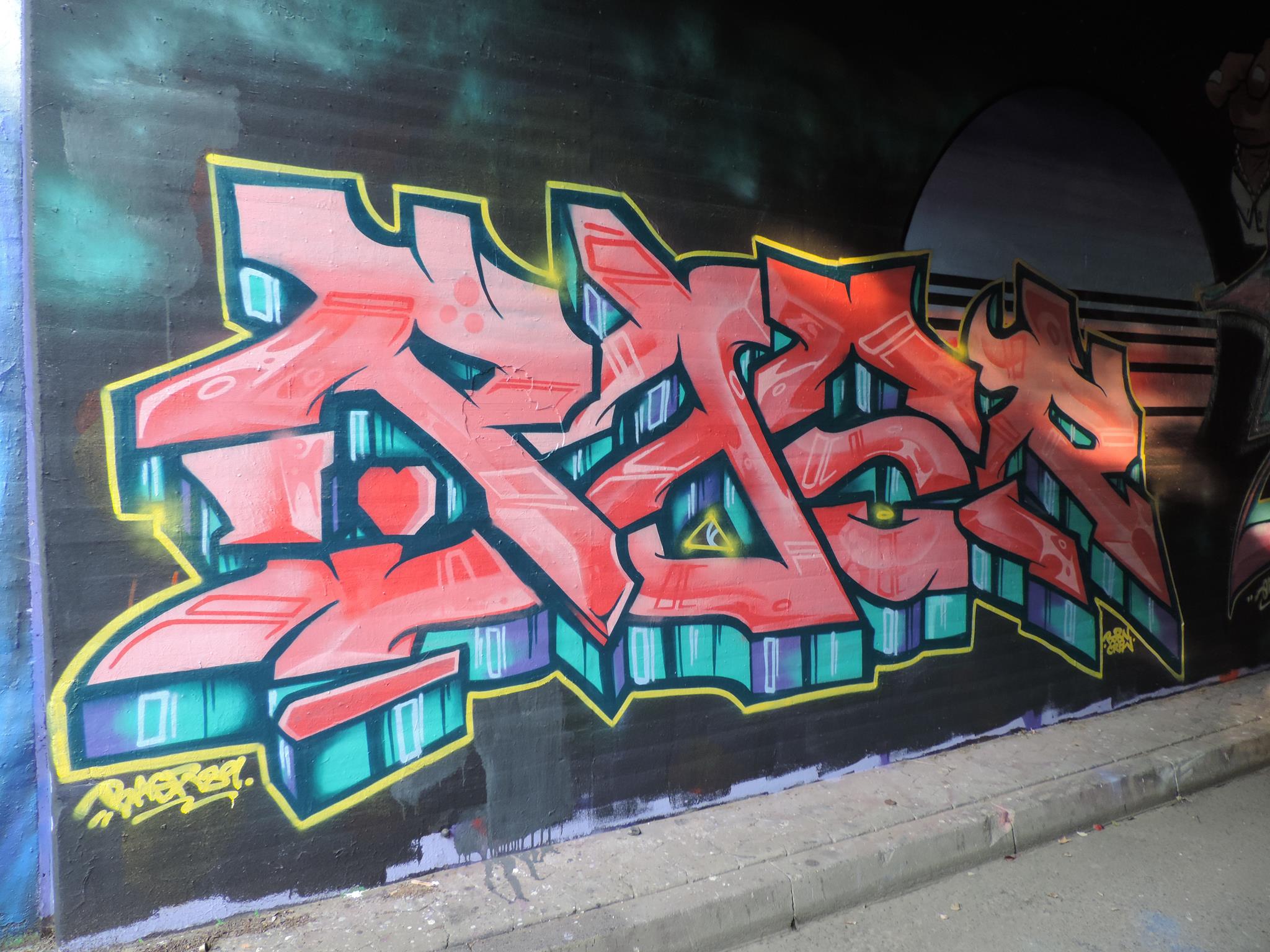 This great graffiti is part of a collaboration wall made by the fantastic BORN CREW. During the HAFEN JAM all six members were involved and they created the northern tunnel wall at the south west underpass with a concept named „Frankfurt Vice City“. Check out as well the graffiti by the other members of the crew, they were made from left to right by BASR, EASY, WISE, NEIN, COKE and RITUS.