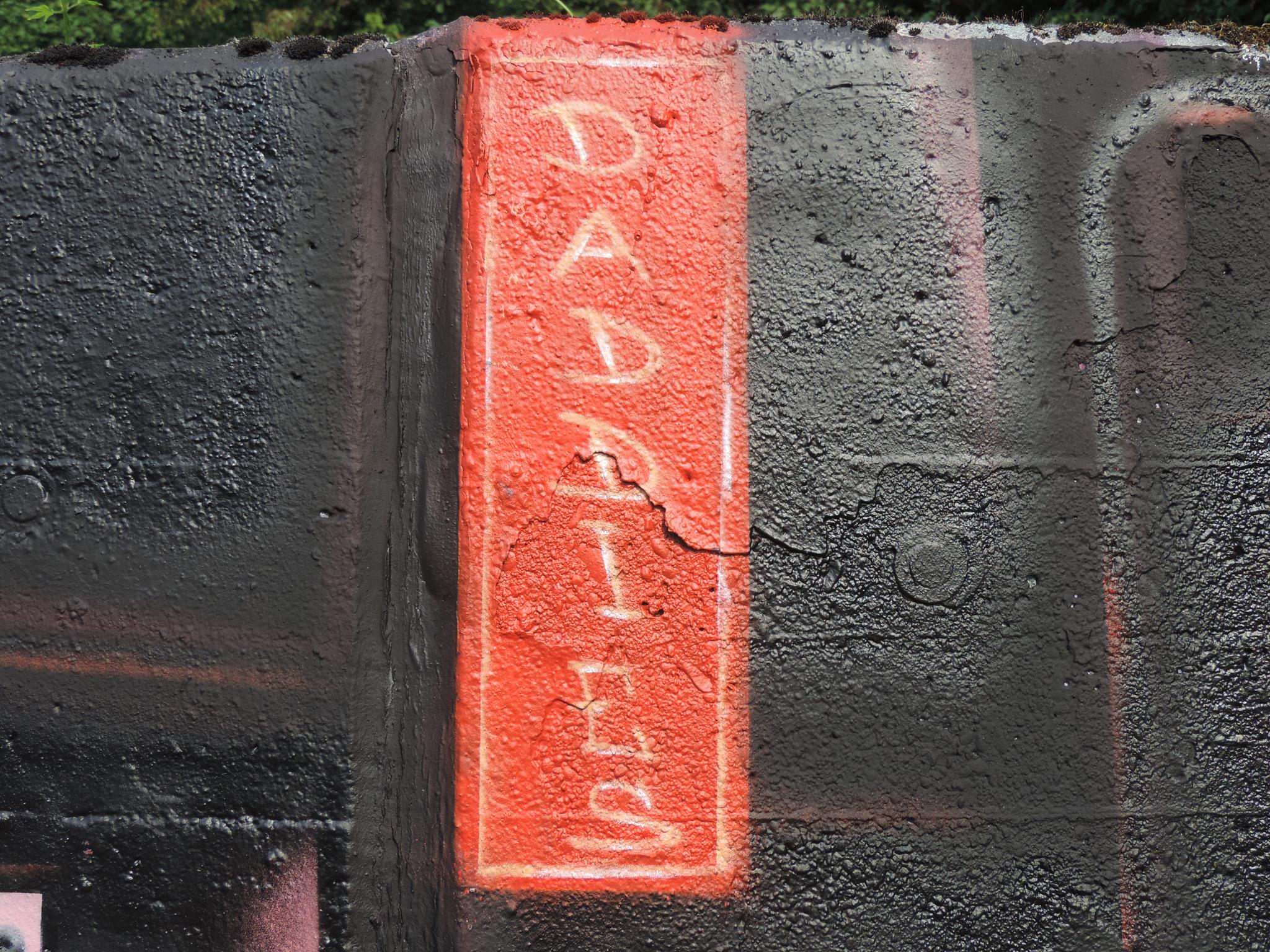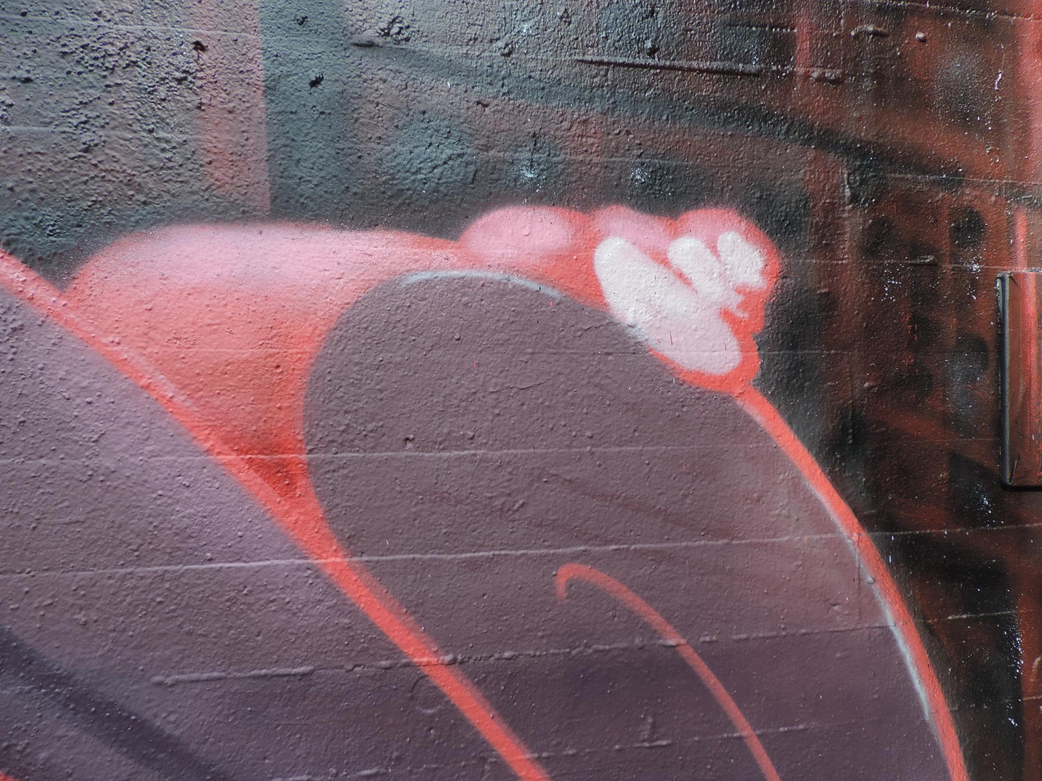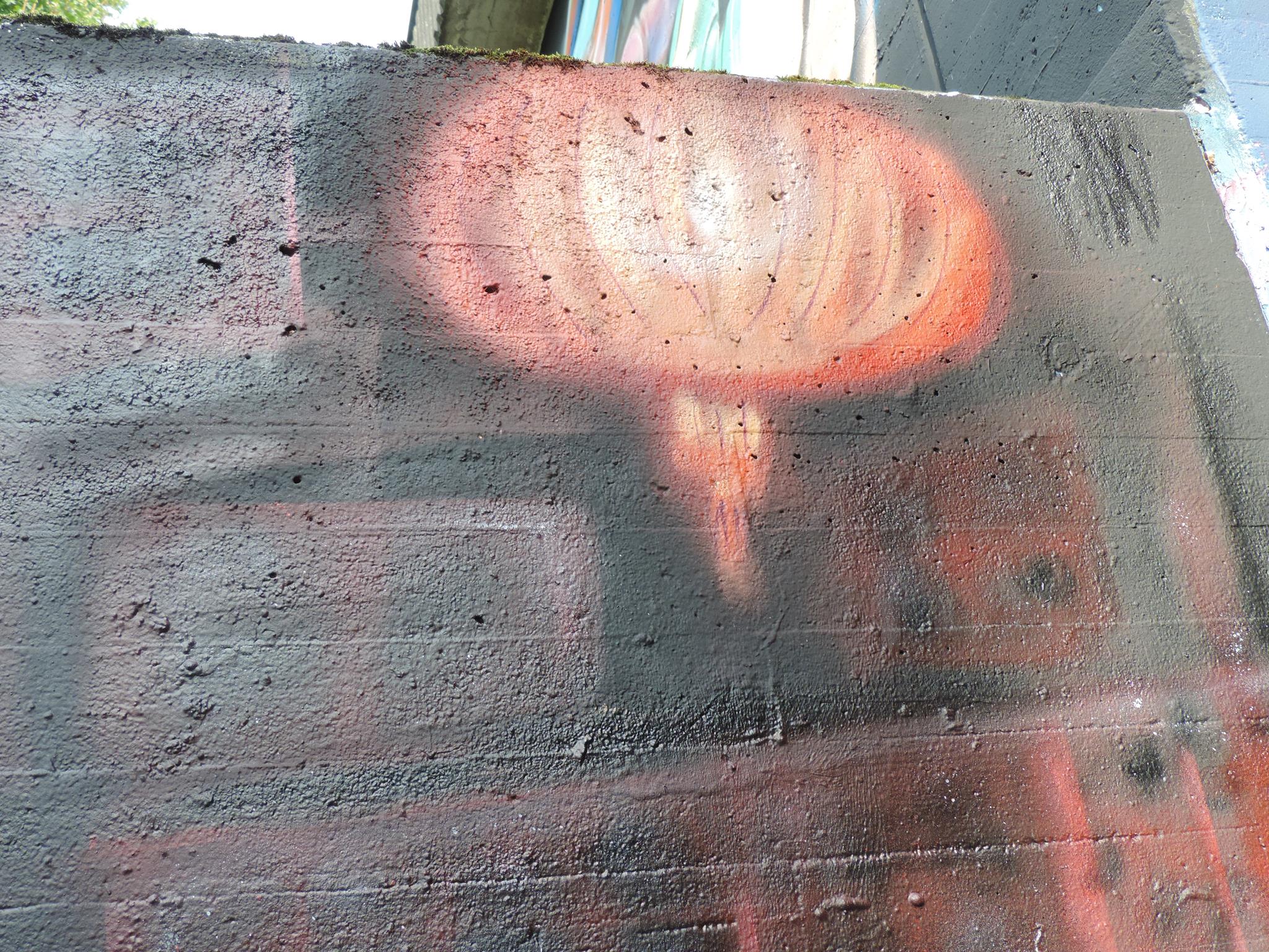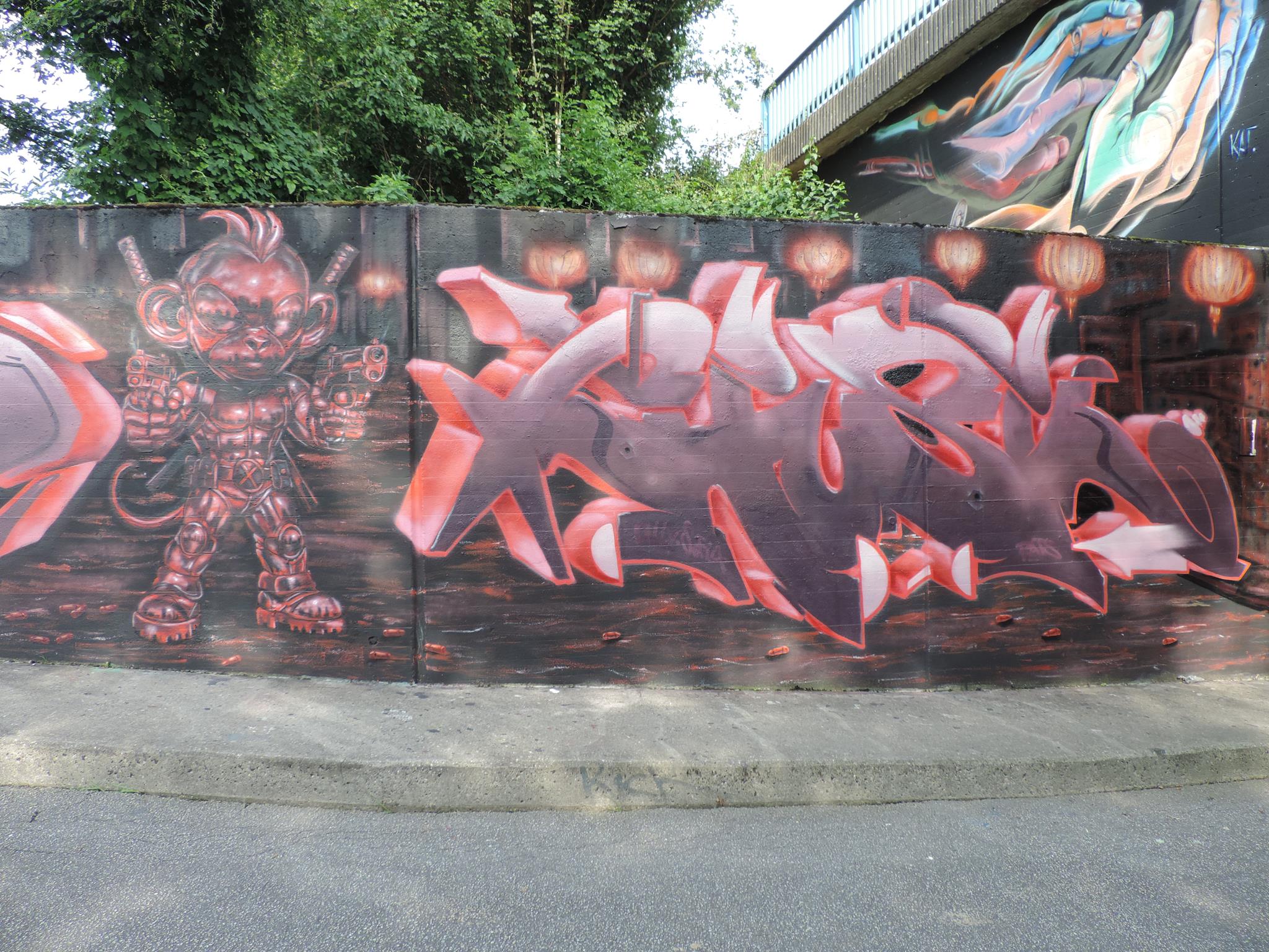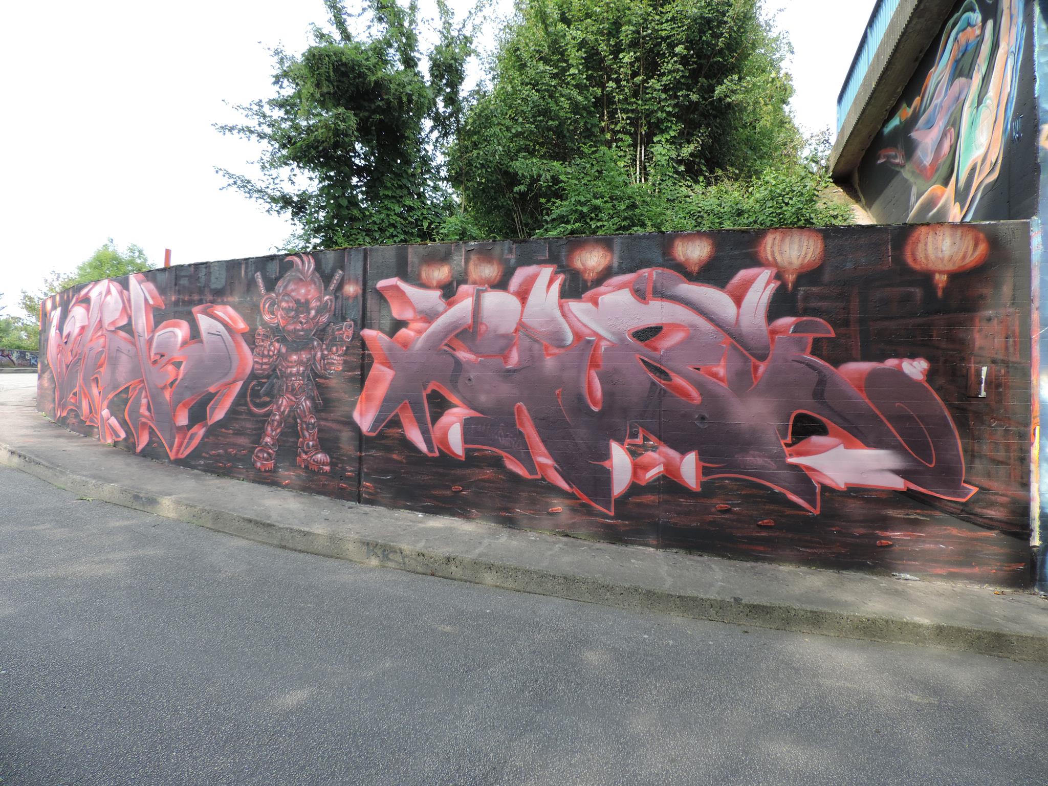 This great collaboration wall was made by members of the DADDIES CREW. The graffiti on the left is from ZONK, the Chromemonkey IV in the middle was made by OPUS and the graffiti on the right is from CHUSK. The hands artwork above was made by KAT.