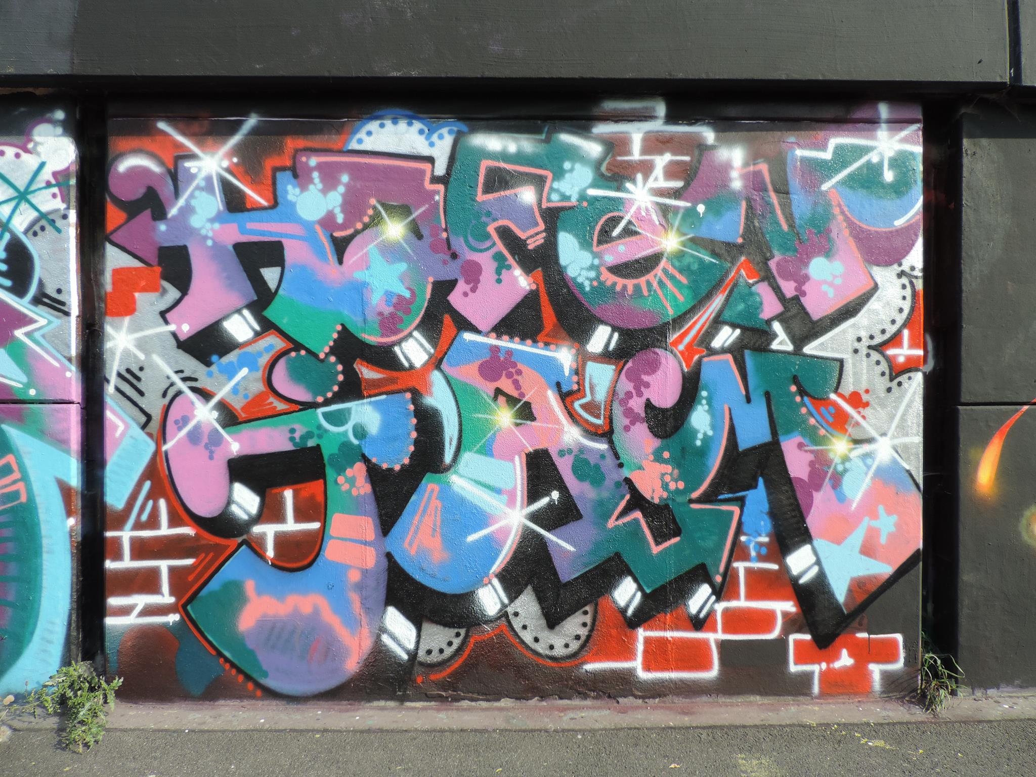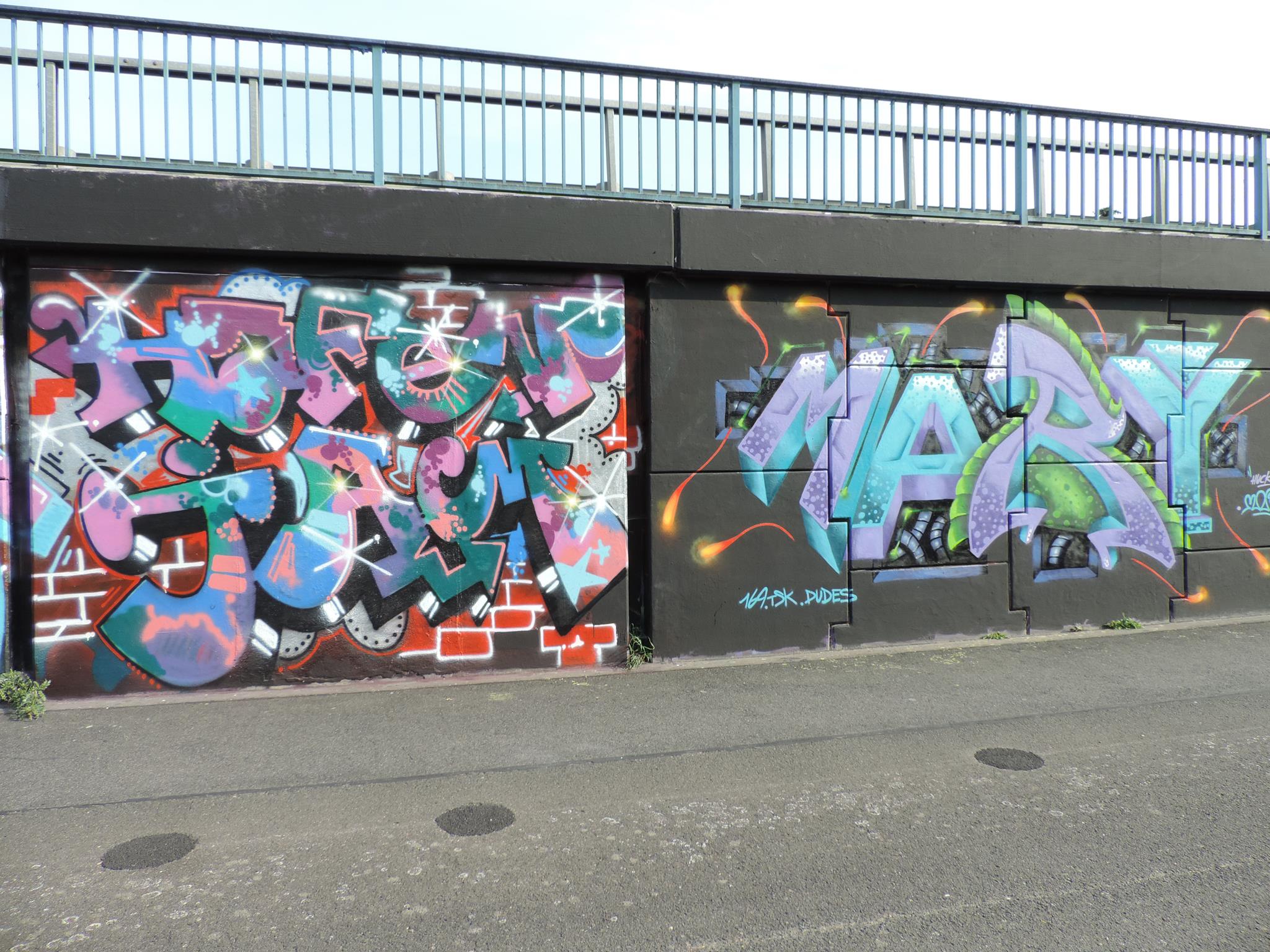 The graffiti on the left is from STEN ONE and the graffiti on the right was made by MARY