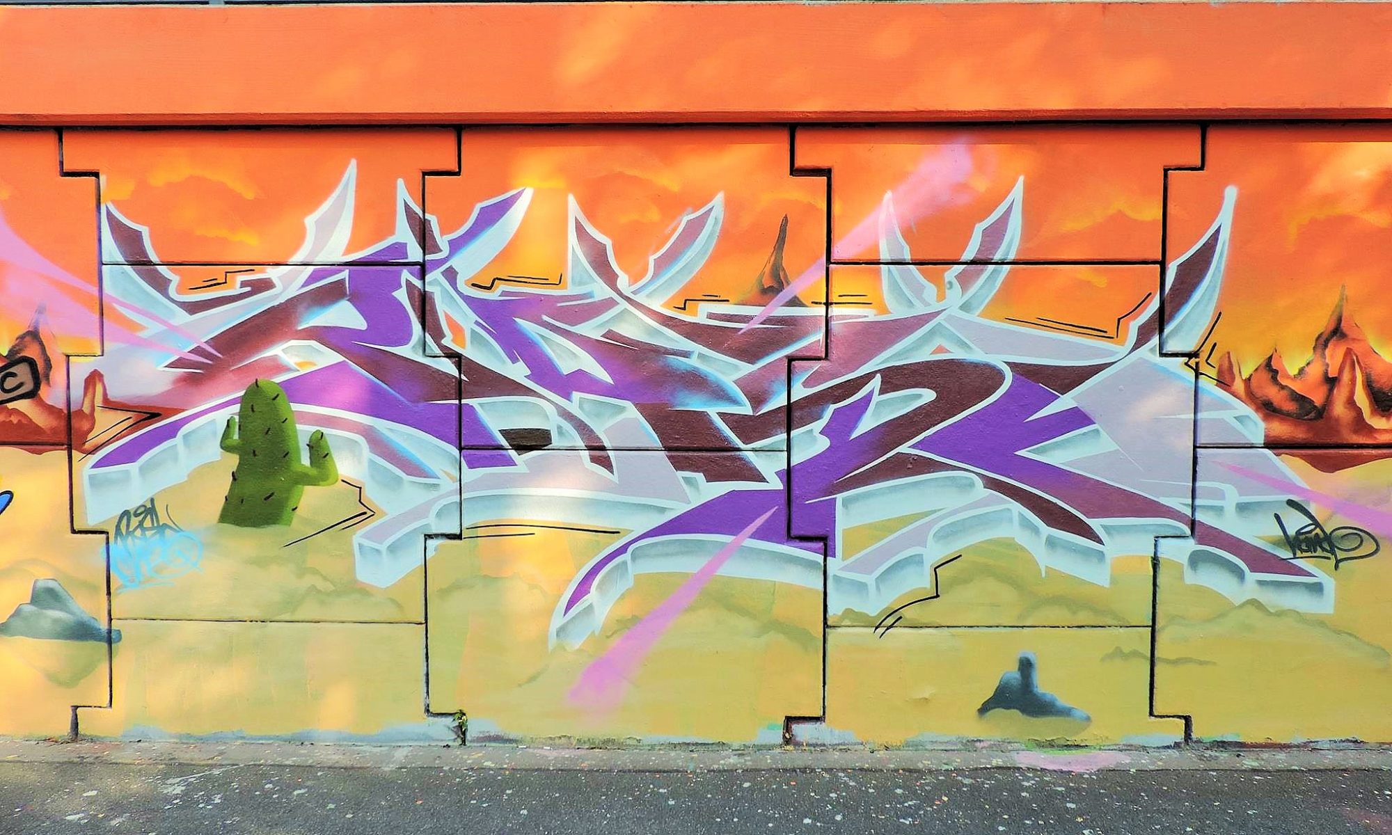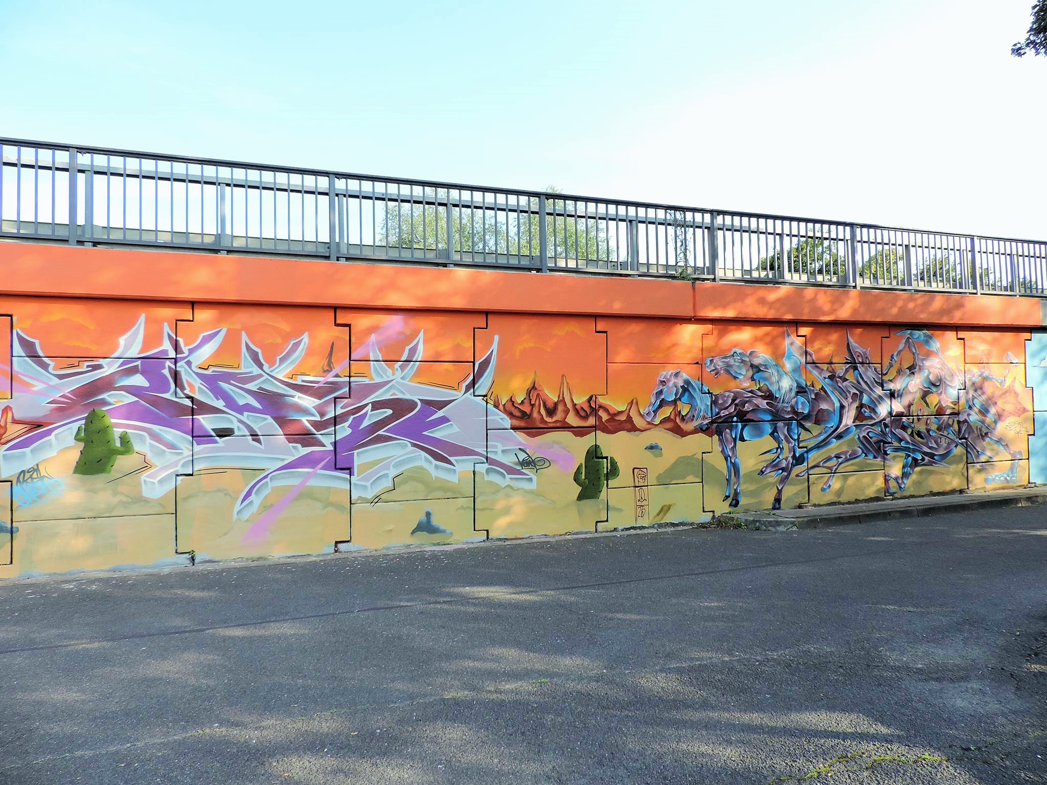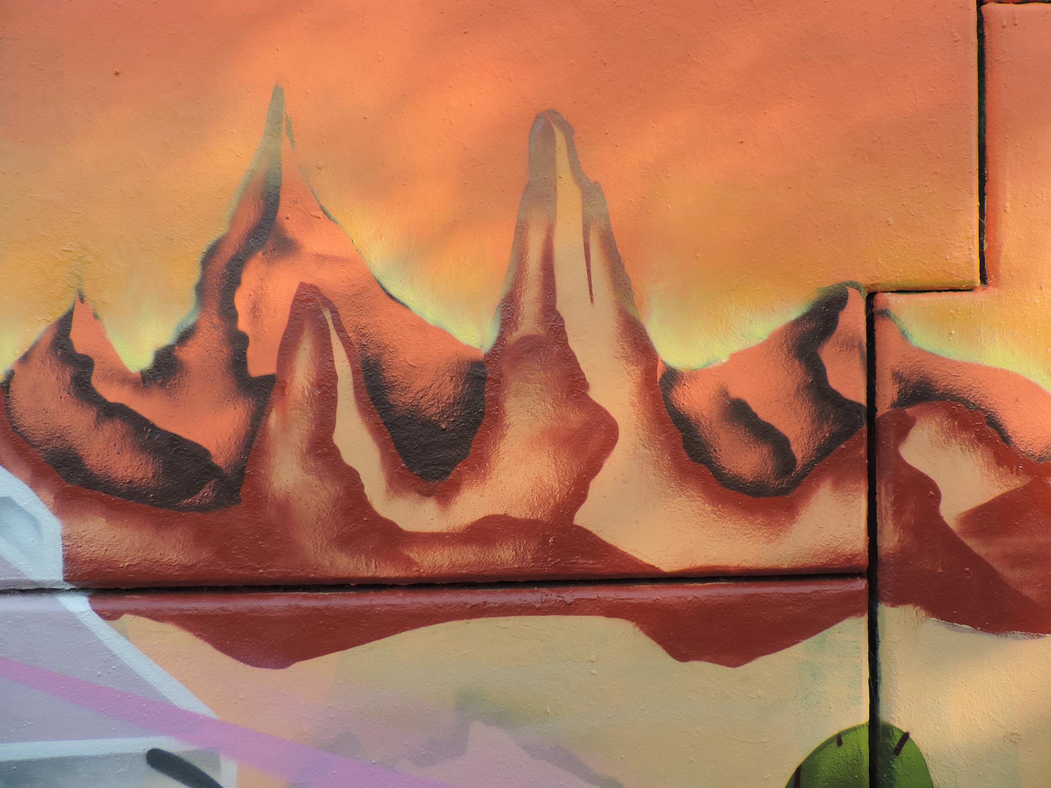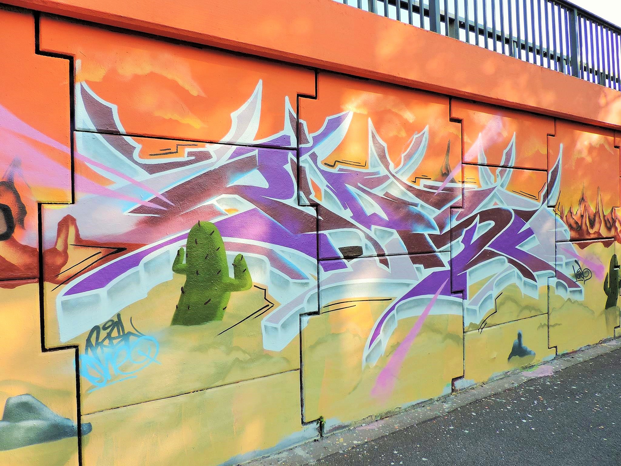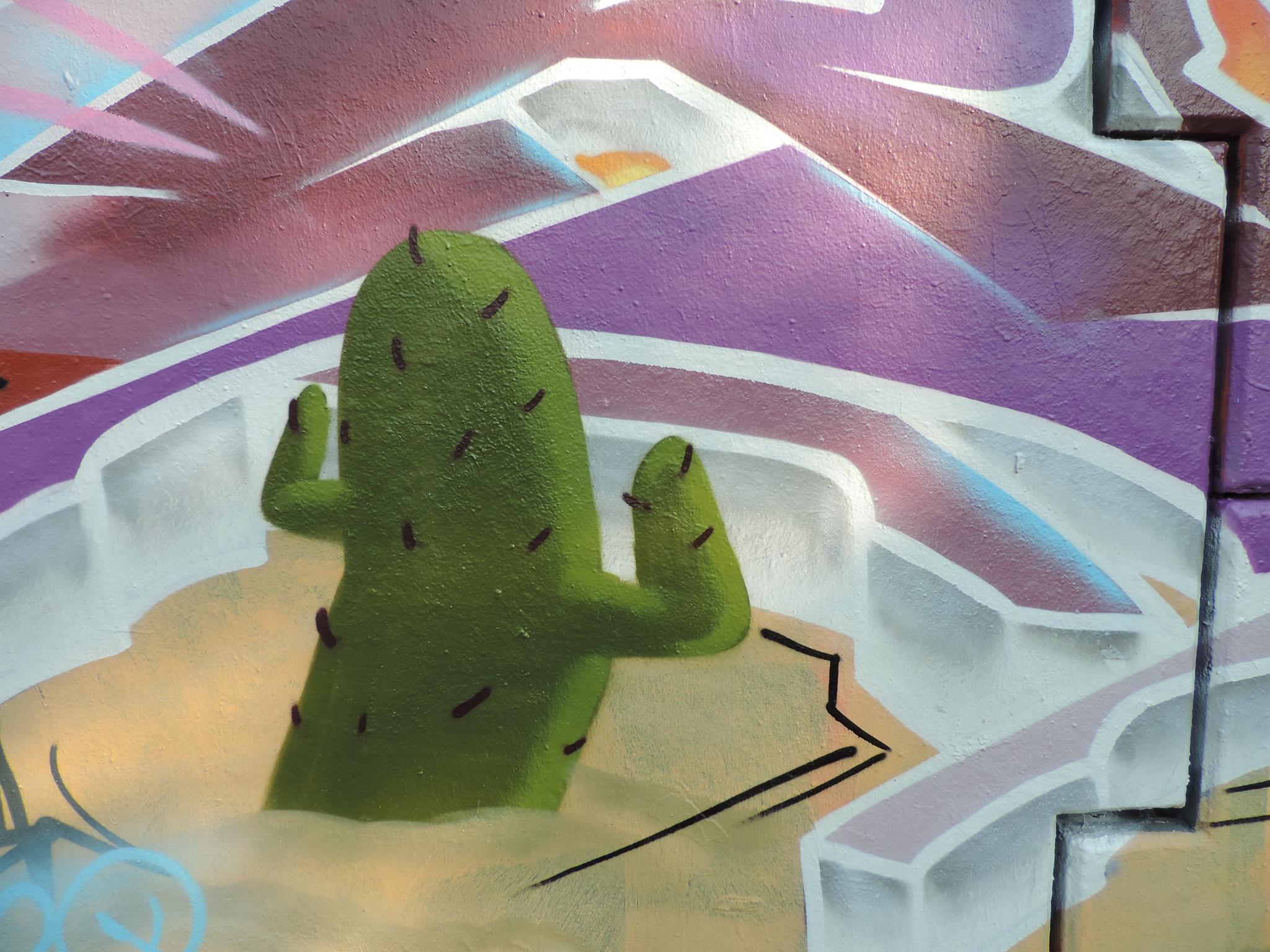 These artworks are part of the great Mexican Desert Concept Wall with various pieces along the river walkway. The artworks were created from left to right by RUNA, CHUCK, MIHAL, PRIMA, HARM, ILO, RASER, RIKO, WUDIE, RASH and PEACE