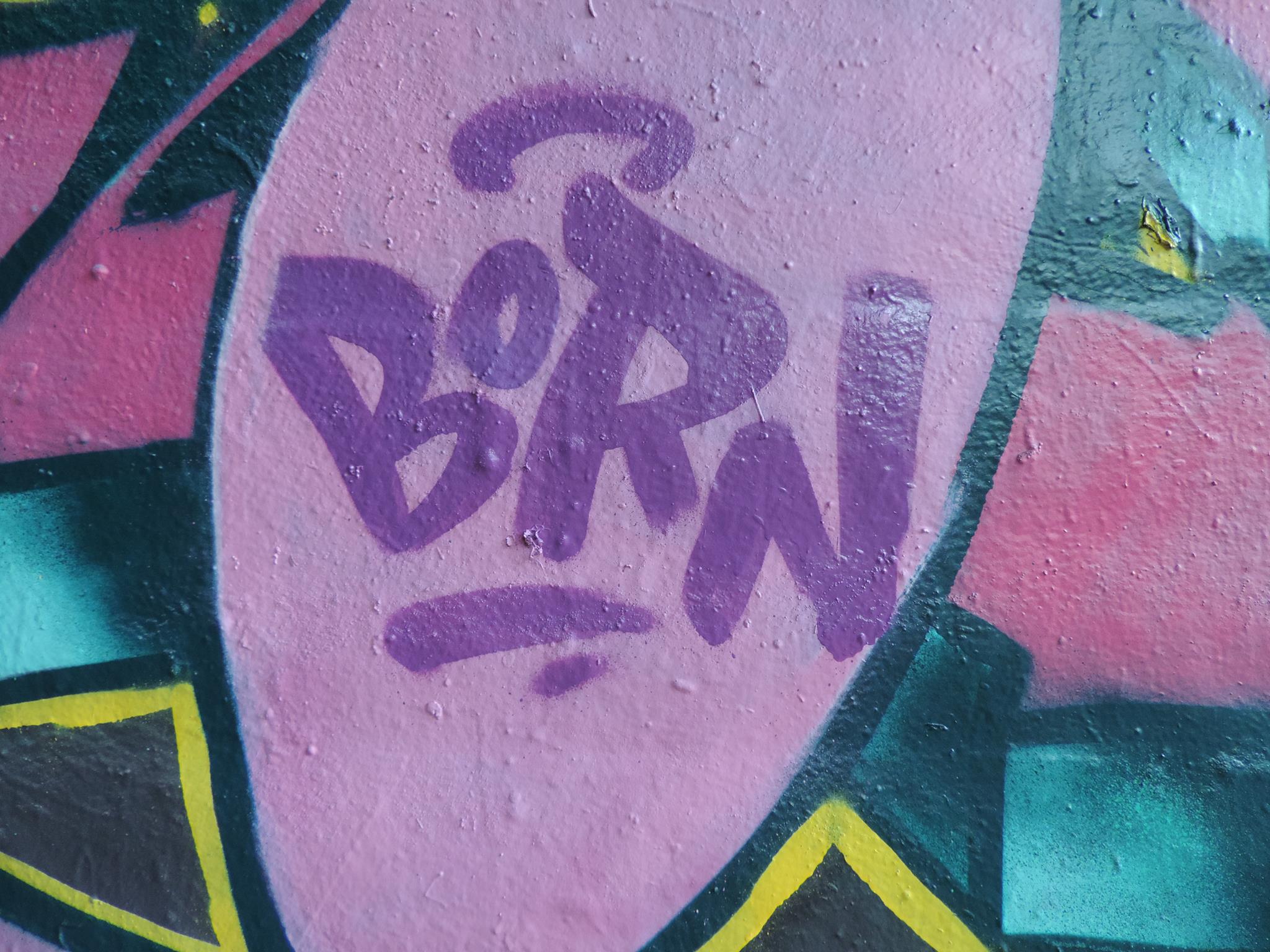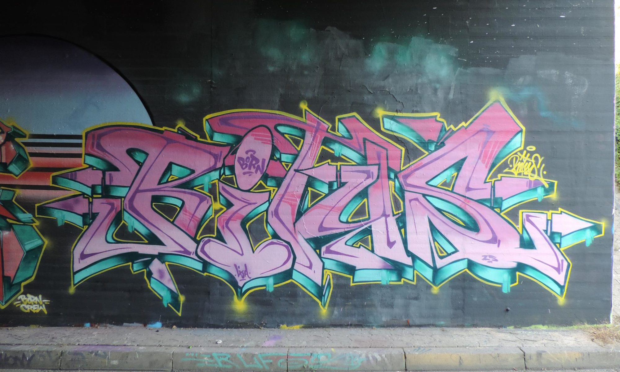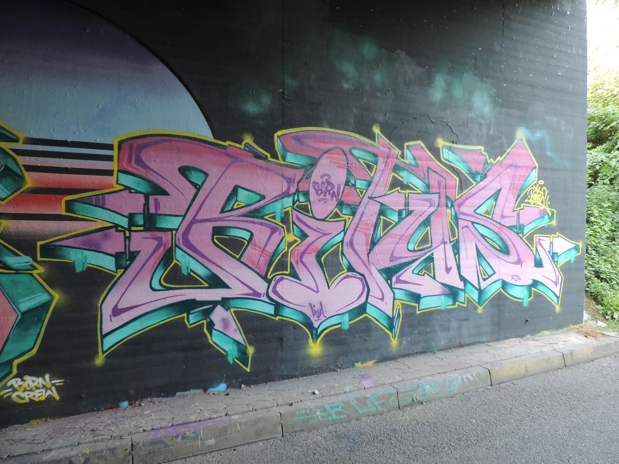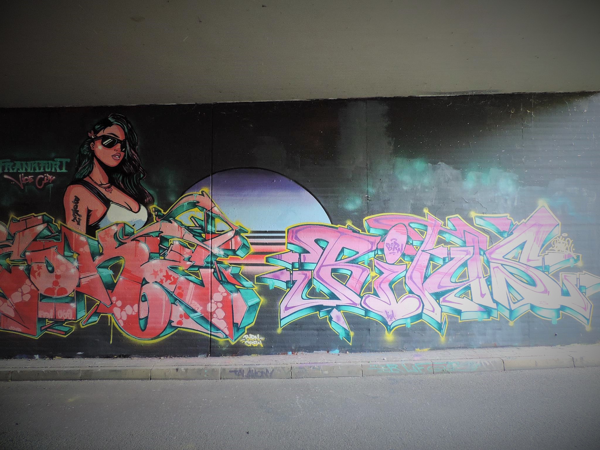 This great graffiti is part of a collaboration wall made by the fantastic BORN CREW. During the HAFEN JAM all six members were involved and they created the northern tunnel wall at the south west underpass with a concept named „Frankfurt Vice City“. Check out as well the graffiti by the other members of the crew, they were made from left to right by BASR, EASY, WISE, NEIN, COKE and RITUS.
