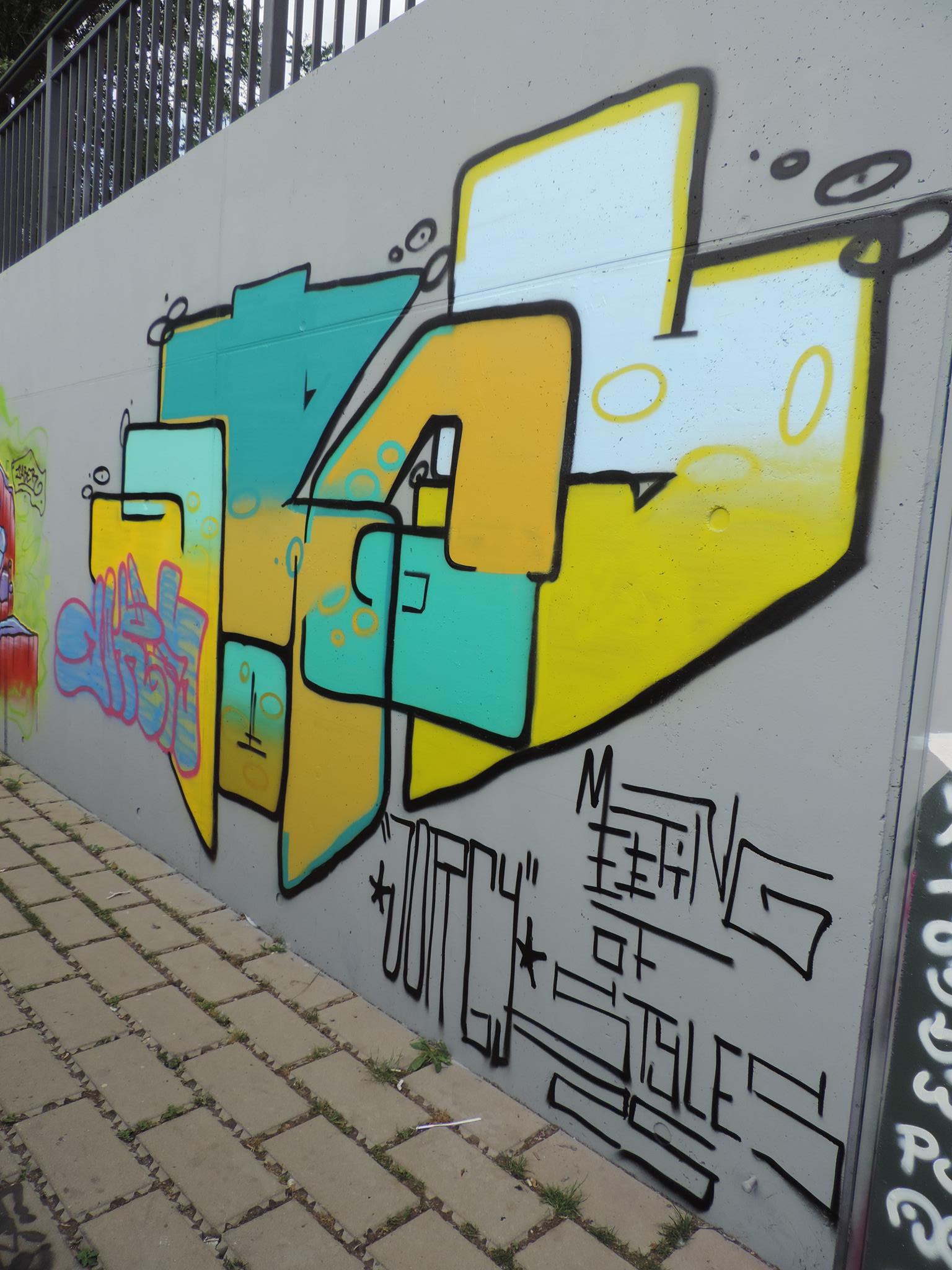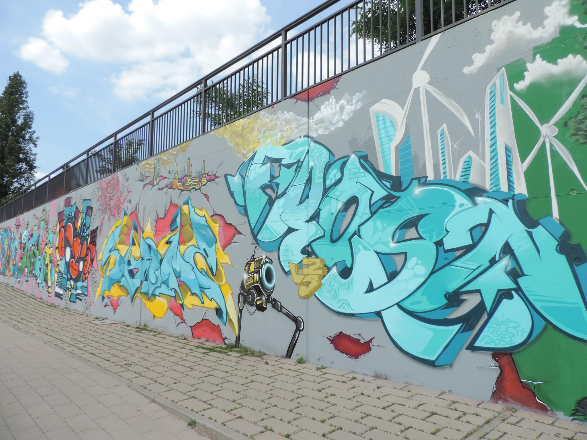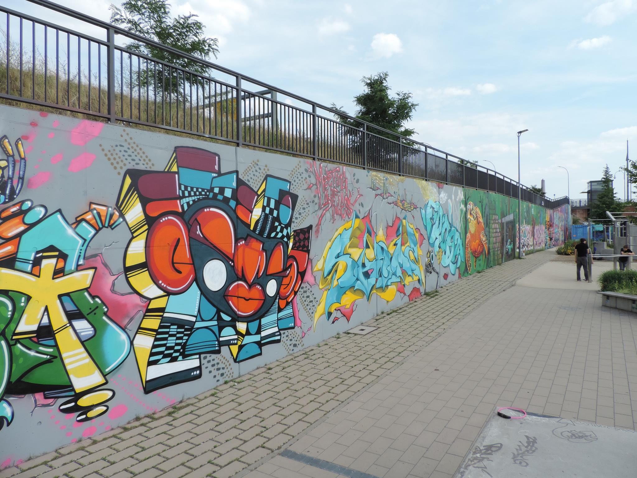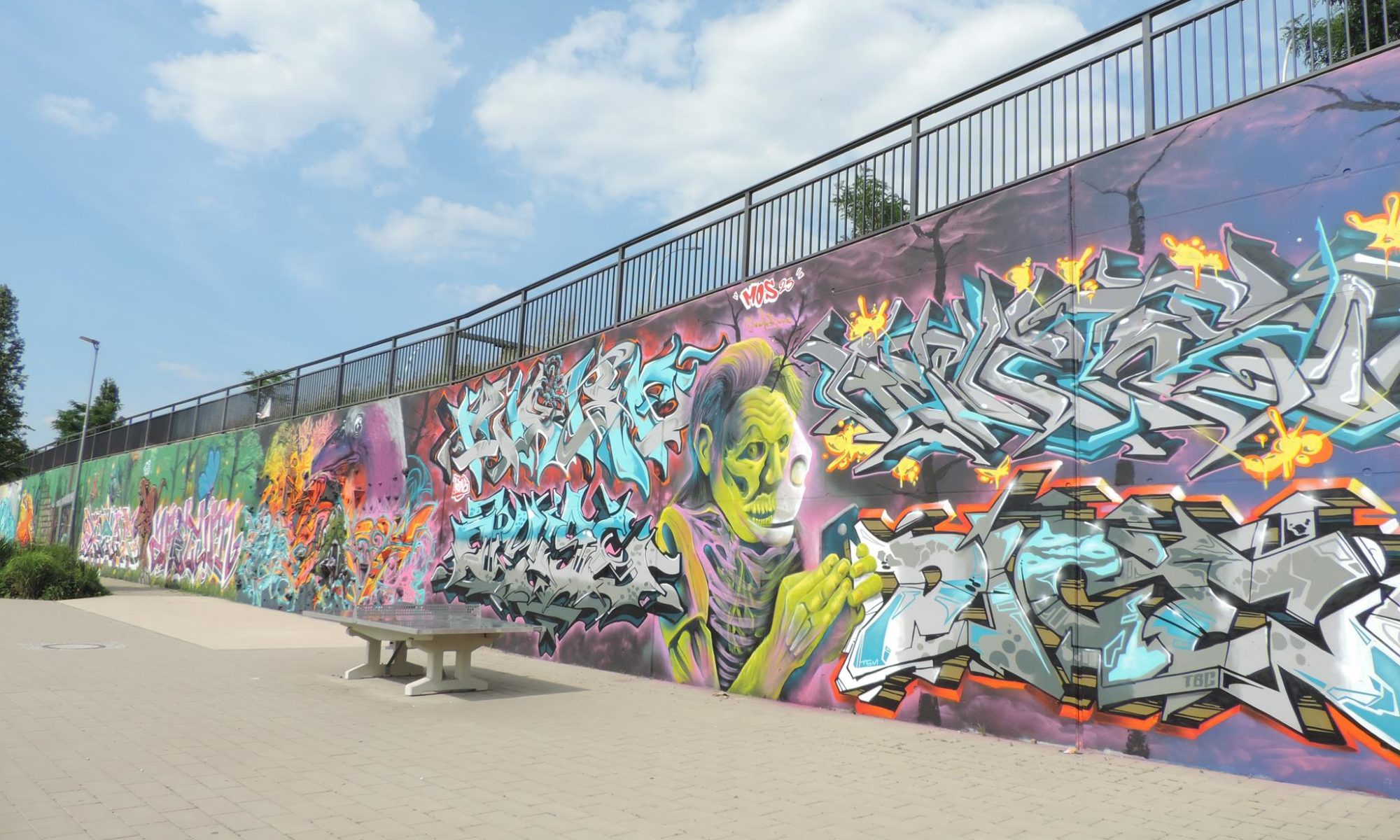 This page is about the wall along the west side railway embankment and at the skate park. It connects directly to the main spots and you can get there when you exit the tunnel towards the riverbank, just head to your right, which means northwest. For the festival, there are the masterpiece walls in the big tunnel, those are definitely awesome and on the highest facades. But the „longest“ wall is this spot here. Around the corner is one cool piece after the next. This area is a spray space since ages, but after it got redesigned by the city and fresh surfaces got installed, it is now also an official part of the MEETING OF STYLES. Awesome graffiti collaborations already got created here, as well great urban art besides the event. Check out the history, here are the photos only from this spot sorted chronologicaly.