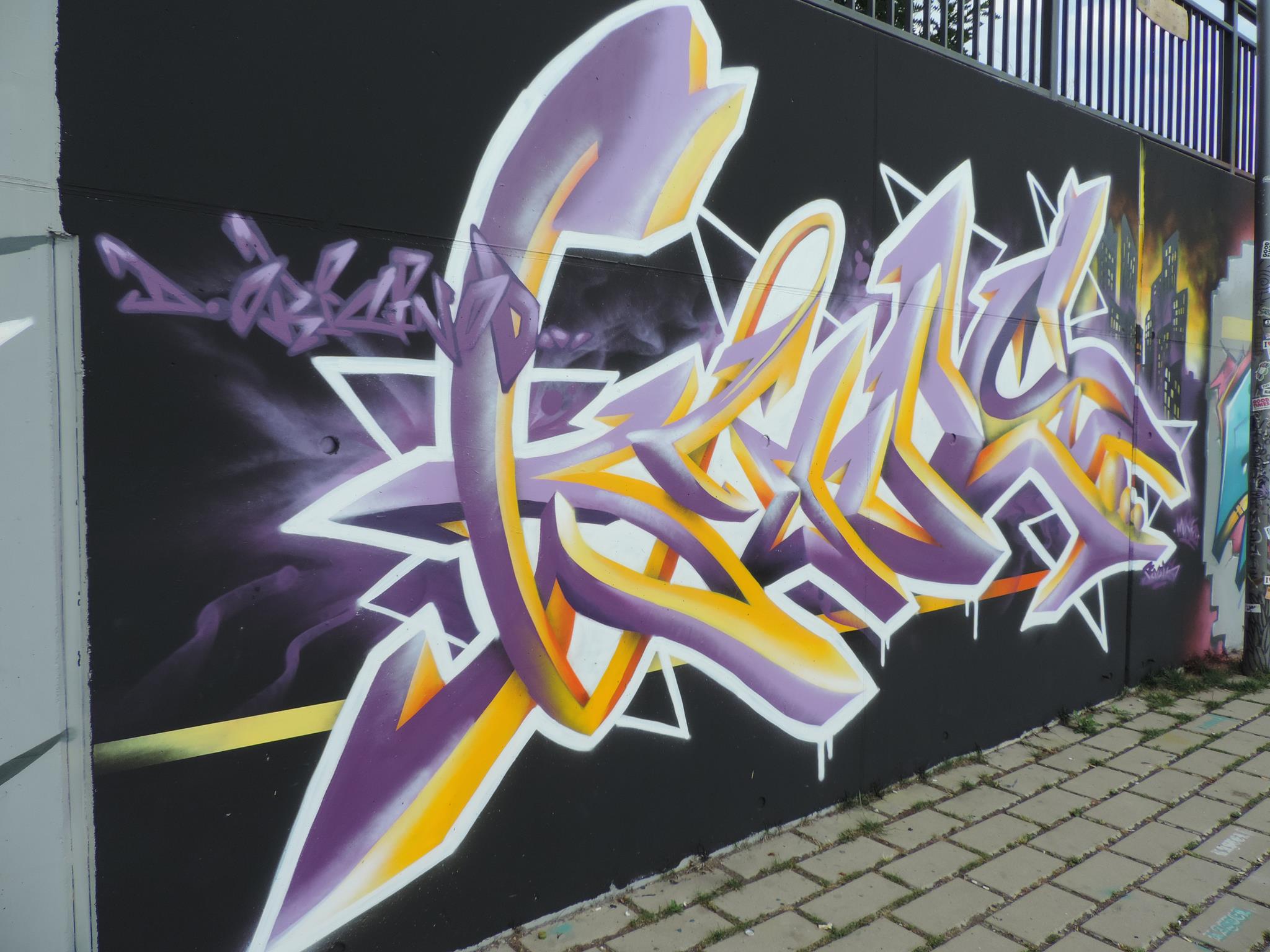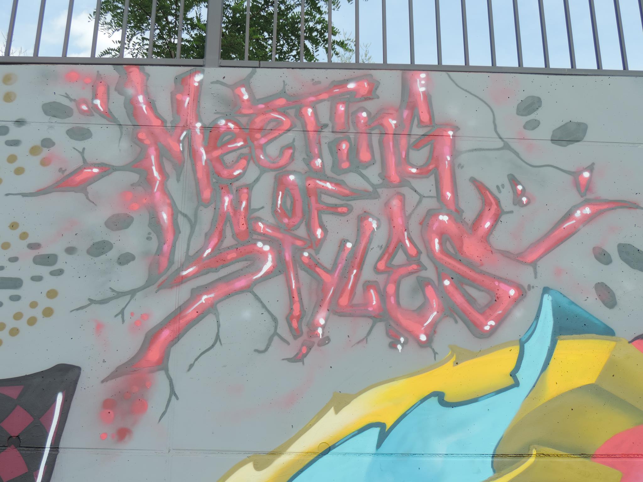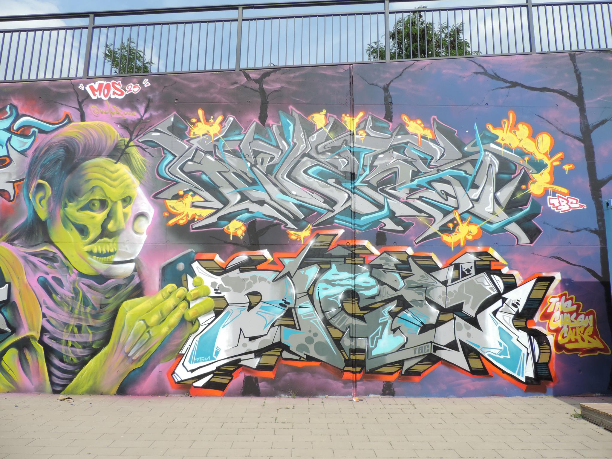 This page is about the wall along the west side railway embankment and at the skate park. It connects directly to the main spots and you can get there when you exit the tunnel towards the riverbank, just head to your right, which means northwest. For the festival, there are the masterpiece walls in the big tunnel, those are definitely awesome and on the highest facades. But the „longest“ wall is this spot here. Around the corner is one cool piece after the next. This area is a spray space since ages, but after it got redesigned by the city and fresh surfaces got installed, it is now also an official part of the MEETING OF STYLES. Awesome graffiti collaborations already got created here, as well great urban art besides the event. Check out the history, here are the photos only from this spot sorted chronologicaly.