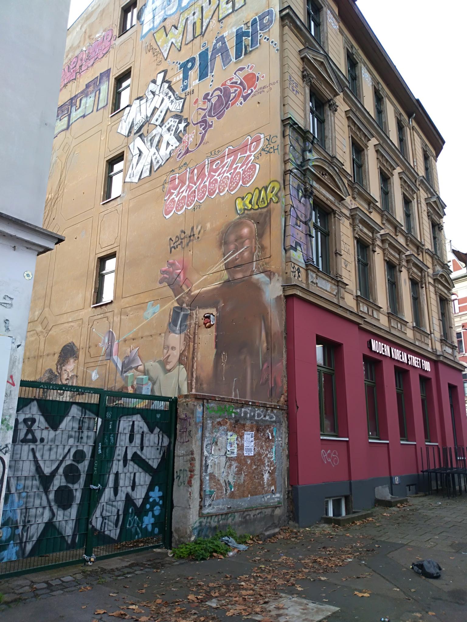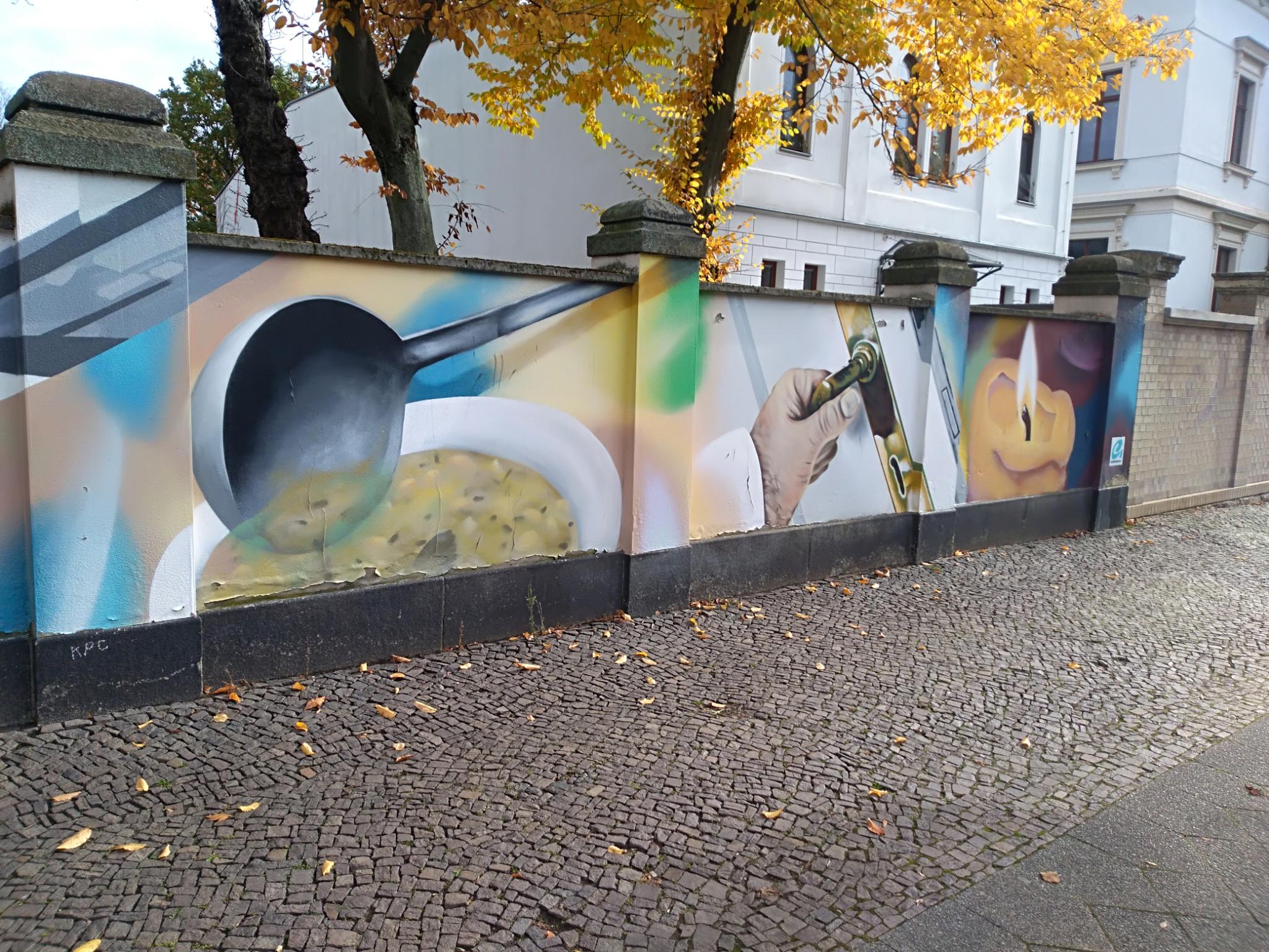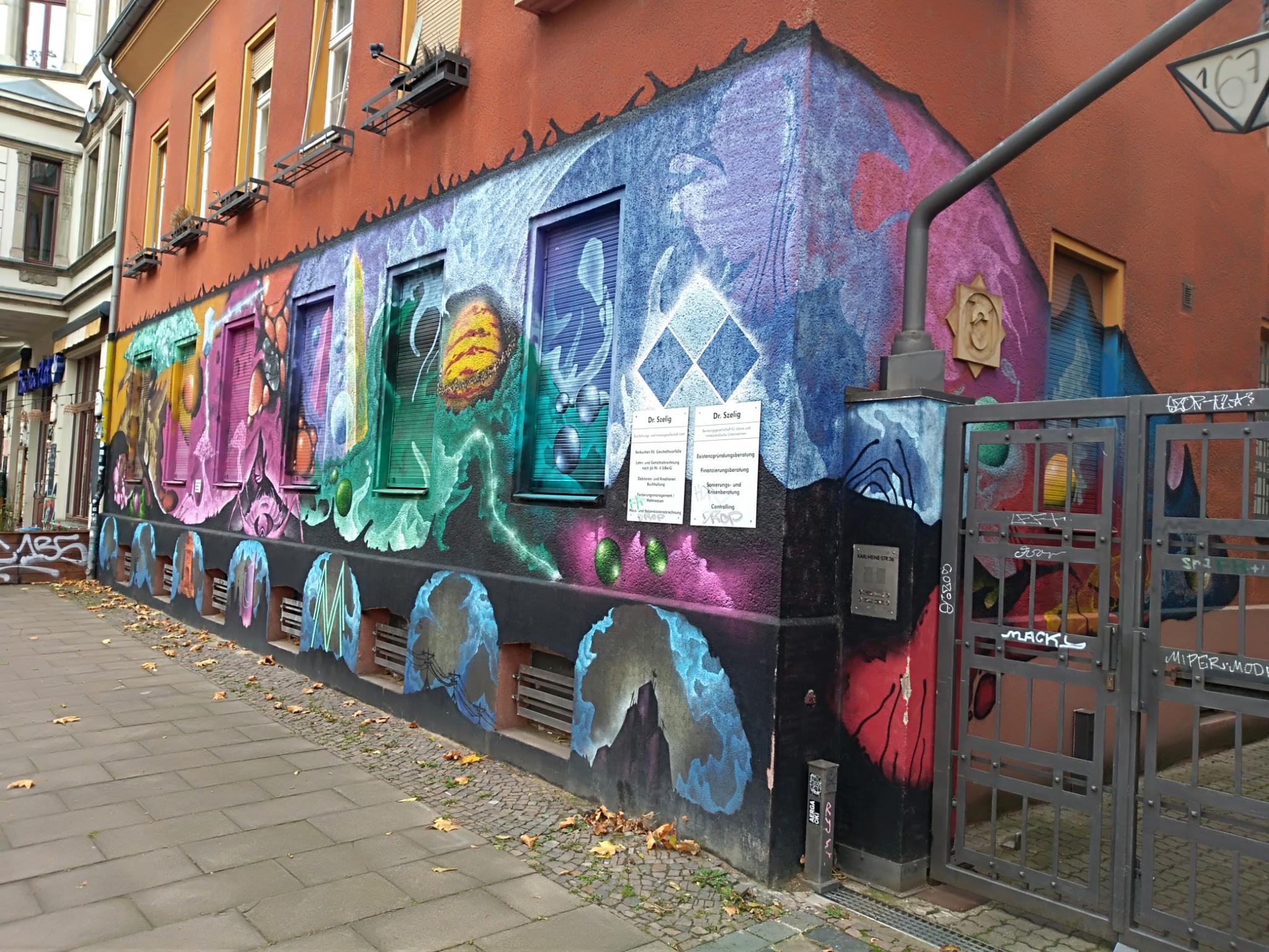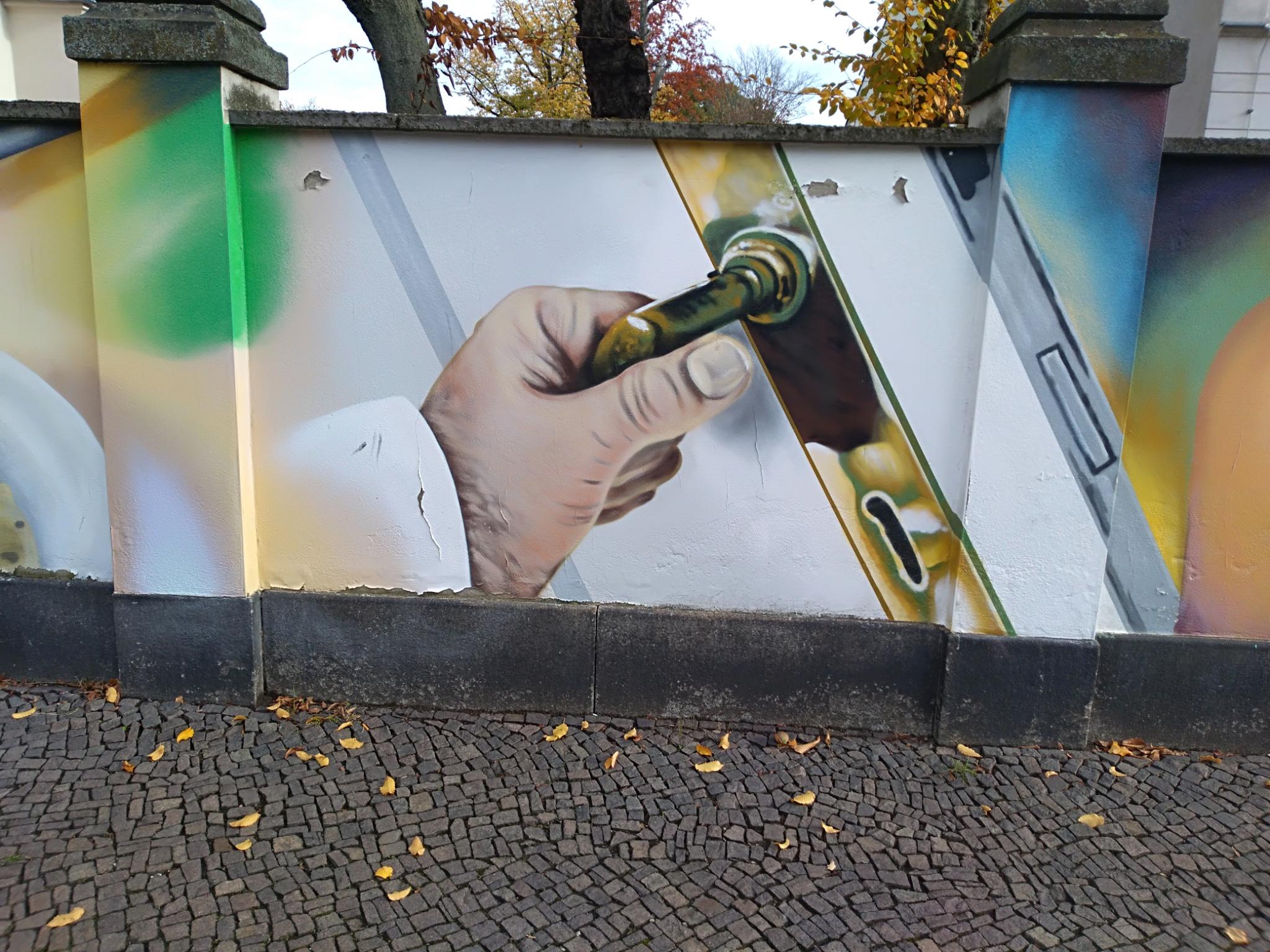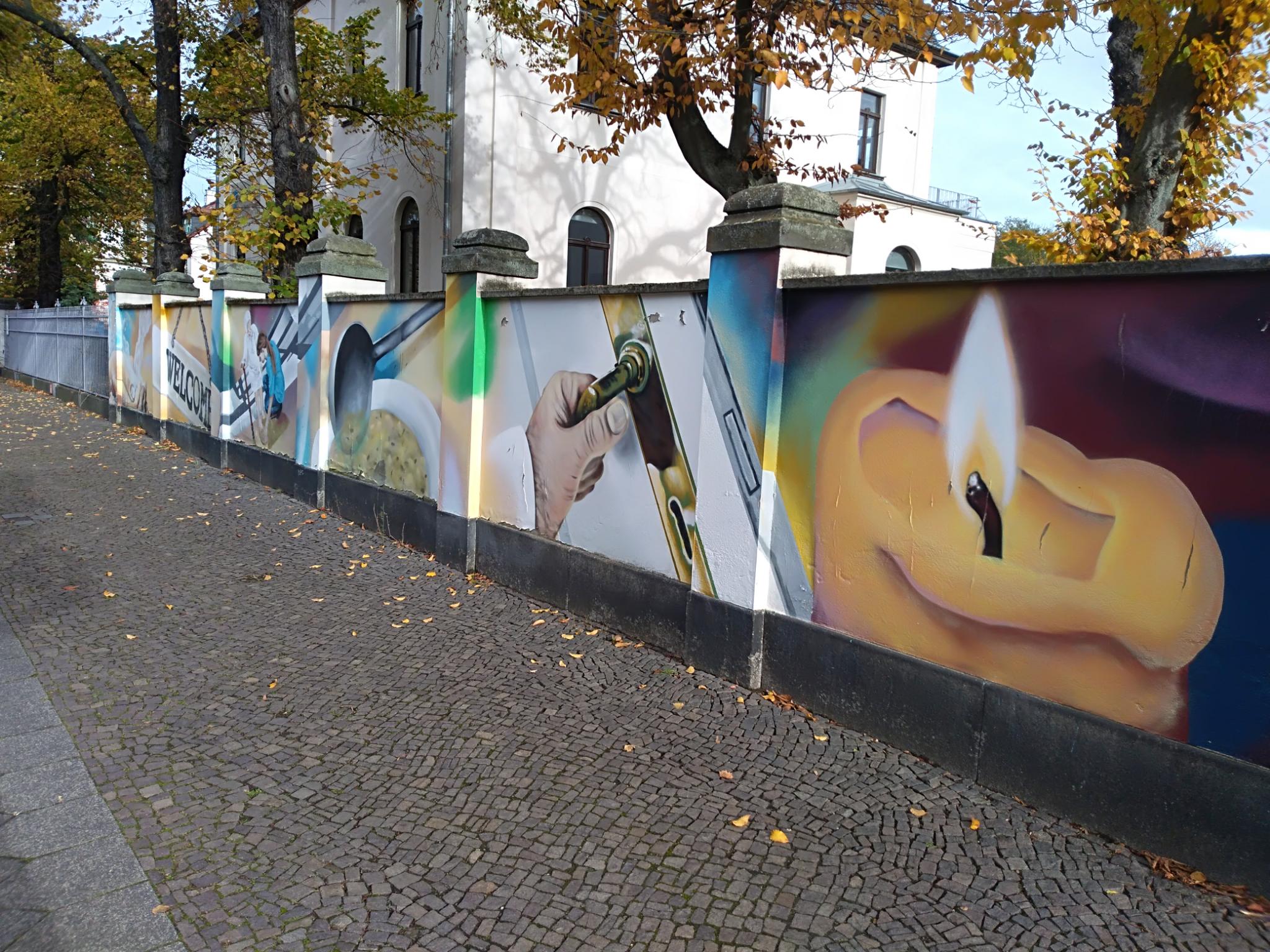 The approximately 3000 m² large and detailed mural was created by the artist MICHAEL FISCHER aka FISCHER ART in 2009 on a facade of several house walls in the street Brühl. It was made on the occasion of the 20th anniversary of the peaceful revolution in the GDR.