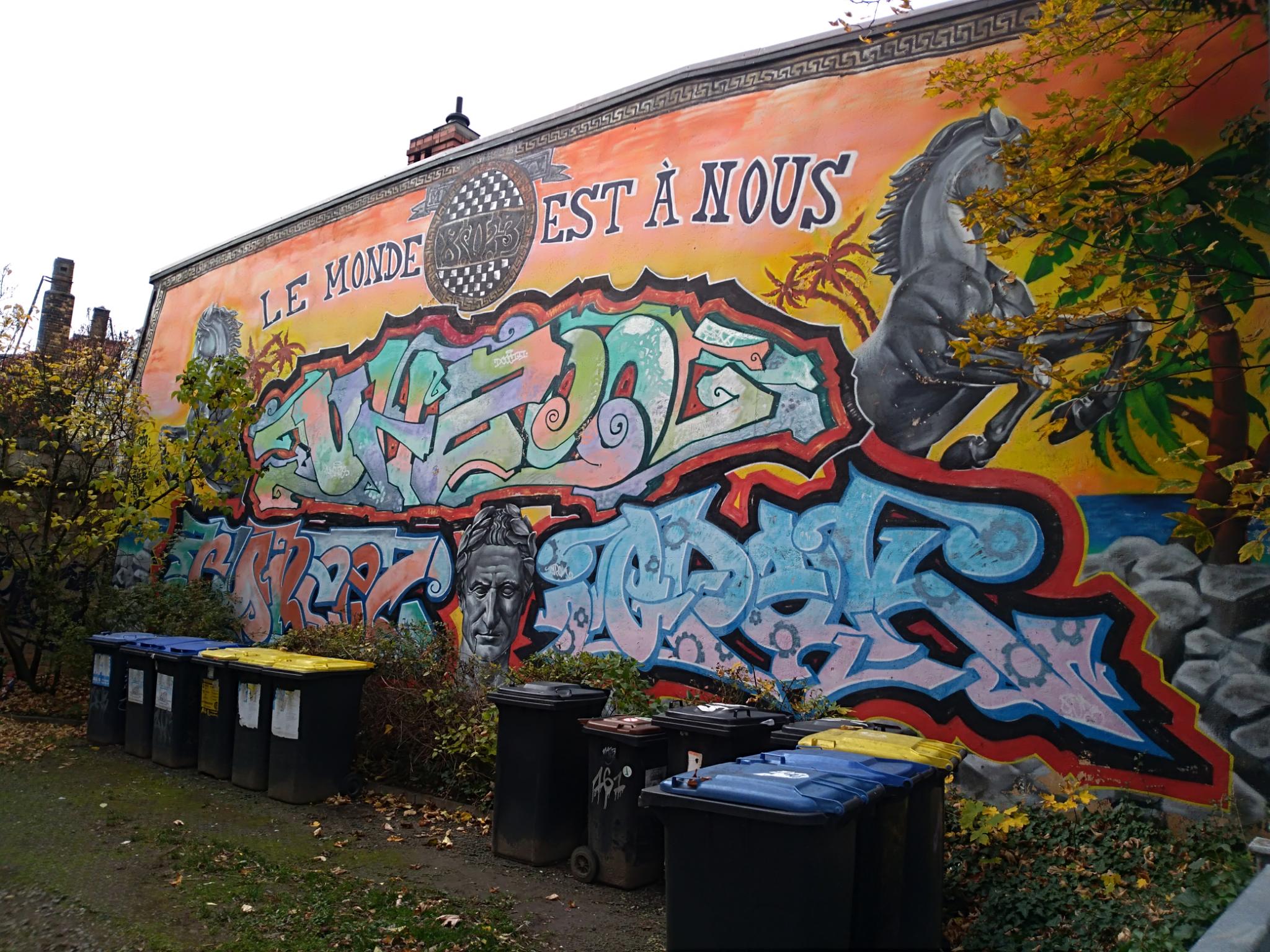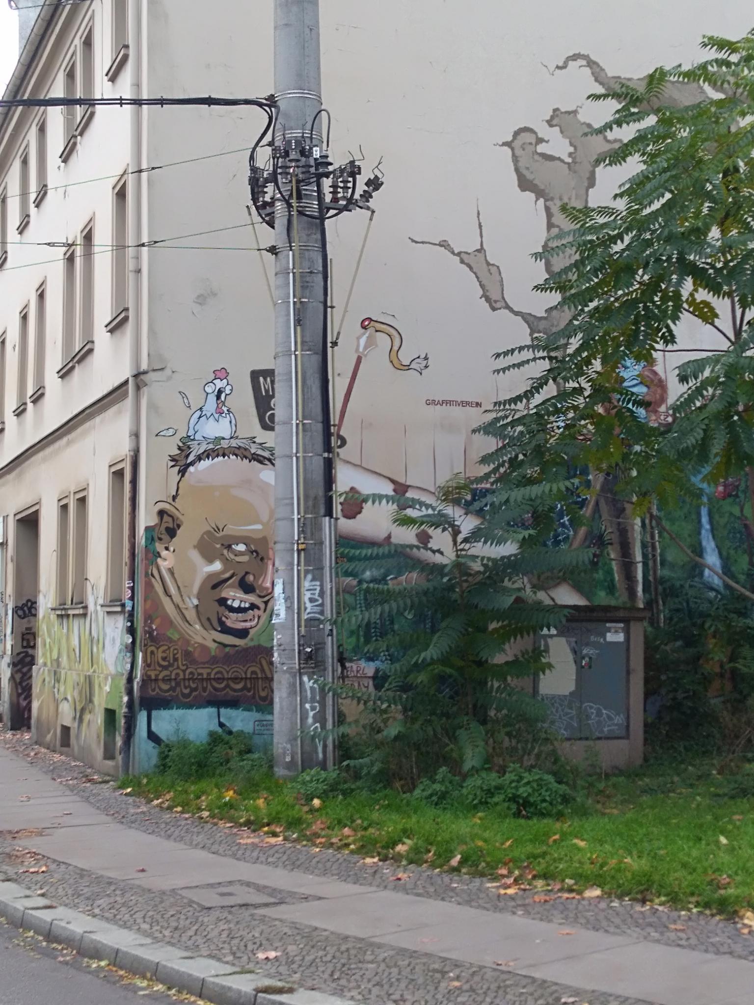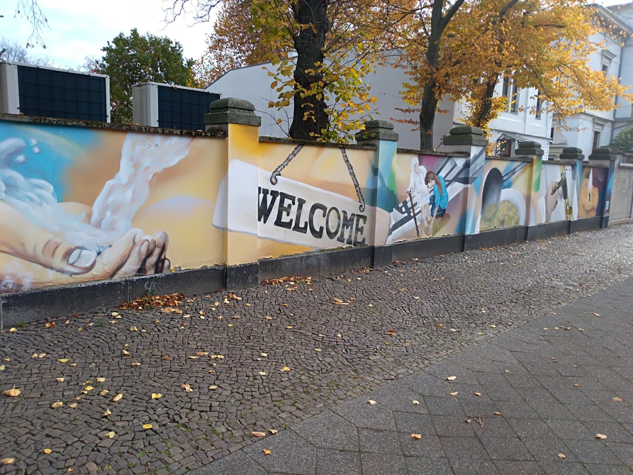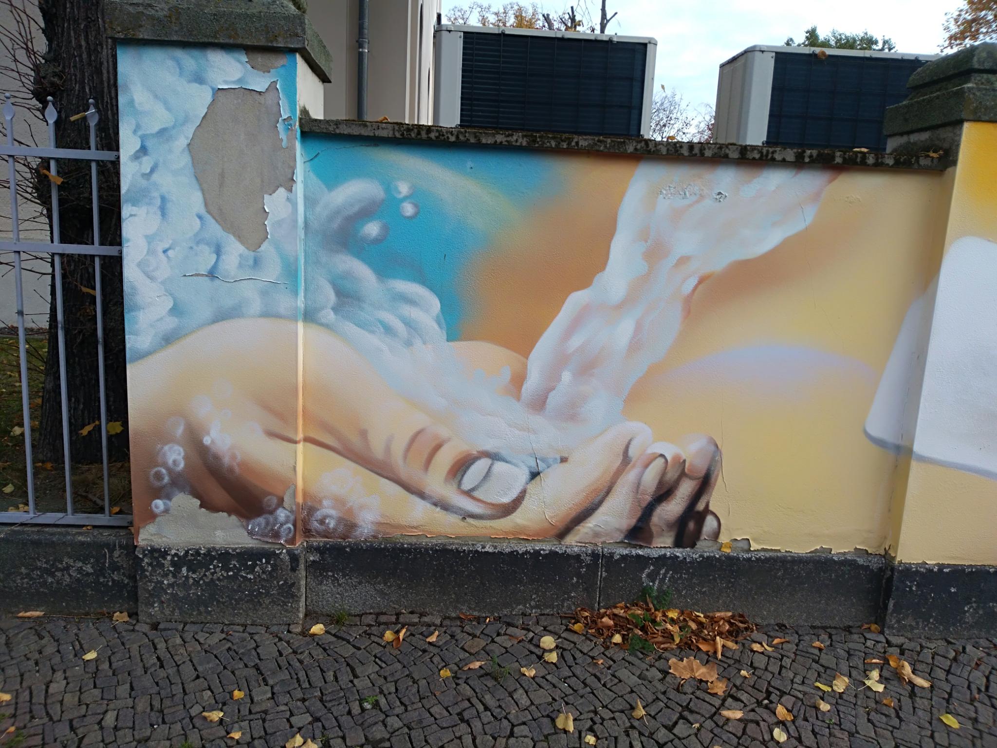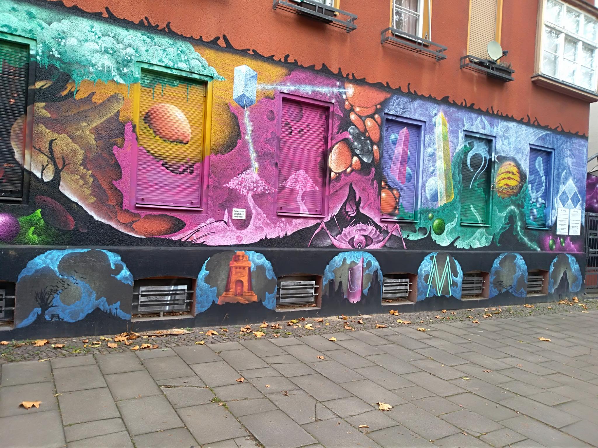 The approximately 3000 m² large and detailed mural was created by the artist MICHAEL FISCHER aka FISCHER ART in 2009 on a facade of several house walls in the street Brühl. It was made on the occasion of the 20th anniversary of the peaceful revolution in the GDR.