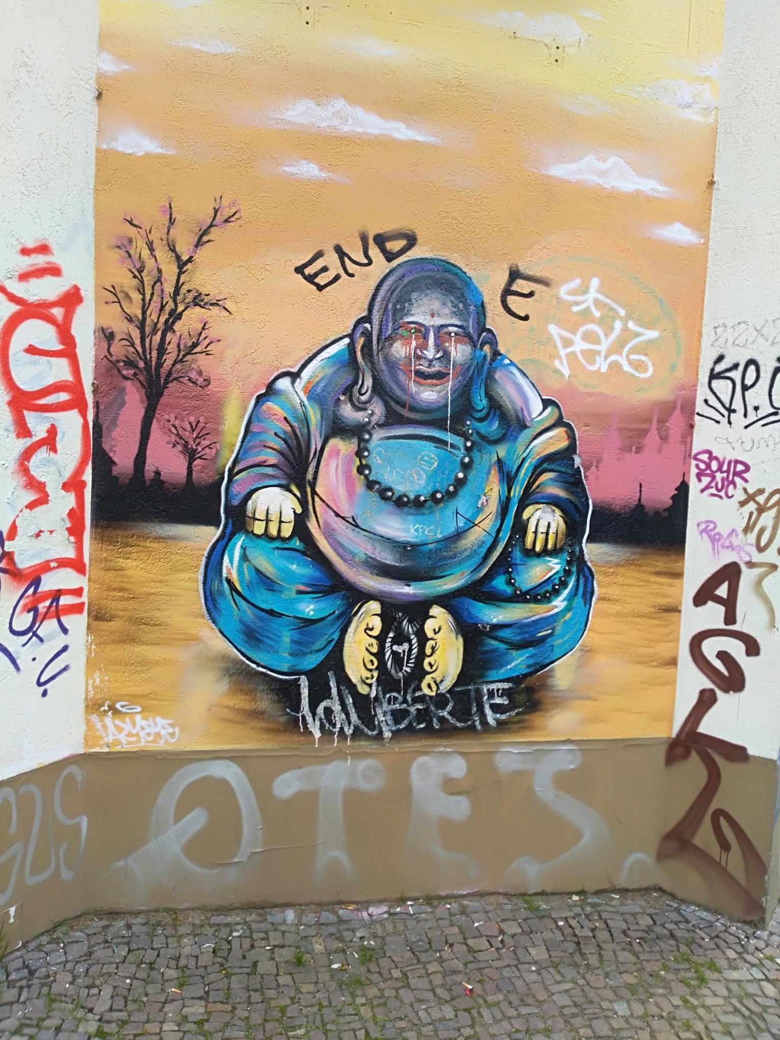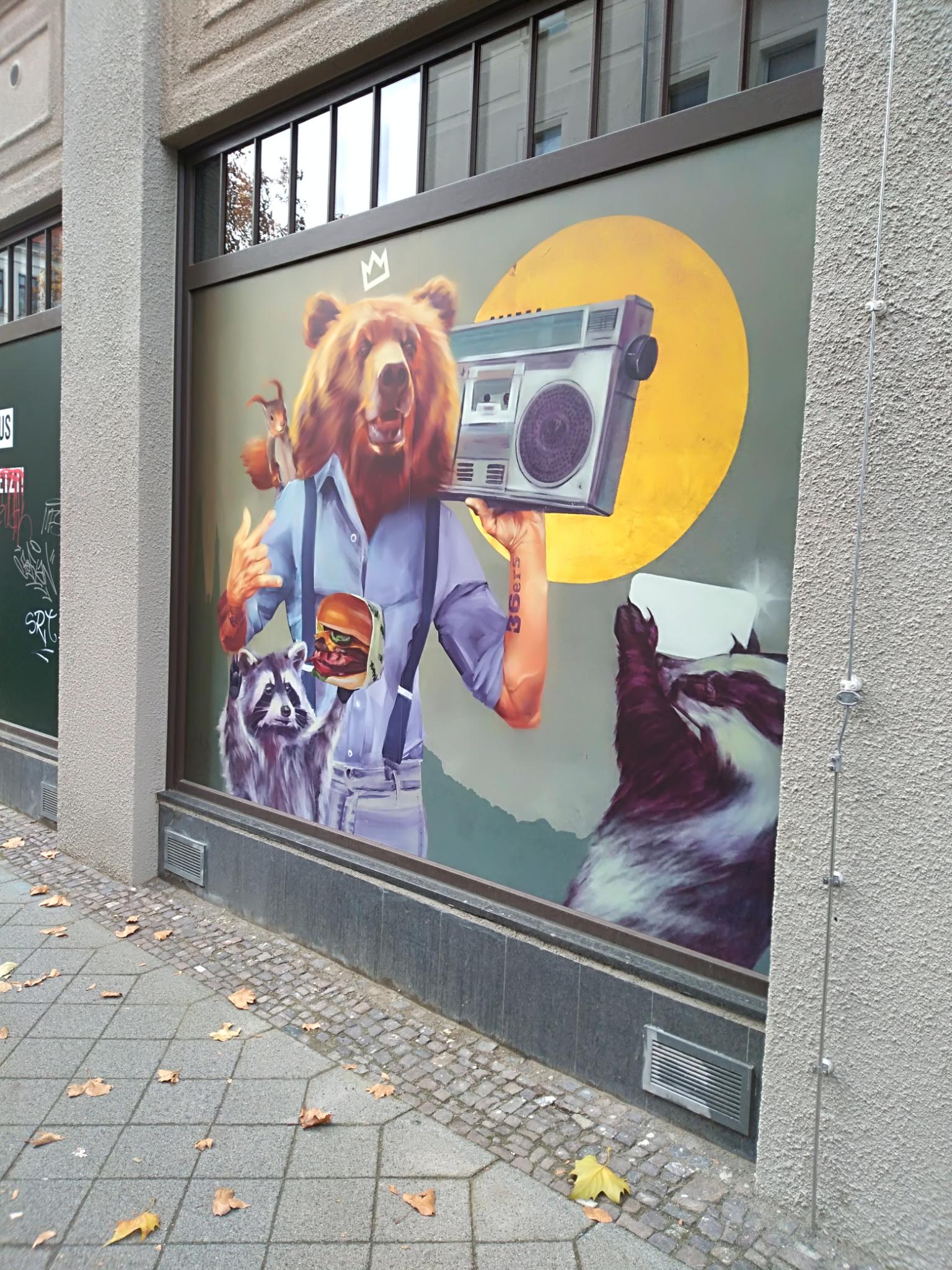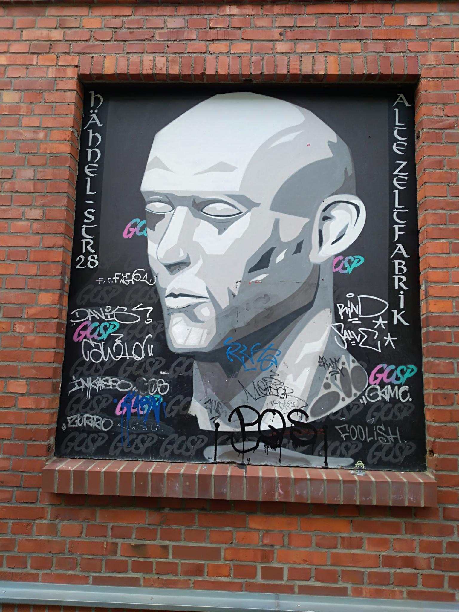 MICHAEL FISCHER ART made an apprenticeship as a bricklayer and painter, worked as a janitor and nurse in psychiatry, graduated from high school after the fall of the Wall and studied from 1992 to 1997 at the Academy of Visual Arts in Leipzig. The artist works with very strong colors on large surfaces, uses simple structures and draws partly comic-like figures, but also, for example, realistic portraits. He is known for his socially critical themes and his large-scale paintings of buildings. He forms his sculptures from iron, or also designs them from scrap metal such as old cars or even old tanks. Internationally, he has artistically designed well over 100 buildings and is constantly seeking new challenges. – Fischer Art